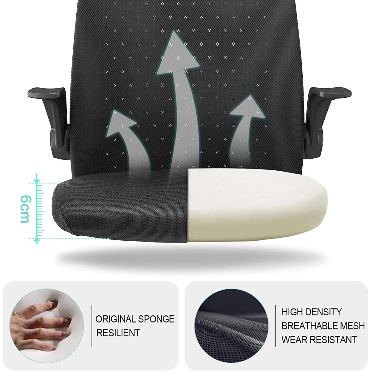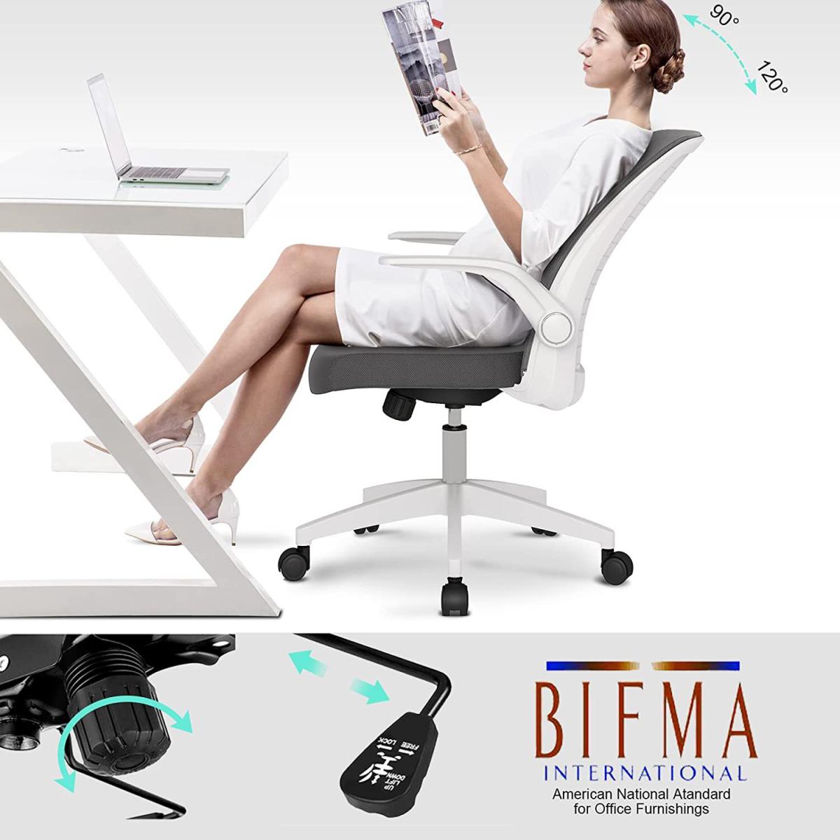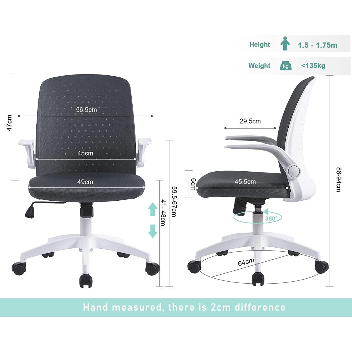 With the help of the 90degree folding armrest, you can push the chair under your desk. An ideal choice for small room. Adjustable seat height 41-48cm (Tips: 30cm is a comfortable height difference between desktop and chair seat). Both seat and steel gas lift have undergone 100000+ times of testing to ensure stability and passed SGS & BIFMA certification(the voice of the commercial furniture industry).360 degree swivel nylon wheel runs smooth, quiet, and scratch-free. Suitable for ceramic tile floor, wooden floor, PVC floor, carpets etc. Best suited for people 150-175cm/4.92-5.74ft with a maximum load of 136kg/300 pounds. The Seat is padded with 6cm thick original foam, not easy to go flat. High-density mesh back and seat cover keeps your back cool from sultry. Moreover, the arc back lines up with the human body curve, pushing up and supporting your back. Tilts at 90- 120 degrees provide an excellent seating experience during work and entertainment. The simple mesh chair adapts ideally to living rooms, bedrooms, study and office. Feel free to contact us for any quality issues.