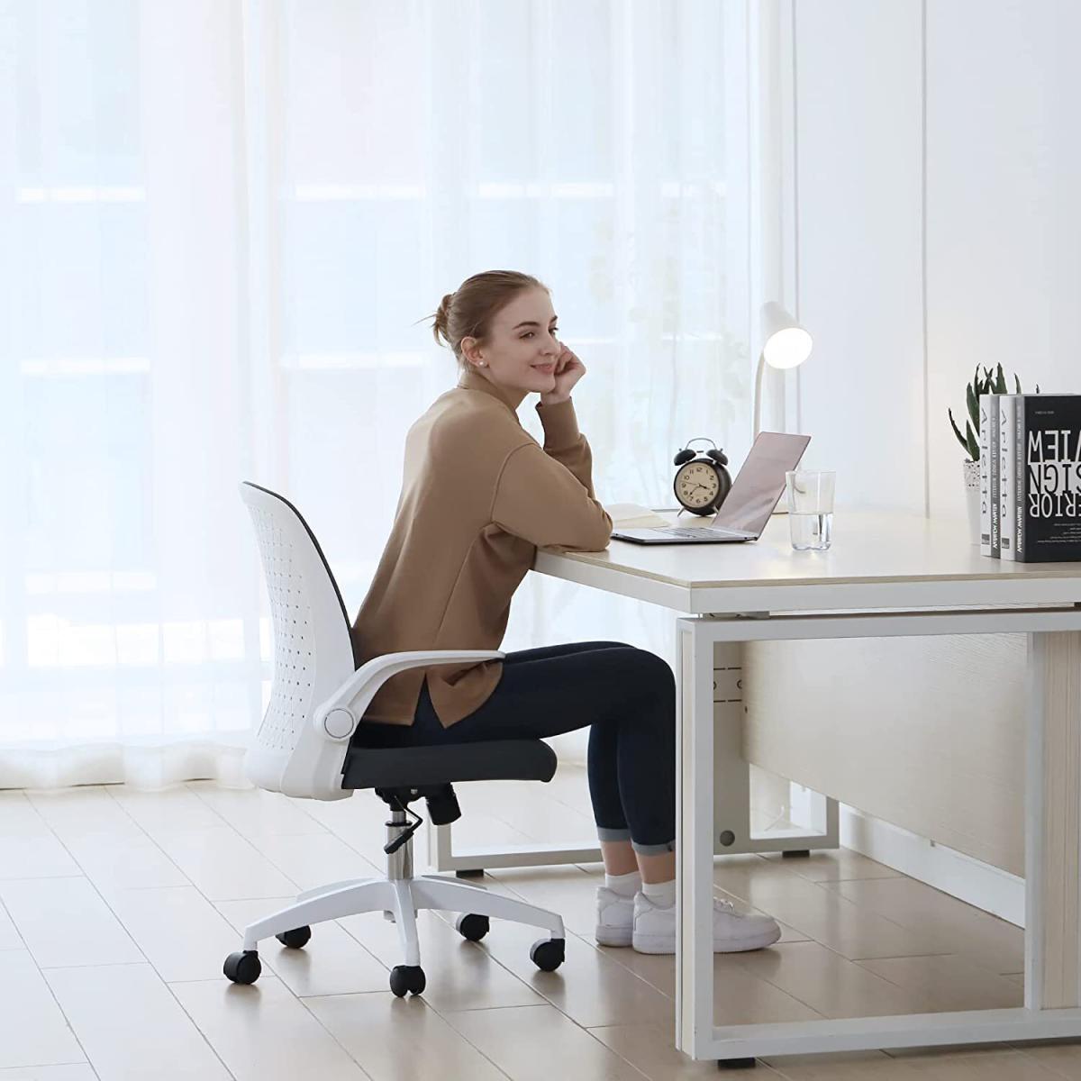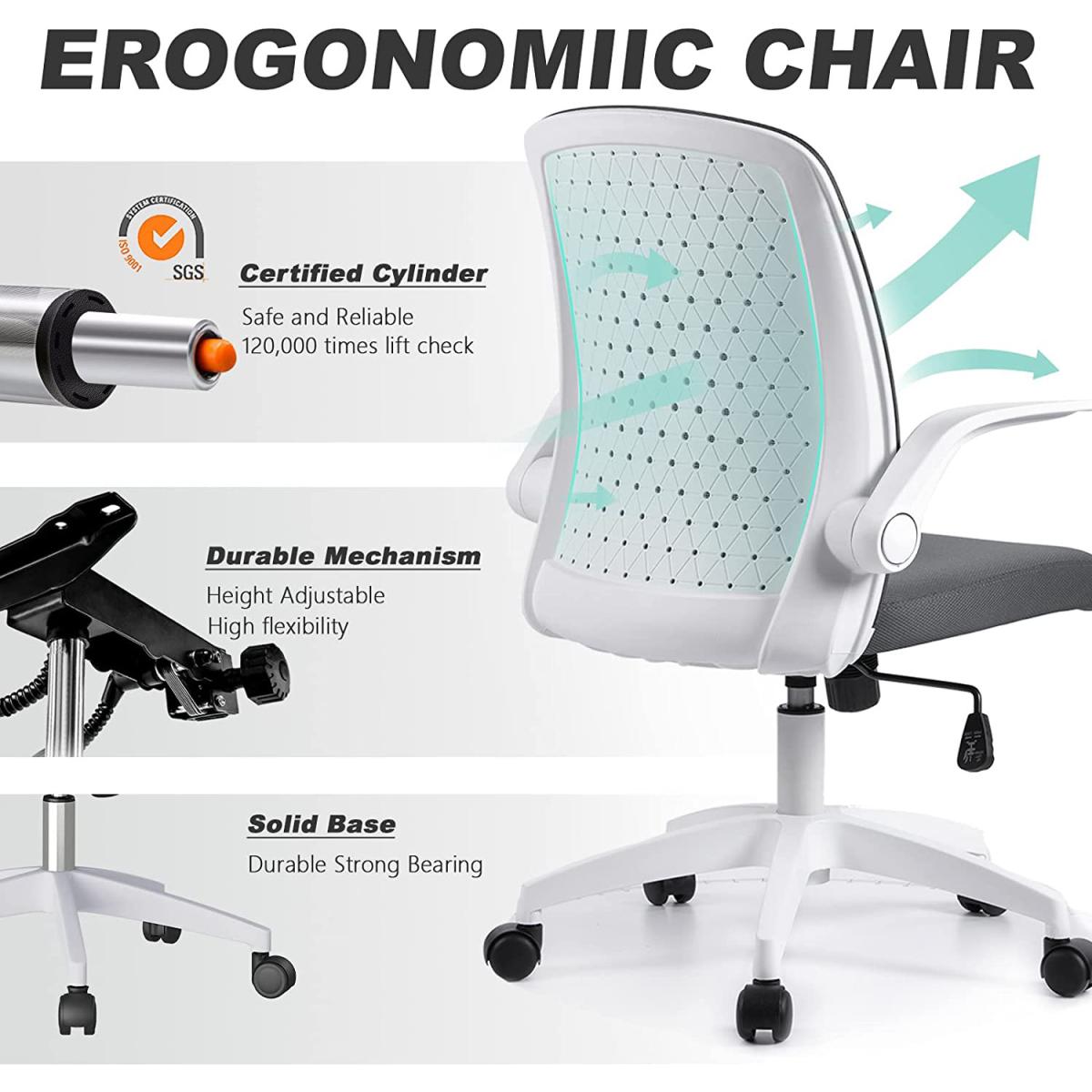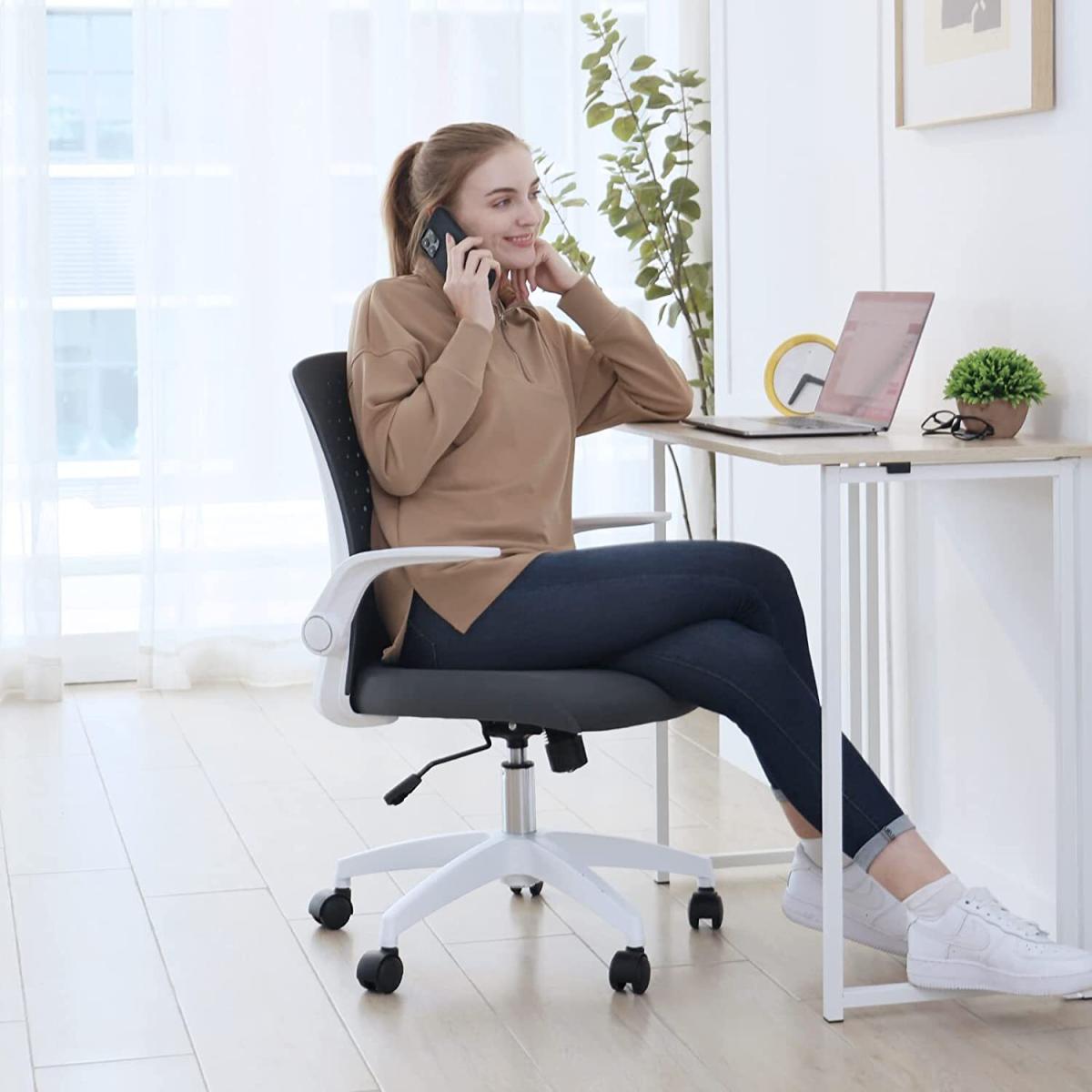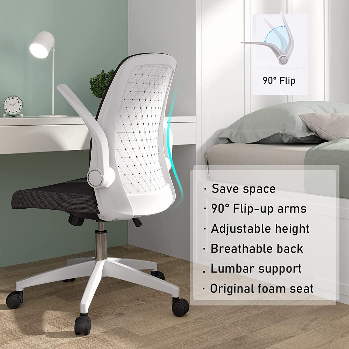 With the help of the 90degree folding armrest, you can push the chair under your desk. An ideal choice for small room. Adjustable seat height 41-48cm (Tips: 30cm is a comfortable height difference between desktop and chair seat). Both seat and steel gas lift have undergone 100000+ times of testing to ensure stability and passed SGS & BIFMA certification(the voice of the commercial furniture industry).360 degree swivel nylon wheel runs smooth, quiet, and scratch-free. Suitable for ceramic tile floor, wooden floor, PVC floor, carpets etc. Best suited for people 150-175cm/4.92-5.74ft with a maximum load of 136kg/300 pounds. The Seat is padded with 6cm thick original foam, not easy to go flat. High-density mesh back and seat cover keeps your back cool from sultry. Moreover, the arc back lines up with the human body curve, pushing up and supporting your back. Tilts at 90- 120 degrees provide an excellent seating experience during work and entertainment. The simple mesh chair adapts ideally to living rooms, bedrooms, study and office. Feel free to contact us for any quality issues.