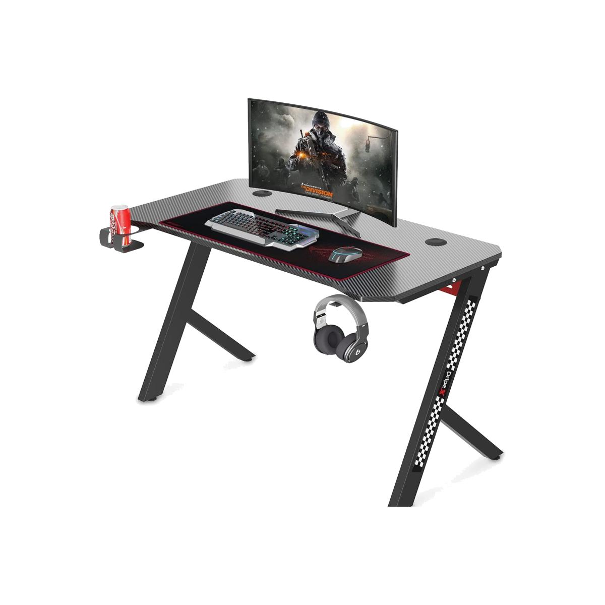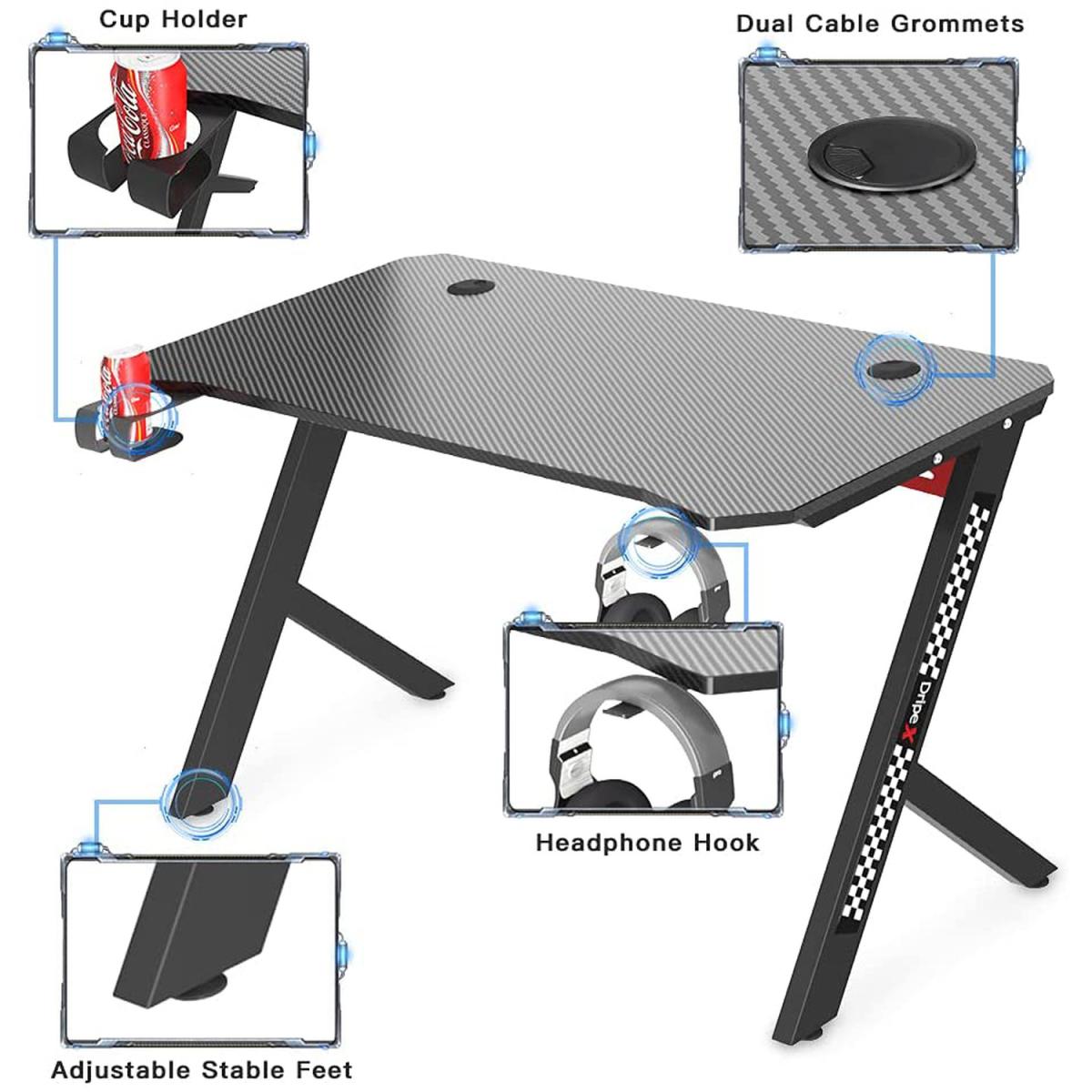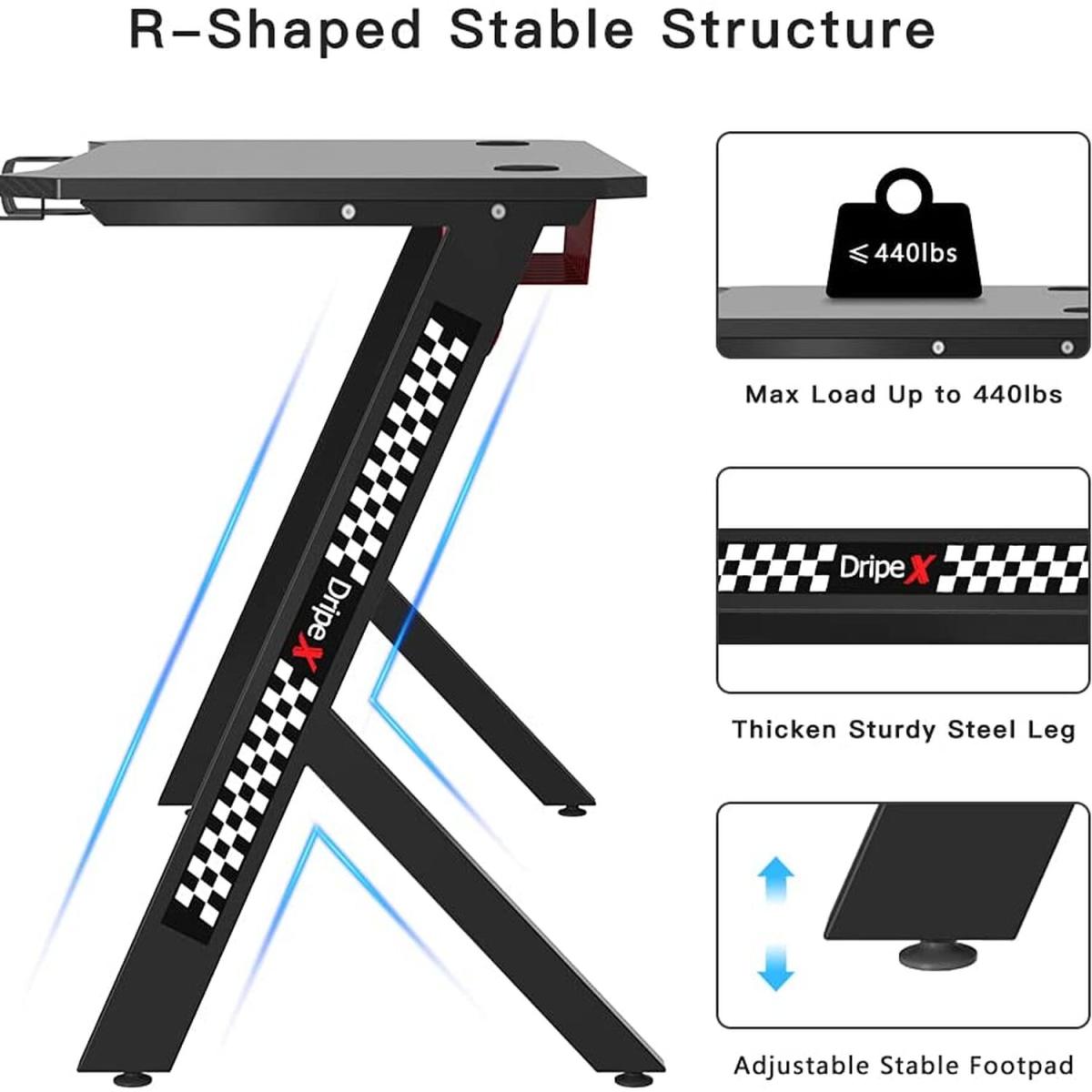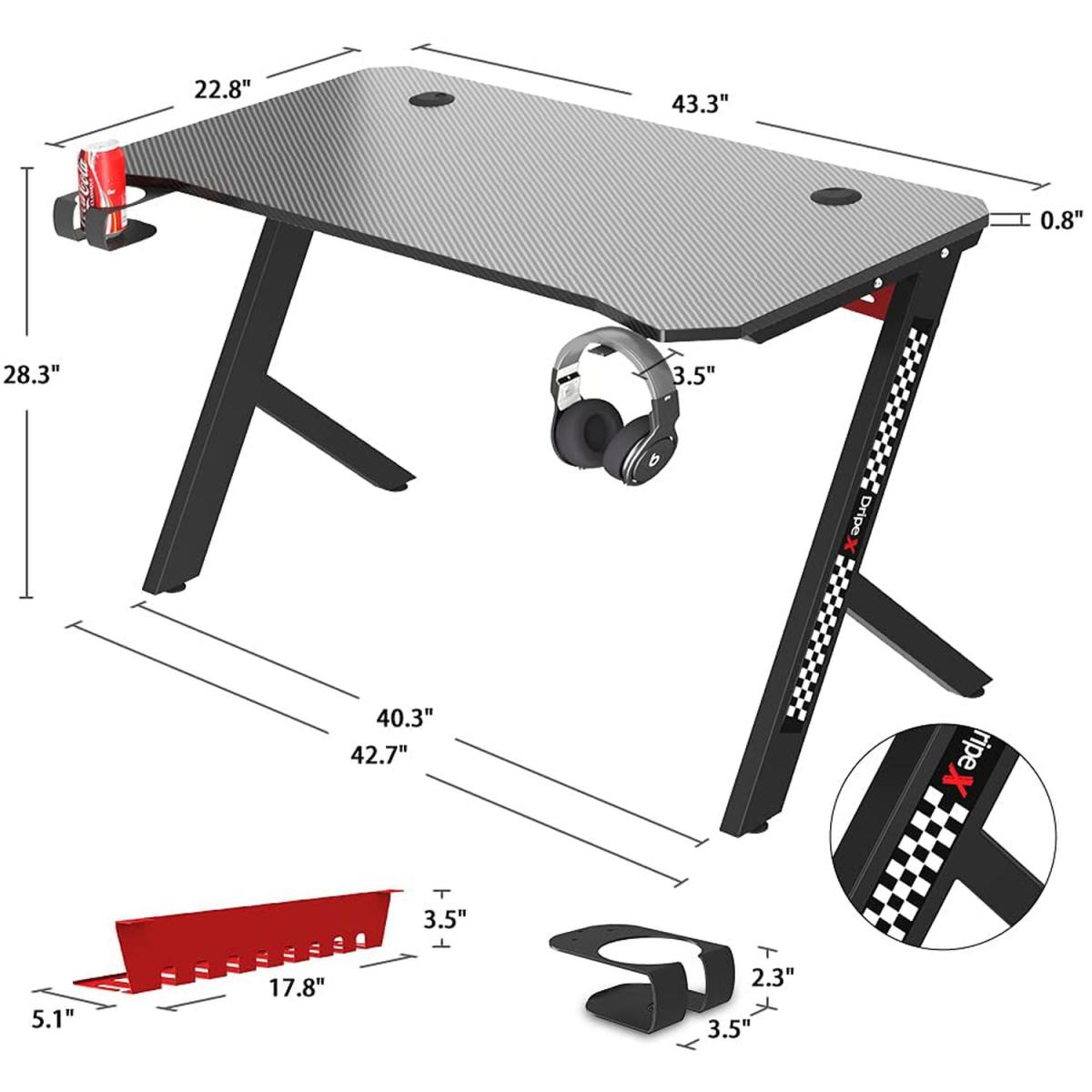 Dripex gaming table is designed to elevate your gaming experience. It comes with a convenient cup holder, headphone hook, storage basket and 2 cable management holes, keeping your gaming desk neat & tidy. Dripex gaming desk features a large surface of 43.3 x 22.8 inches, supports up to two monitors. The carbon fibre texture desktop has plenty of space for your computer, monitor, keyboard and other gaming gear, offering ideal flexibility for gamers to start their gaming dreams. Dripex gaming pc desk is crafted of 2 rock-solid R-shaped steel legs. it is finished off with a special scratch/wear resistant powdered coating that can stand a maximum load of 440 lbs. Adjustable foot pads can greatly protect the desk itself and prevent damage to the floor when you move the desk. Black exterior and convenient functions are perfect for both gaming and office use! It can also well serve as a home office desk, study table, office station, pc laptop table, etc. High-quality materials make this desk an excellent long-lasting piece of furniture. With the understandable manual instructions and all necessary parts, you can easily install our Dripex gaming desk. It is backed up by a 1-year warranty. If you have any questions, just feel free to contact us for help