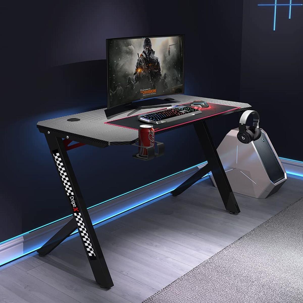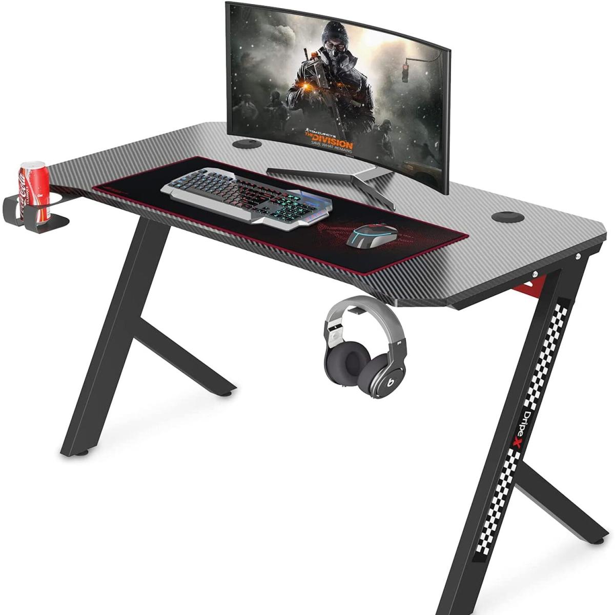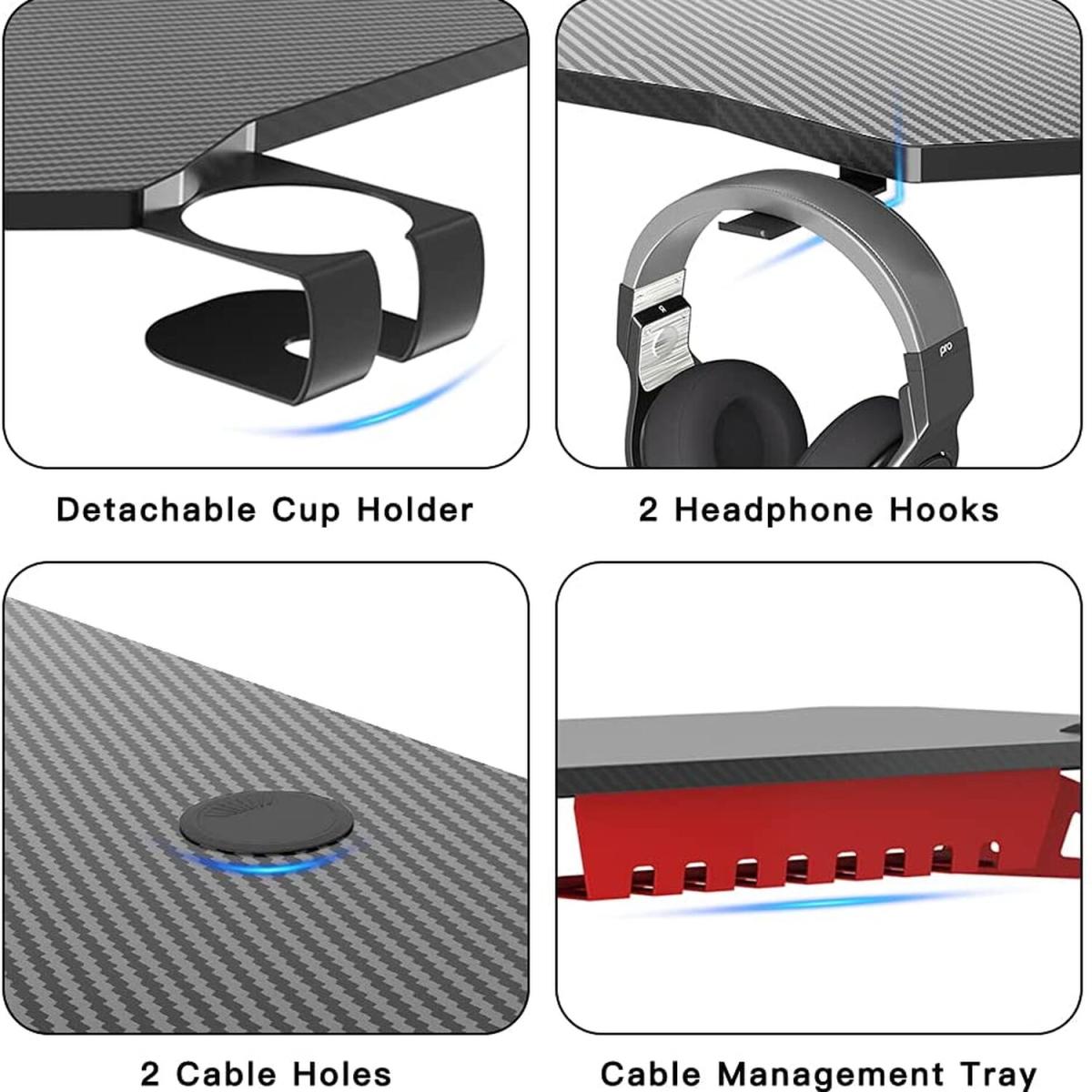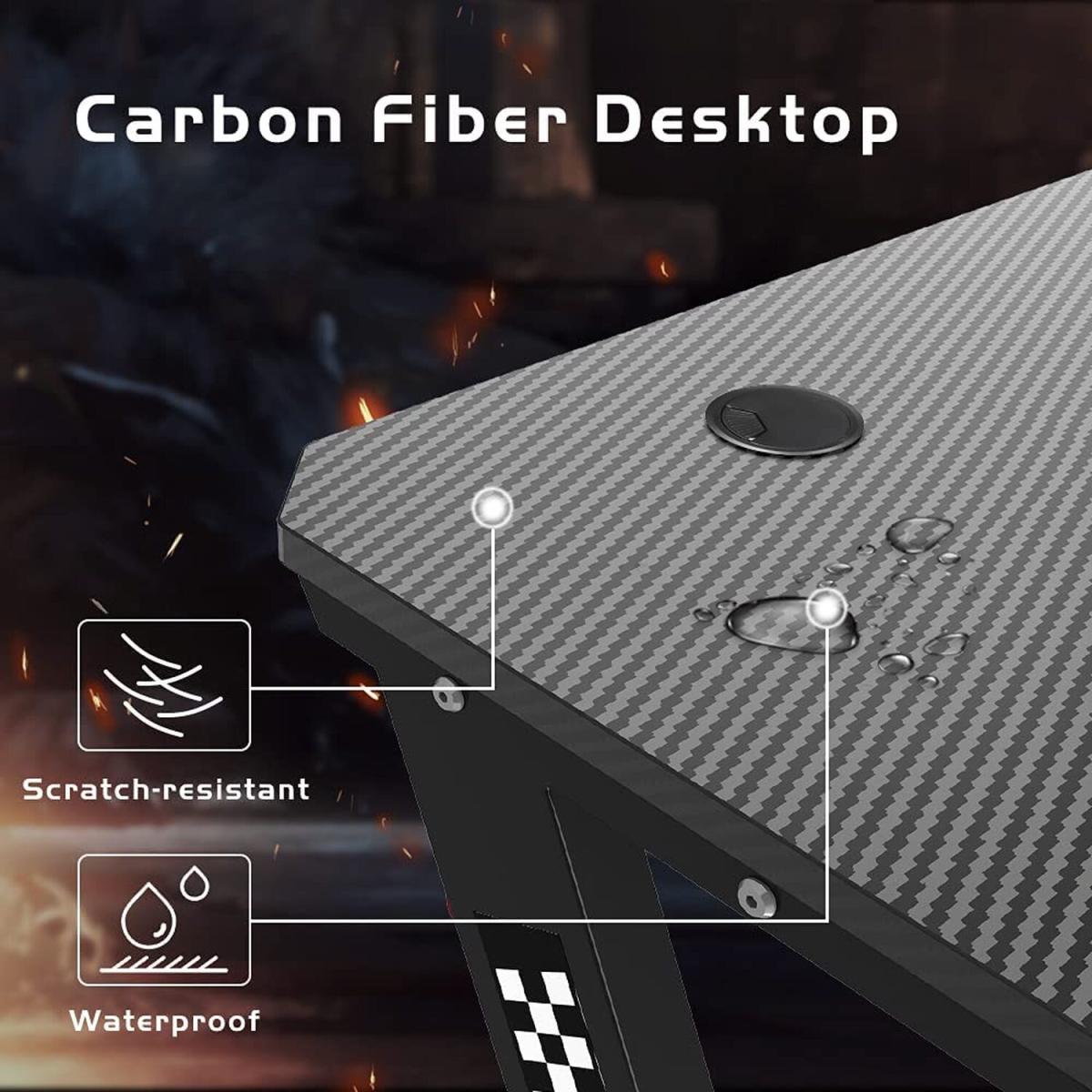 Dripex gaming table is designed to elevate your gaming experience. It comes with a convenient cup holder, headphone hook, storage basket and 2 cable management holes, keeping your gaming desk neat & tidy. Dripex gaming desk features a large surface of 43.3 x 22.8 inches, supports up to two monitors. The carbon fibre texture desktop has plenty of space for your computer, monitor, keyboard and other gaming gear, offering ideal flexibility for gamers to start their gaming dreams. Dripex gaming pc desk is crafted of 2 rock-solid R-shaped steel legs. it is finished off with a special scratch/wear resistant powdered coating that can stand a maximum load of 440 lbs. Adjustable foot pads can greatly protect the desk itself and prevent damage to the floor when you move the desk. Black exterior and convenient functions are perfect for both gaming and office use! It can also well serve as a home office desk, study table, office station, pc laptop table, etc. High-quality materials make this desk an excellent long-lasting piece of furniture. With the understandable manual instructions and all necessary parts, you can easily install our Dripex gaming desk. It is backed up by a 1-year warranty. If you have any questions, just feel free to contact us for help