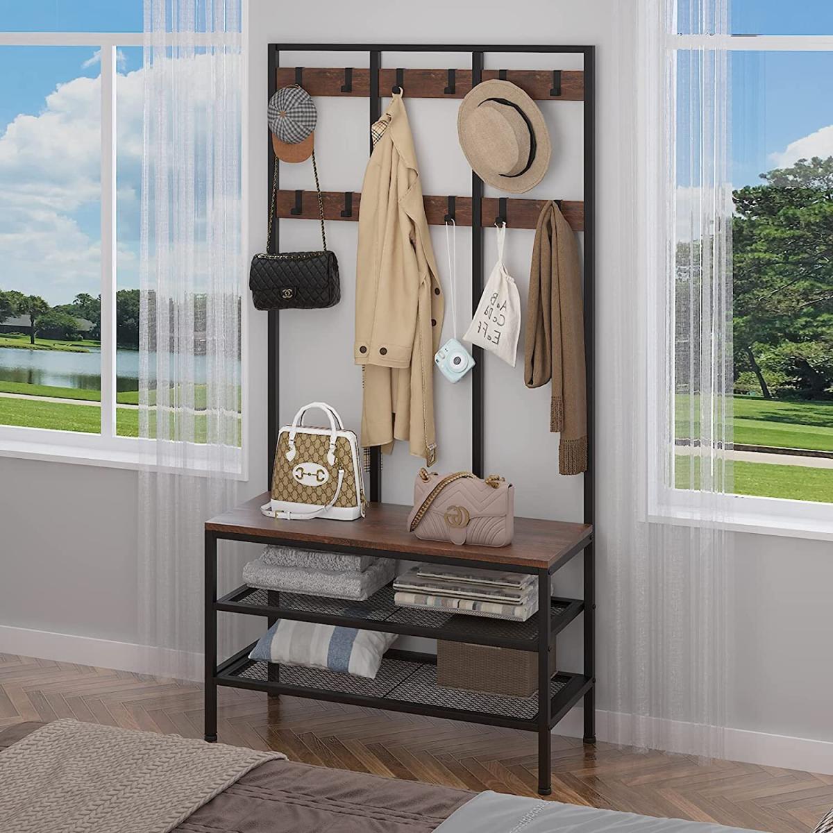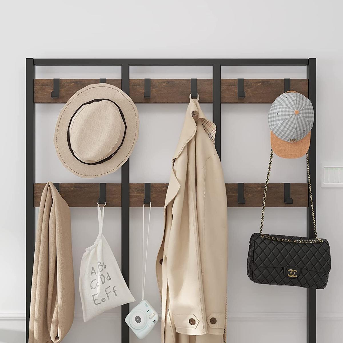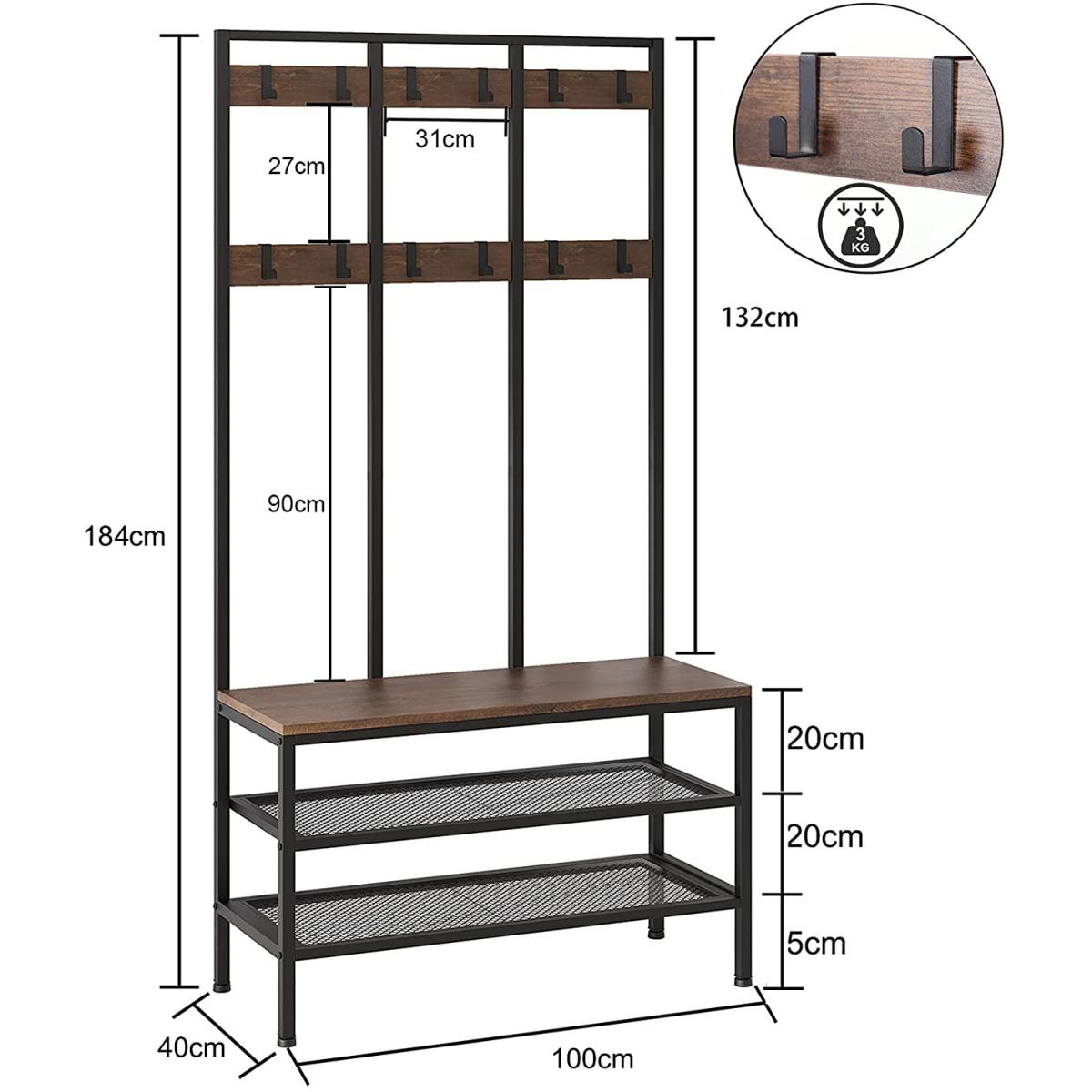 The coat rack with 12 dual hooks llow you to hang your clothes, bags, umbrellas. And a bench can be sit on which holds up to 80kg. 2 metal storage shelves to store your shoes, storage boxes handbags in a limited space. In contrast to other coat stands, this coat rack has 2 extra strong metal rods between the hooks for better stability and strength. Metal hook and can move left and right (each hook load capacity: 3kg). The eye-catching hall tree made of robust metal tubes and vintage style MDF board. The coat stand with 4 adjustable feet which can stand perfectly and stably on the carpet or the unbalanced board. An all-in-one coat stand sizes 100x40x184cm collection with coat hooks and a shoe bench is more convenient practical. Place the versatile hall tree in your hallway, living room, bedroom, or anywhere you need a little more organization, making everything handy when you're in a hurry. Thanks to the simple structure of the coat racks and the detailed instructions, easy to put together. Customer satisfaction is our unremitting pursuit, if you have any questions, please feel free to contact us.