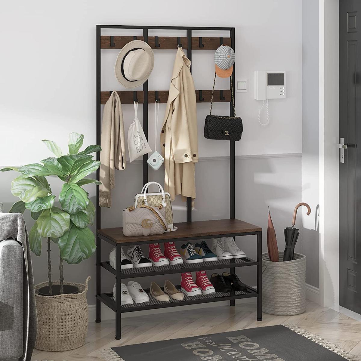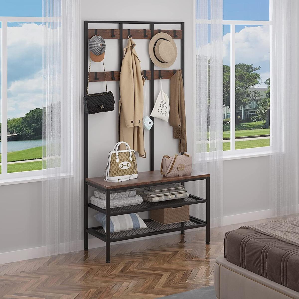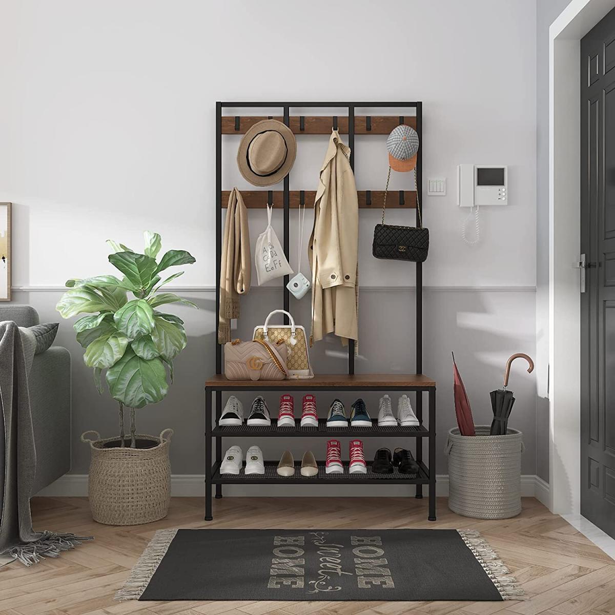 The coat rack with 12 dual hooks llow you to hang your clothes, bags, umbrellas. And a bench can be sit on which holds up to 80kg. 2 metal storage shelves to store your shoes, storage boxes handbags in a limited space. In contrast to other coat stands, this coat rack has 2 extra strong metal rods between the hooks for better stability and strength. Metal hook and can move left and right (each hook load capacity: 3kg). The eye-catching hall tree made of robust metal tubes and vintage style MDF board. The coat stand with 4 adjustable feet which can stand perfectly and stably on the carpet or the unbalanced board. An all-in-one coat stand sizes 100x40x184cm collection with coat hooks and a shoe bench is more convenient practical. Place the versatile hall tree in your hallway, living room, bedroom, or anywhere you need a little more organization, making everything handy when you're in a hurry. Thanks to the simple structure of the coat racks and the detailed instructions, easy to put together. Customer satisfaction is our unremitting pursuit, if you have any questions, please feel free to contact us.