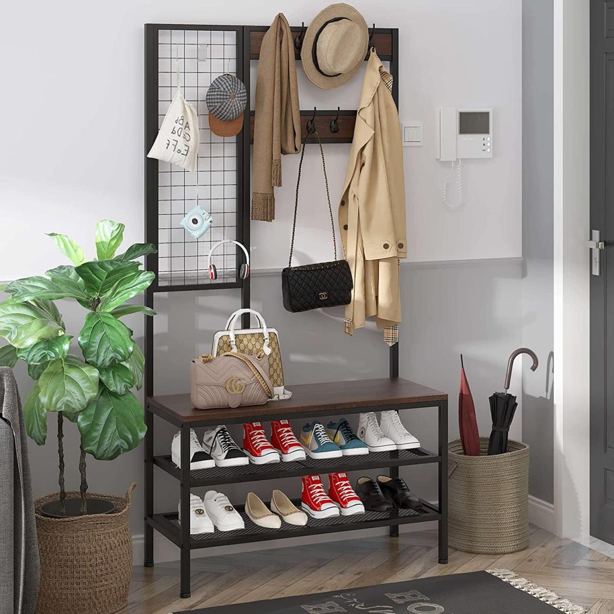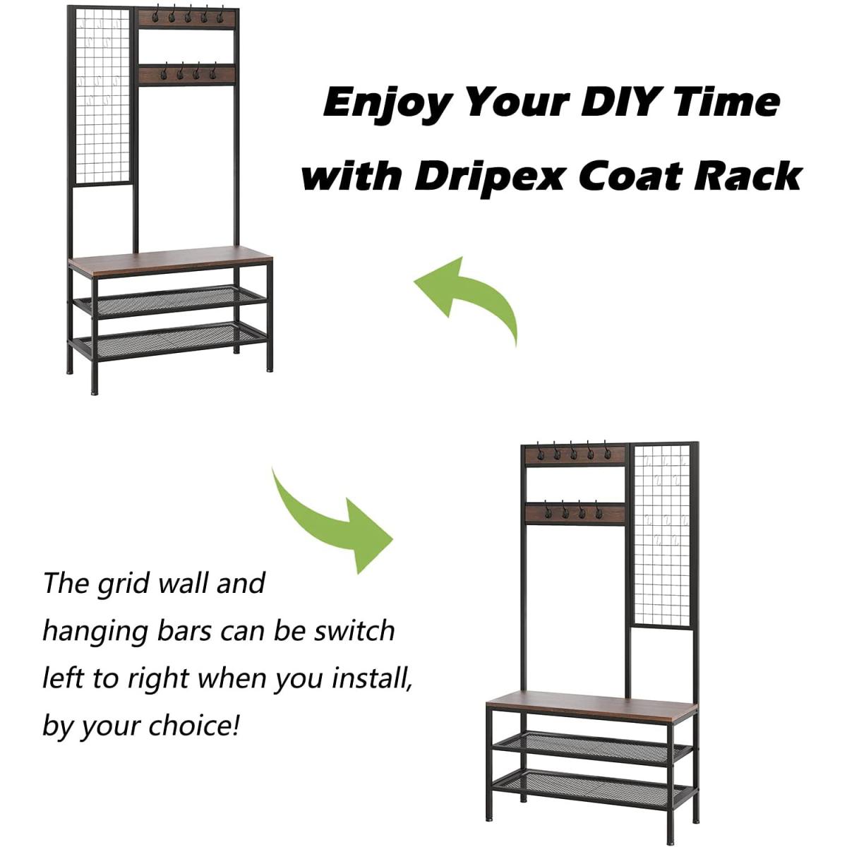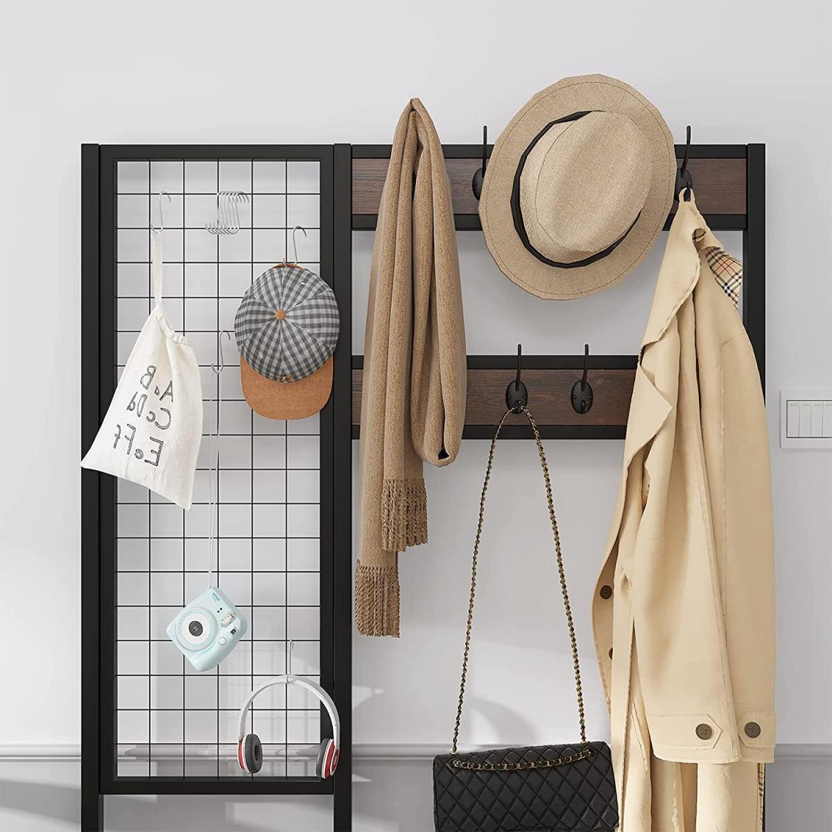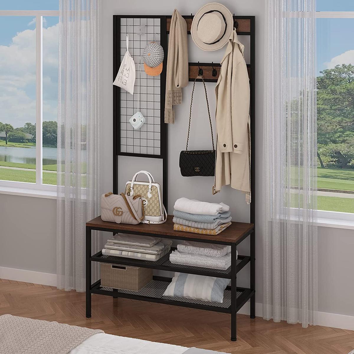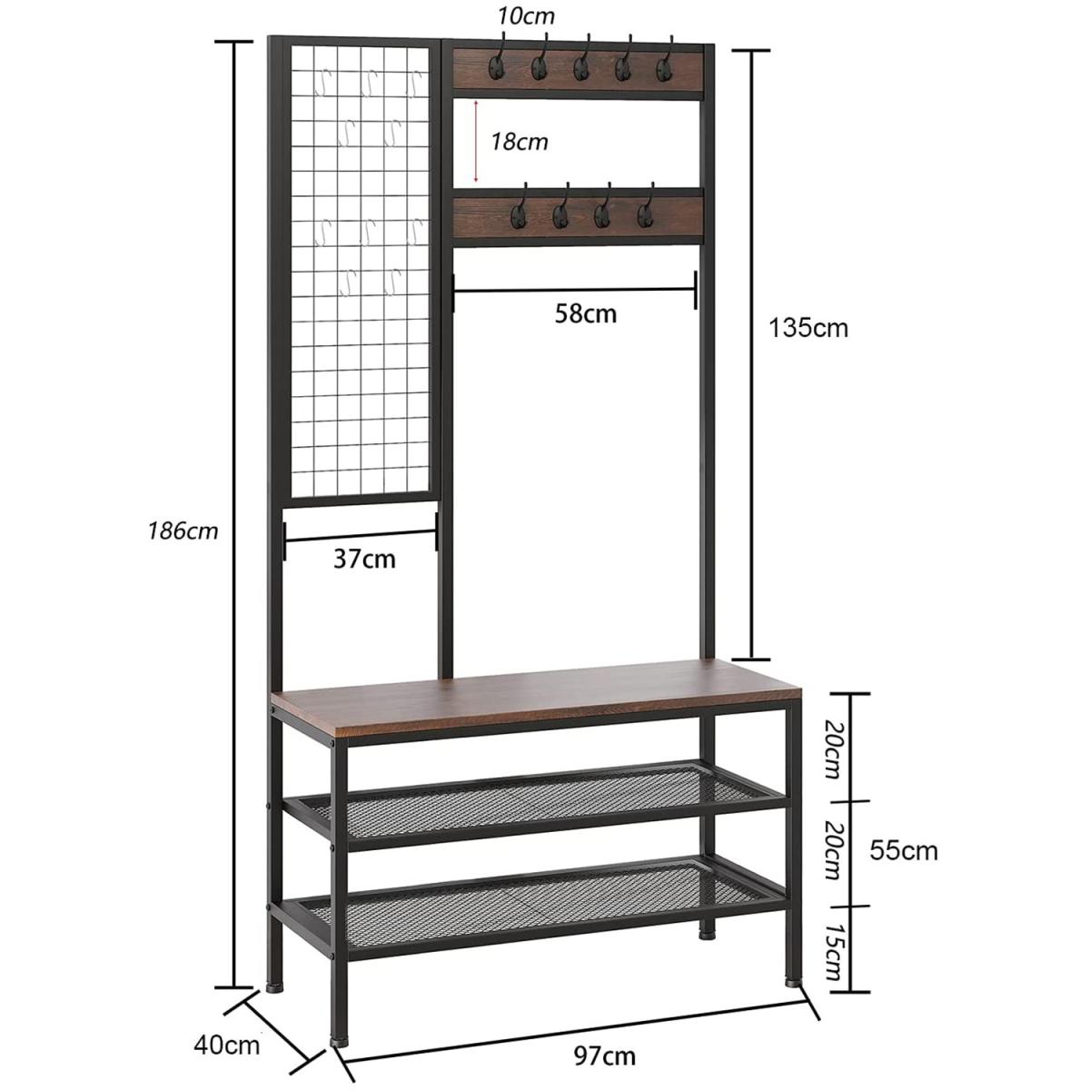 The entryway coat stand, shoe bench, shoe rack, and large storage shelf make everything handy when you're in a hurry. With 10 removable hooks and + 9 bars for clothing, bags, keys, umbrellas, and 2 metal wire shelves for shoes. It can work well in an entryway, living room, laundry room, hallway, bedroom, and anywhere you need it. Made of metal frame and high-quality board, which ensures stability and durability. And this coat stand with shoes rack is sturdy enough to service the whole family for years. Sized 38.19x15.75x72.83in / 97x40x185cm, and weighed 46.3 lb, the bench can hold more 80 kg. You can feel free to sit on it and wear shoes when you go out or back home. Rustic brown Board and black metal frame, this multipurpose clothing shelves with shoe rack will meet your different needs for the functions of storage and art. Retro and minimalist design give people a sense of elegance, it can work well for your home and office. Thanks to the detailed manual and the simple structure of this coat rack with shoe storage, you can put it together easily within 30 minutes ( Screwdriver and Allen keys are included). Smooth surfaces and excellent workmanship can be cleaned and maintained easily with a soft wet cloth.