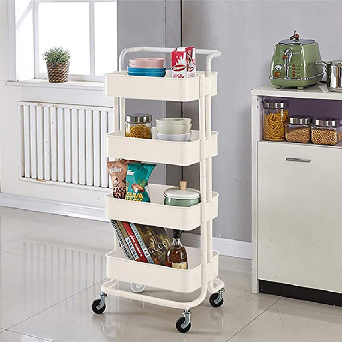 The rolling storage trolley cart is made of high-quality carbon steel which has the features of anti-corrosion, waterproof and scratch-resistant. The rolling storage shelves provide excellent stability and durability. The rolling storage shelves with four 360-degree rotating wheels,2 of them with metal locks that make the cart easily move around or lock into place. The rolling rack is built with a flexible handle for moving the car around your house without any difficulty. 4 tier utility storage unit cart can help you to fully utilise the vertical space which great solution for storage in a small room. The whole rolling rack is about 43x 36 x 114cm (W x D x H), with 4 tier 36 x 42 x 7.5 cm (W x D x H) storage baskets, and each basket can bear up to about 66 lbs. The 4-tier storage organizer rack provides large storage space which can be used as a bookshelf, kitchen cart, baby room cart, storage shelves, beauty cart, and other office organization. The storage utility cart can work anywhere in your home which can make your home more clean and comfortable. This kitchen storage cart comes with the assembly tool, it will take 10-15 mins to put it together.4 basket shelves with mesh bottoms allow airflow to prevent odour. The hole basket design makes the cart look stylish, modern, and elegant to decorate your room or office.