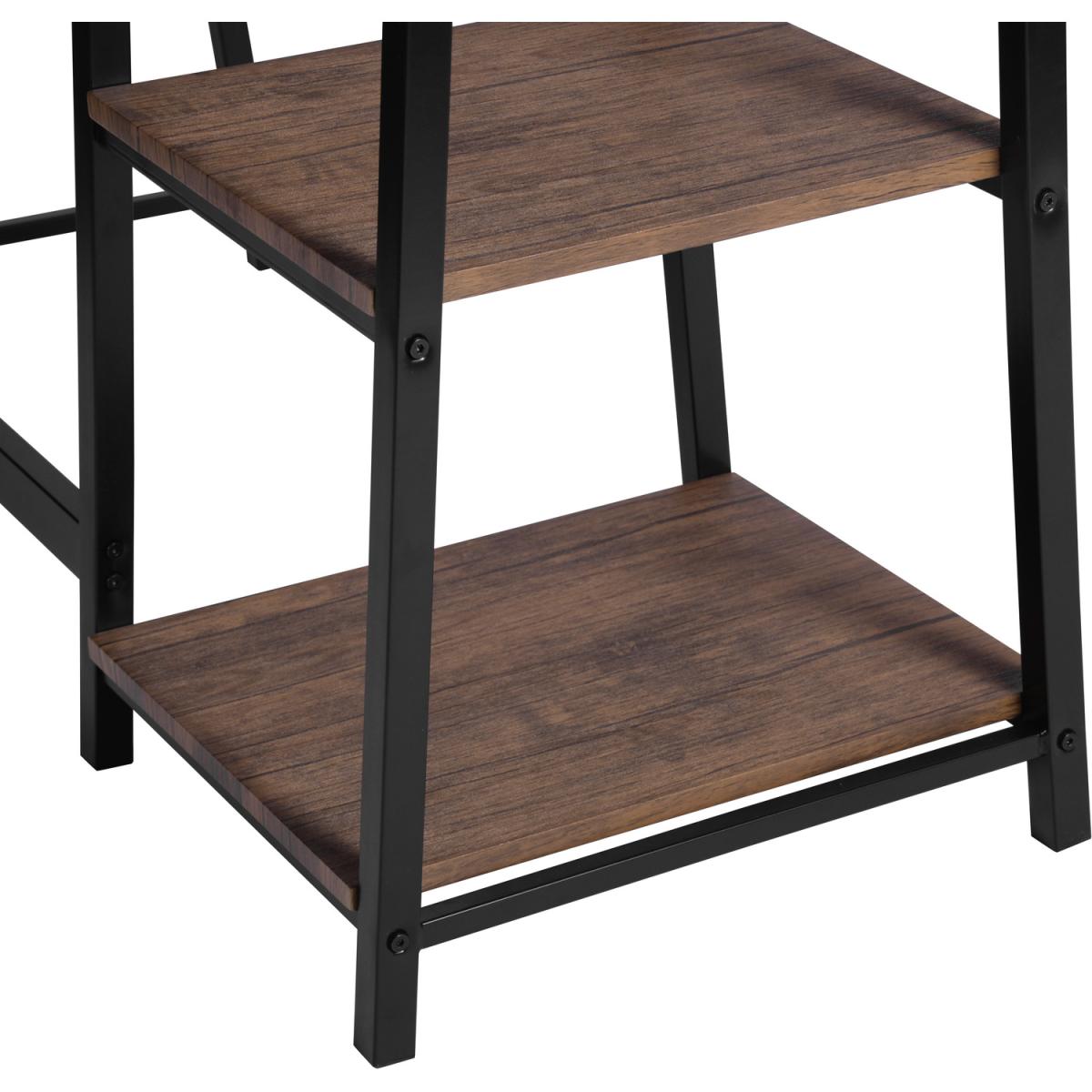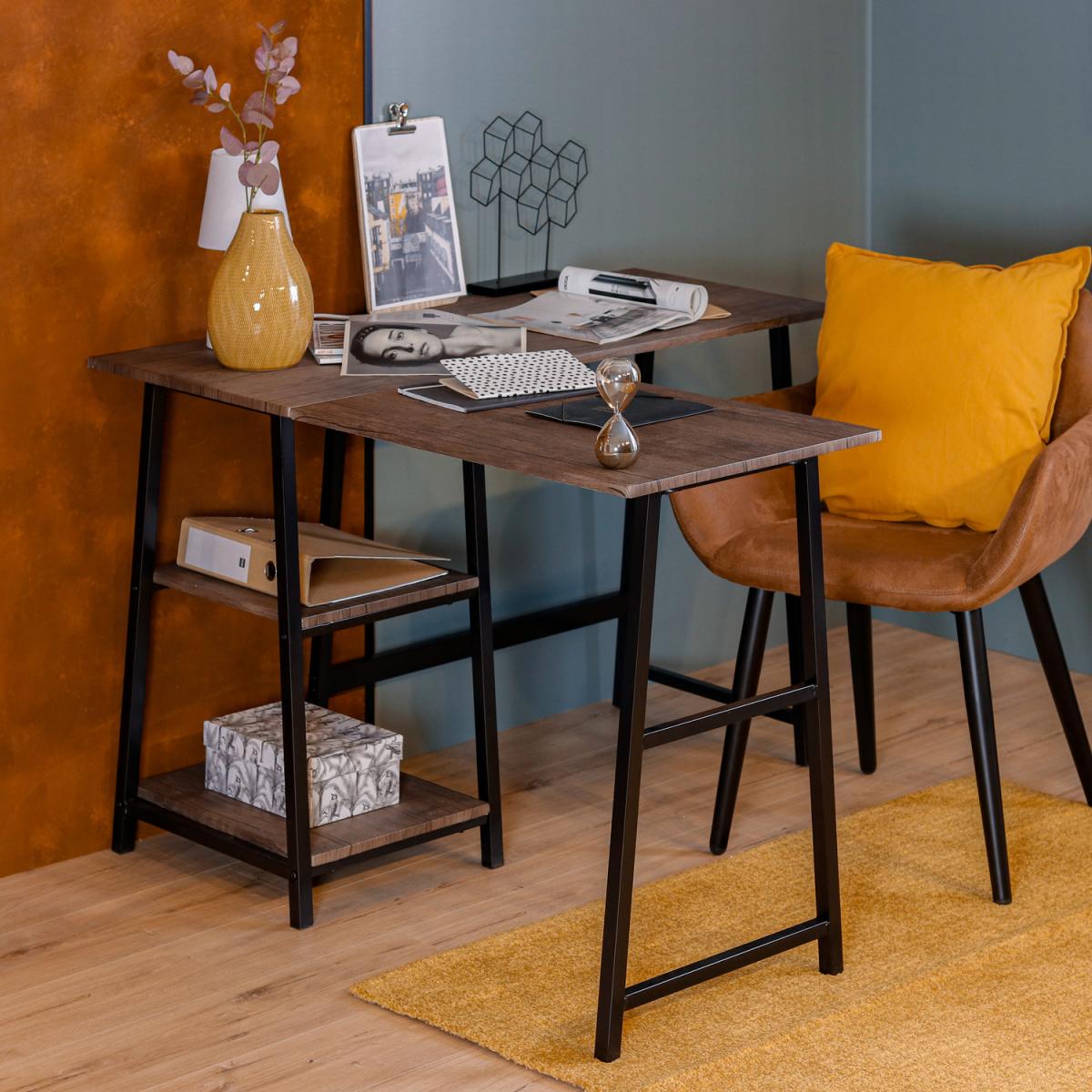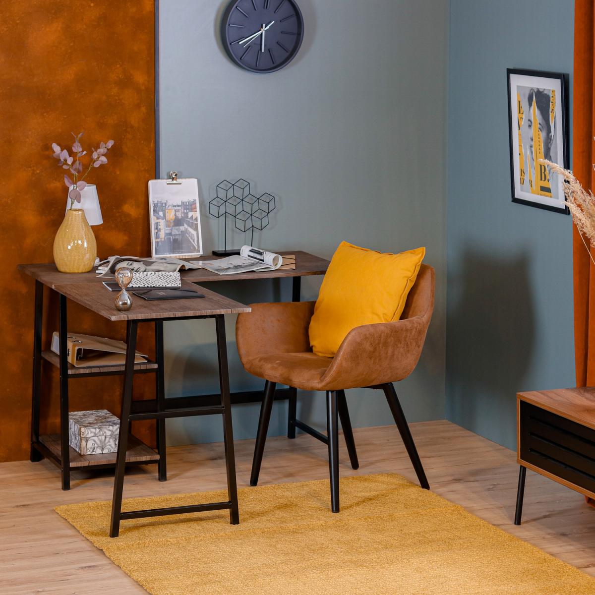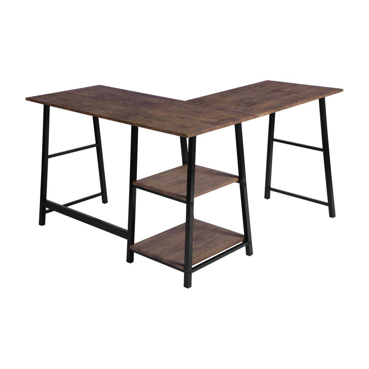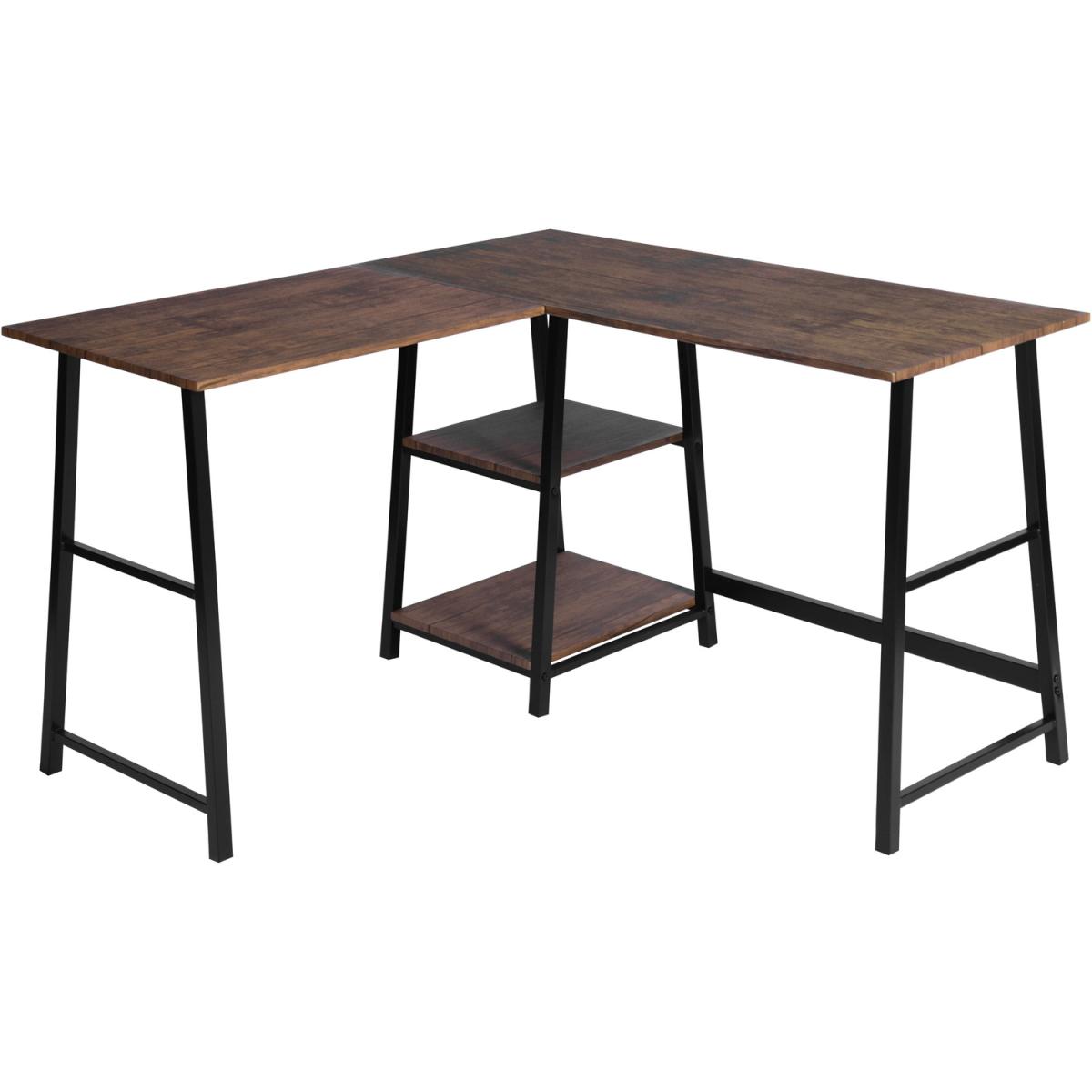 Equip your home workspace with this desk that slides into a corner to save space while providing a large work surface. The 2-tier shelf allows you to store your belongings within easy reach. With the walnut brown L-shaped table top and matte black steel frame, this desk brings a touch of industrial style. The surface is made of quality particle board that is waterproof and easy to clean. A strong metal frame makes this desk stable and sturdy for long-term use.