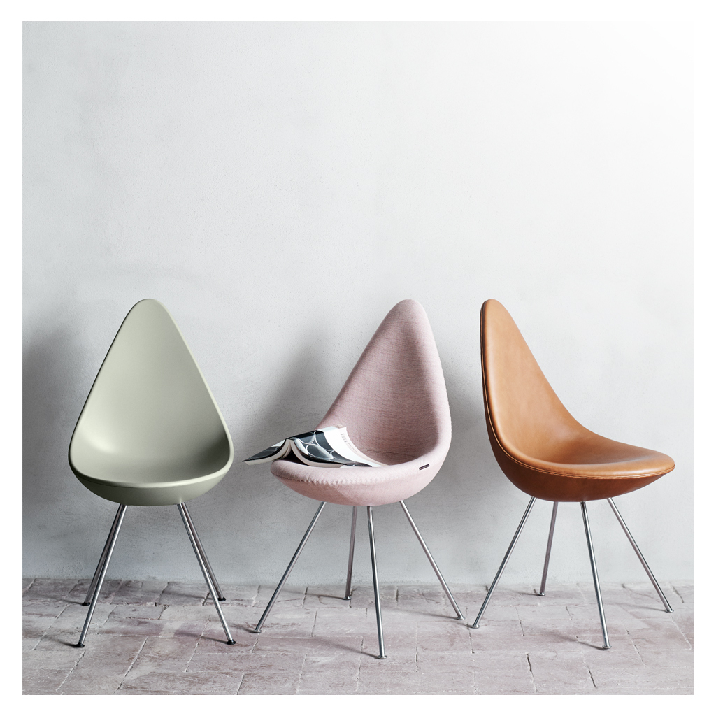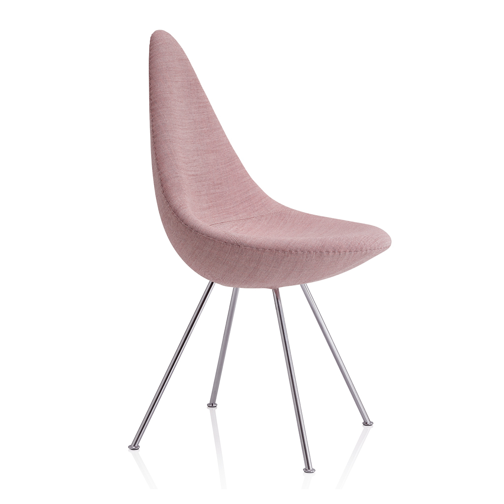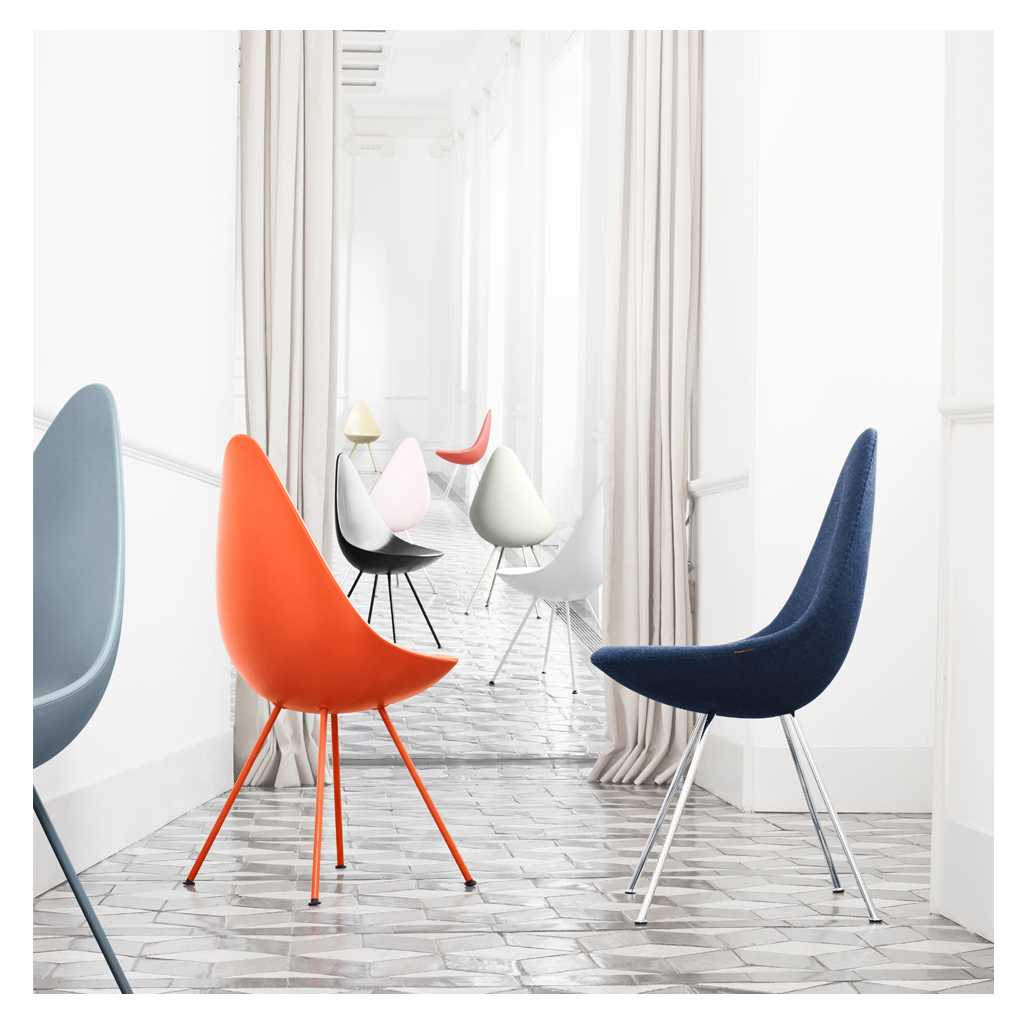 Designed in 1958 by Arne Jacobsen, the statement Drop Chair is crafted to meticulous standards by international design brand Fritz Hansen and is fully upholstered in Kvadrat's Canvas upholstery in a selection of hues. Originally designed for the Royal Hotel in Copenhagen, the Drop Chair epitomises refined design, with an individual silhouette and enduring craftsmanship. In 2014, the Drop Chair was re-launched by Denmark-based Fritz Hansen, producing Arne Jacobsen's personal favourite to exacting standards using the finest raw materials and skilled craftspeople. Fully upholstered in Kvadrat's Canvas fabric, the Drop Chair is awarded with a welcoming and durable surface, woven with a blend of 90% new wool and 10% nylon yarns and contrasted with a chrome-plated base for a distinctly modern finish.