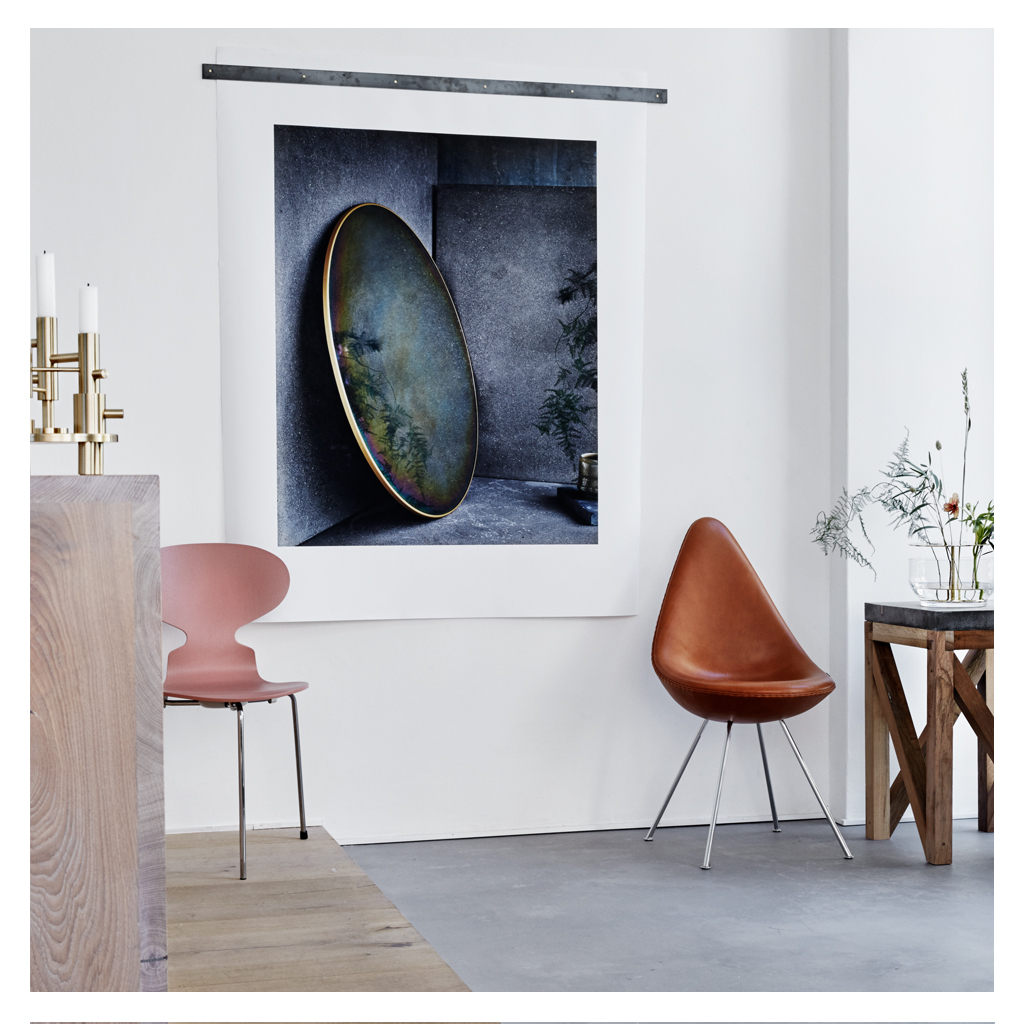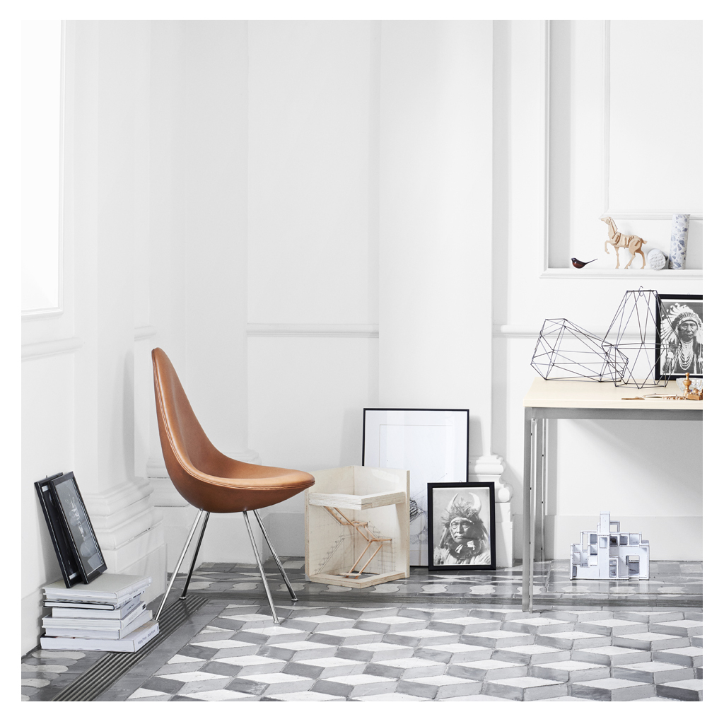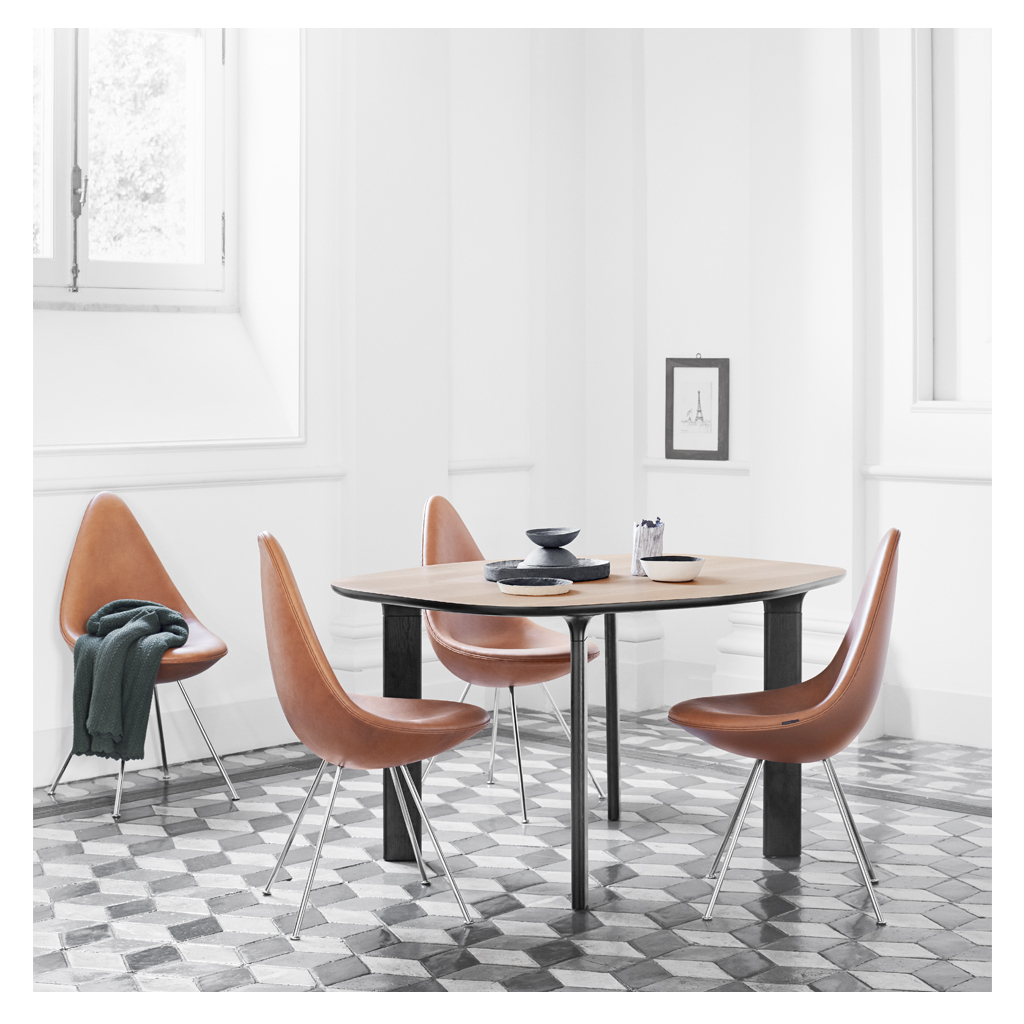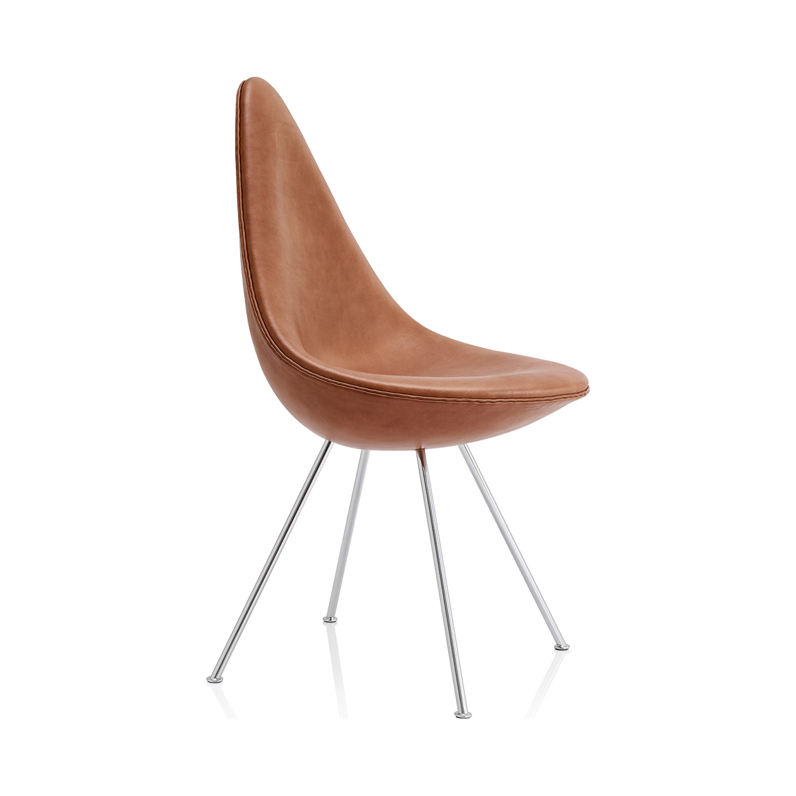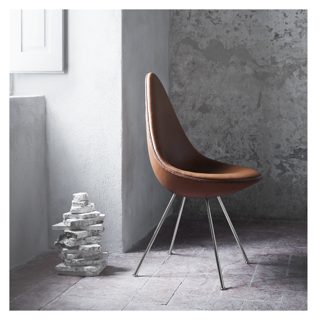 Designed in 1958 by Arne Jacobsen, the statement Drop Chair is crafted to meticulous standards by international design brand Fritz Hansen and is fully upholstered in Grace Leather in a selection of hues for a smooth, rich finish. Originally designed for the Royal Hotel in Copenhagen, the Drop Chair epitomises refined design, with an individual silhouette and enduring craftsmanship. In 2014, the Drop Chair was re-launched by Denmark-based Fritz Hansen, producing Arne Jacobsen's personal favourite to exacting standards using the finest raw materials and skilled craftspeople. Fully upholstered in Grace Leather, the Drop Chair is awarded with a firm yet flexible surface with visible, natural markings that beautifully contrast its chrome-plated base and add to the distinctive aesthetic of the classic design.