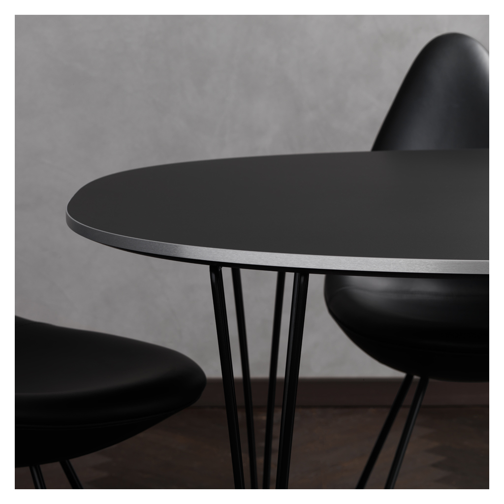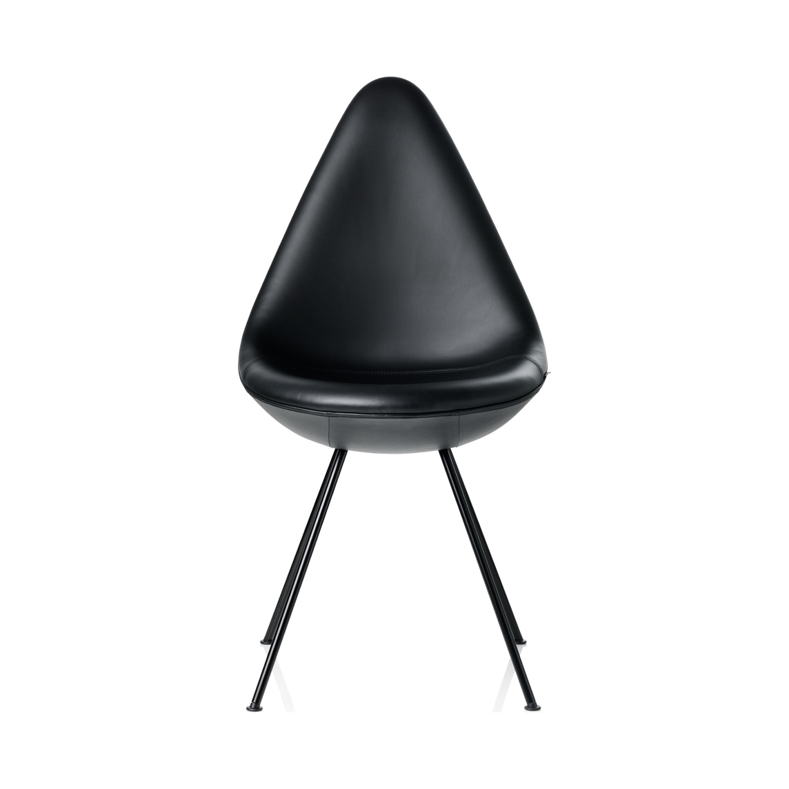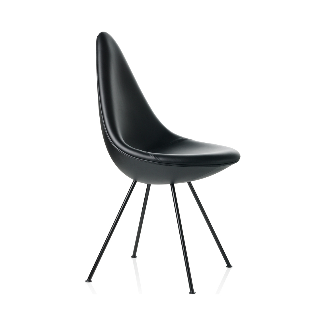 Designed in 1958 by Arne Jacobsen, the statement Drop Chair is crafted to meticulous standards by international design brand Fritz Hansen and is fully upholstered in black leather for a smooth, rich finish. Originally designed for the Royal Hotel in Copenhagen, the Drop Chair epitomises refined design, with an individual silhouette and enduring craftsmanship. In 2014, the Drop Chair was re-launched by Denmark-based Fritz Hansen, producing Arne Jacobsen's personal favourite to exacting standards using the finest raw materials and skilled craftspeople. Fully upholstered in black leather, the Drop Chair is awarded with a firm yet flexible surface with visible, natural markings that seamlessly coordinate with its black-coated base and add to the distinctive aesthetic of the classic design.
