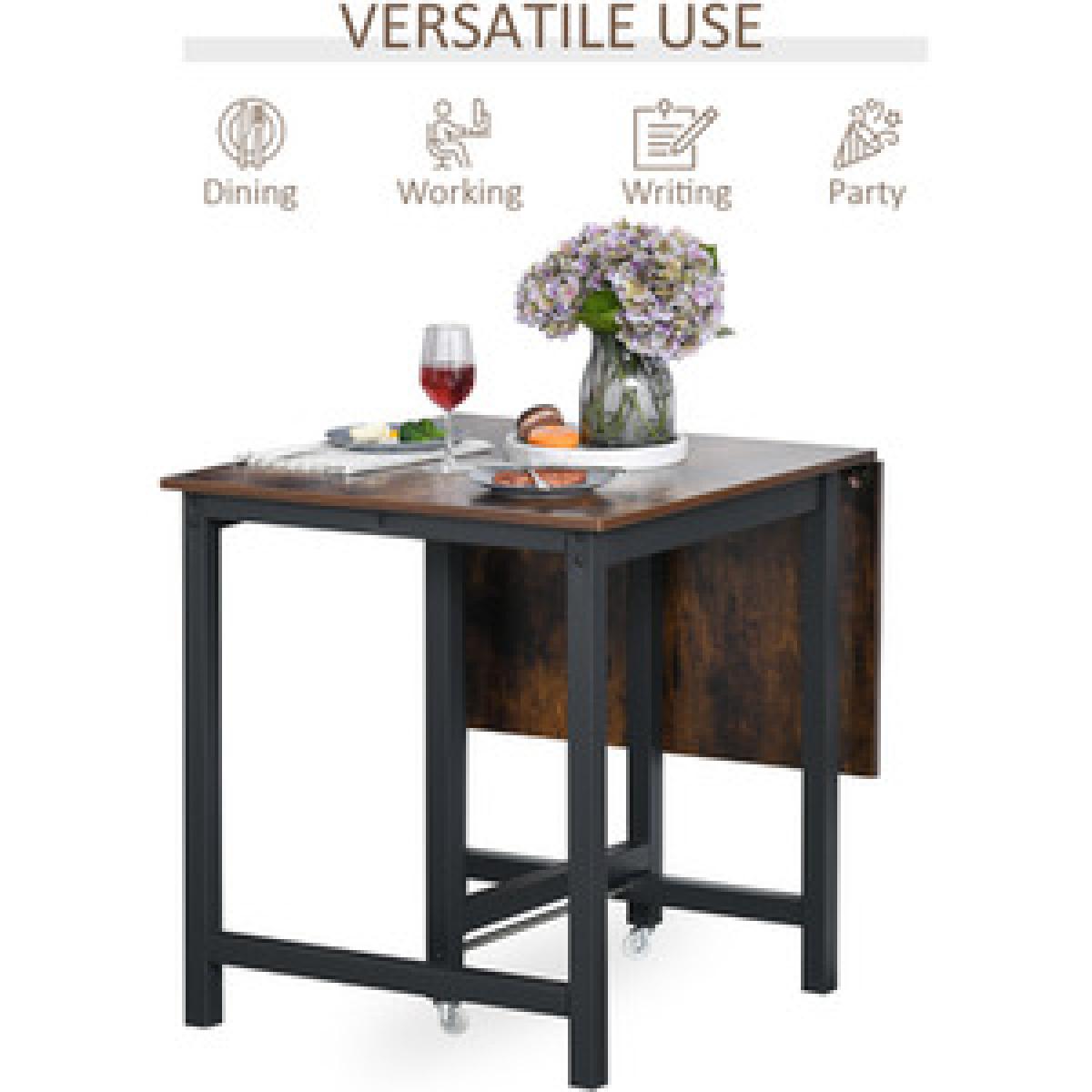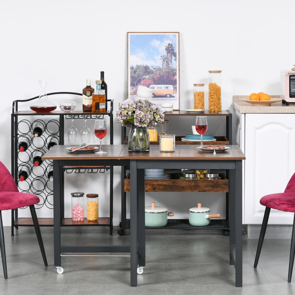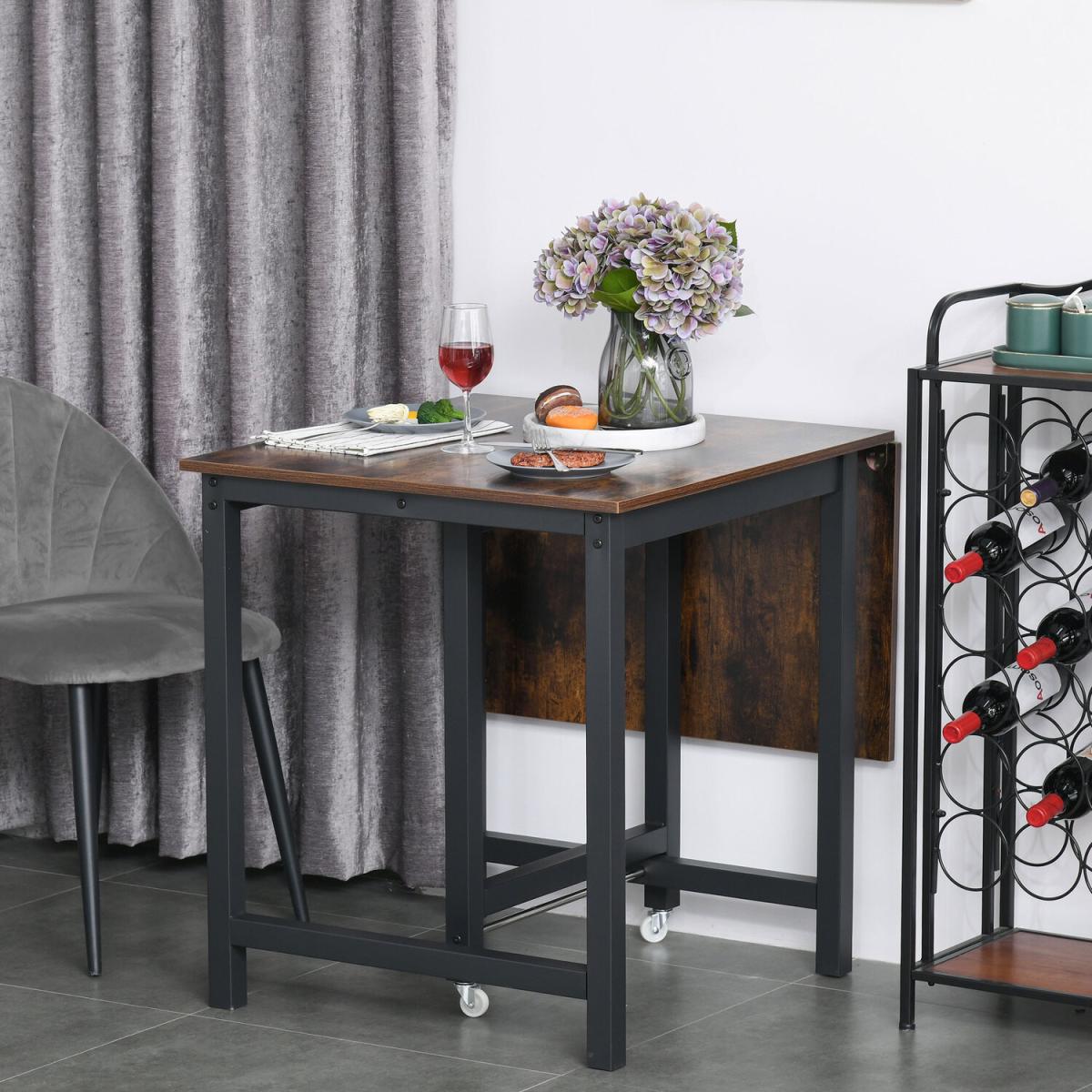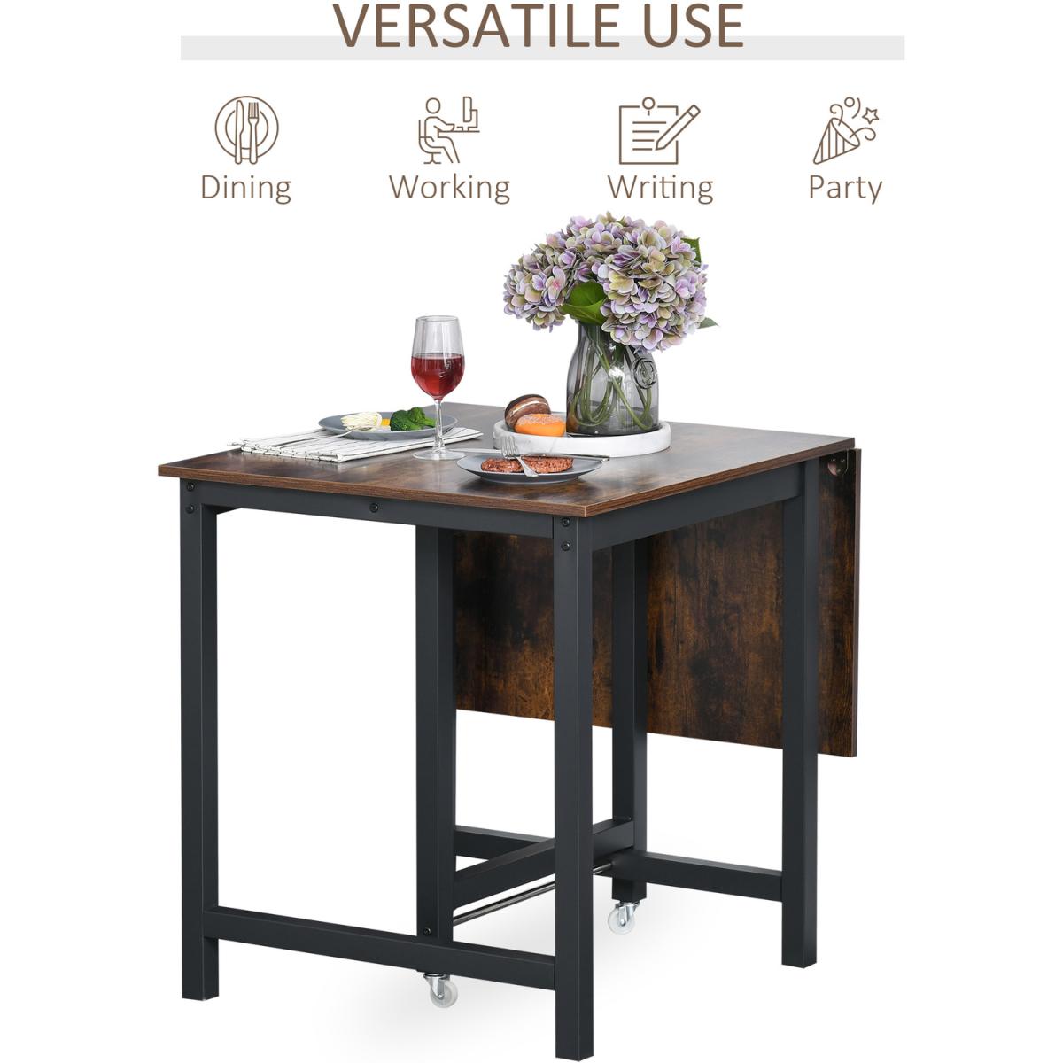 Create more space the industrial way with this HOMCOM folding table. Easy-to-use, the drop leaf design extends dining space quickly, thanks to the smooth movement and wheels on the feet. Can be used for a variety of purposes: a dining table, writing desk, or as an everyday dressing table. The sleek wood grain effect top is smoothly veneered, supported by a sturdy metal frame, giving you reliable use every time.