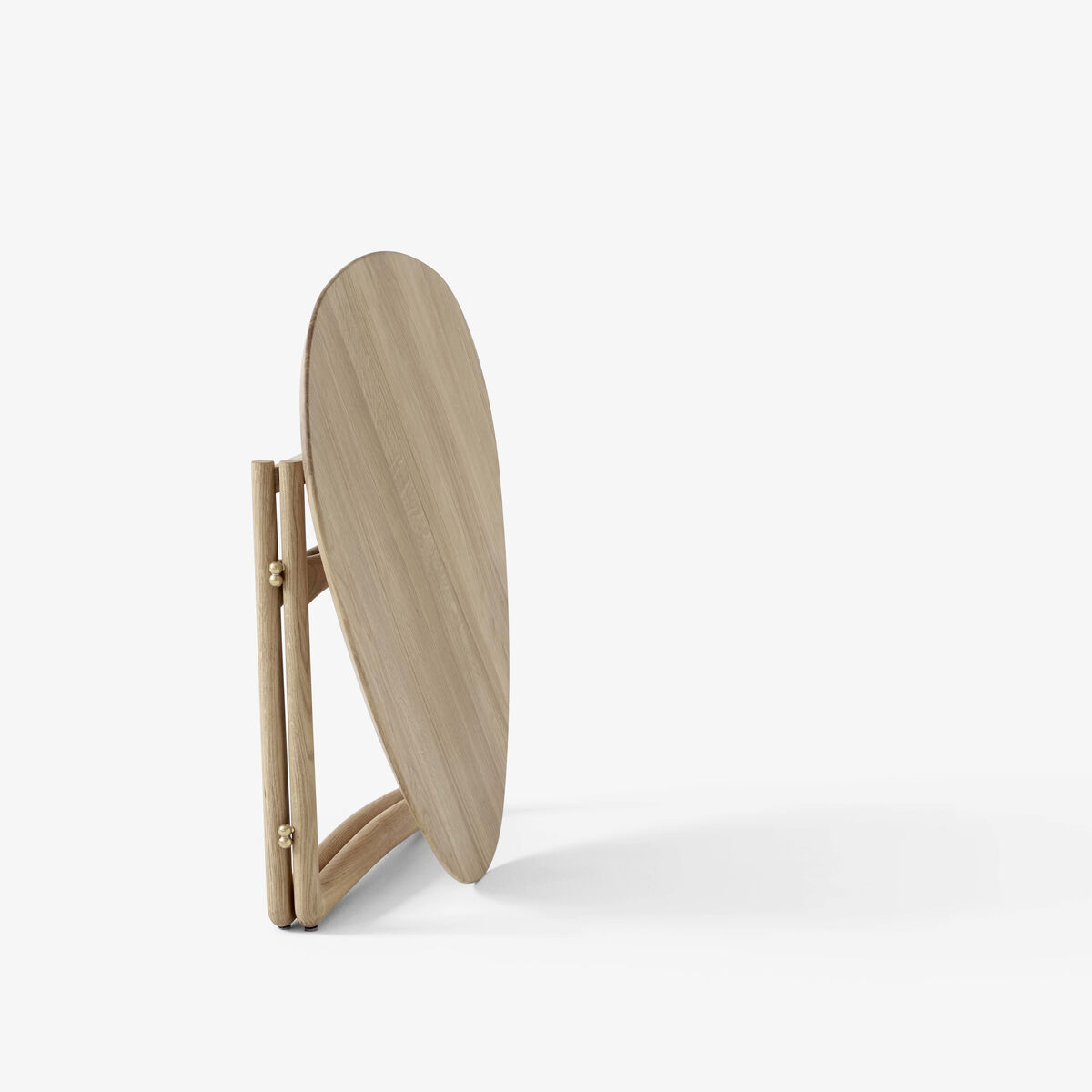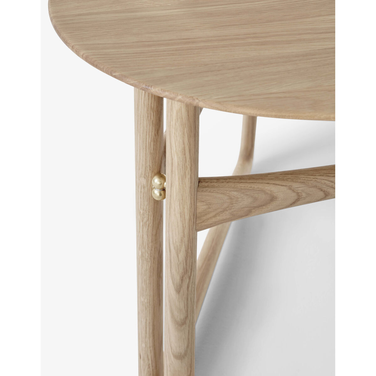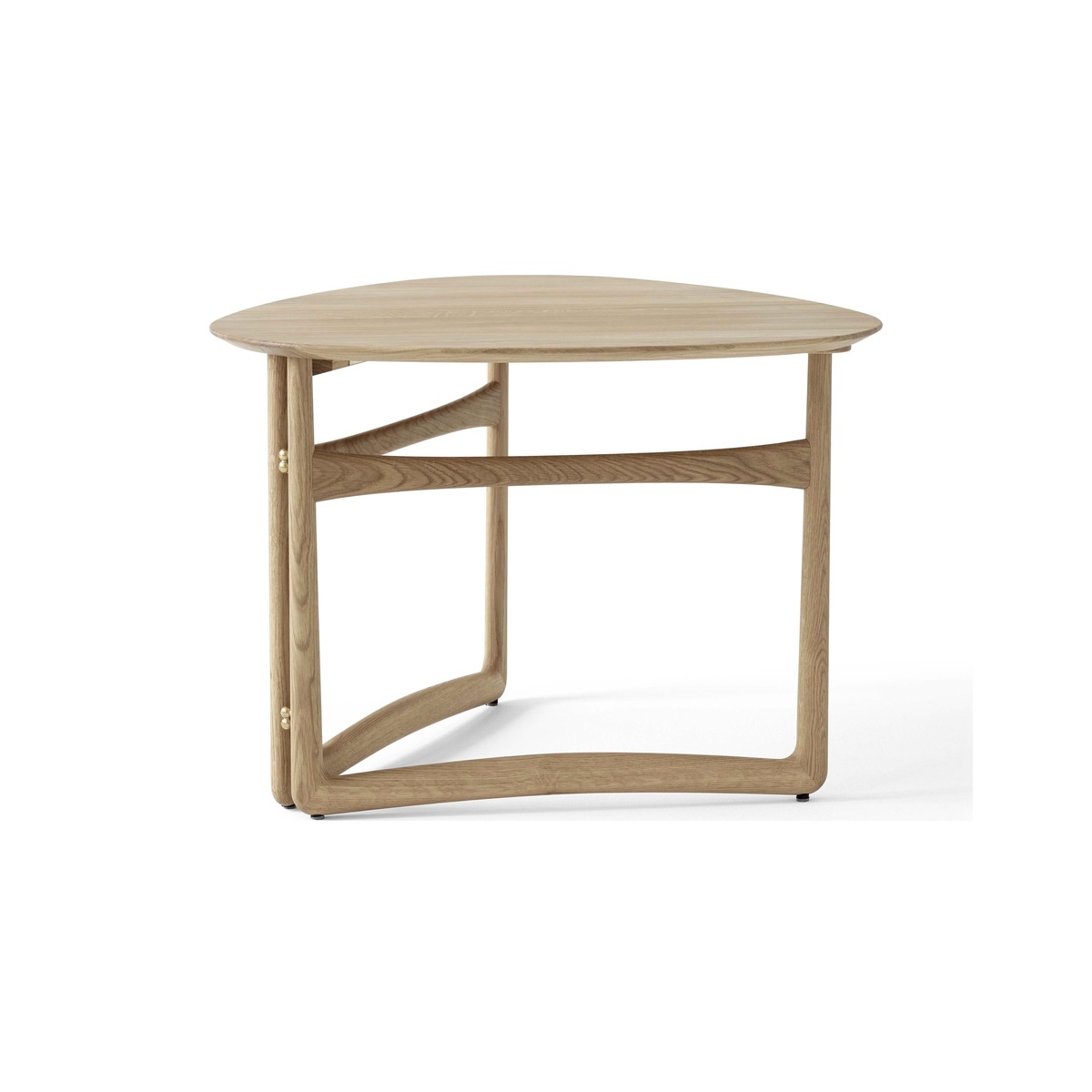 The Drop Leaf coffee table was designed in 1956 by Peter Hvidt (1916-1986) and Orla Mølgaard-Nielsen (1907-1993): these pioneers of Danish design from the middle of the 20th century had an avant-gardist approach to industrialised production. Now their work is exhibited in MoMA, at the National Gallery of Melbourne and the Design Museum of Copenhagen. The Drop Leaf coffee table is the result of fifteen years of experience and a bond between the two designers who are passionate about traditional Danish artisanal techniques that they learnt at the Copenhagen School of Arts and Crafts. The originality of the Drop Leaf table resides in its sculptural folding base which evokes the wings of a butterfly. This symmetrical collection consists of solid curved wooden openwork frames, connected by pieces of golden brass. The beauty of the organic lines, the interplays of solid and empty spaces and the transparency grant this piece simplicity, lightness and elegance. The result of remarkable cabinet-making work, the Drop Leaf table is rooted in the Scandinavian tradition.