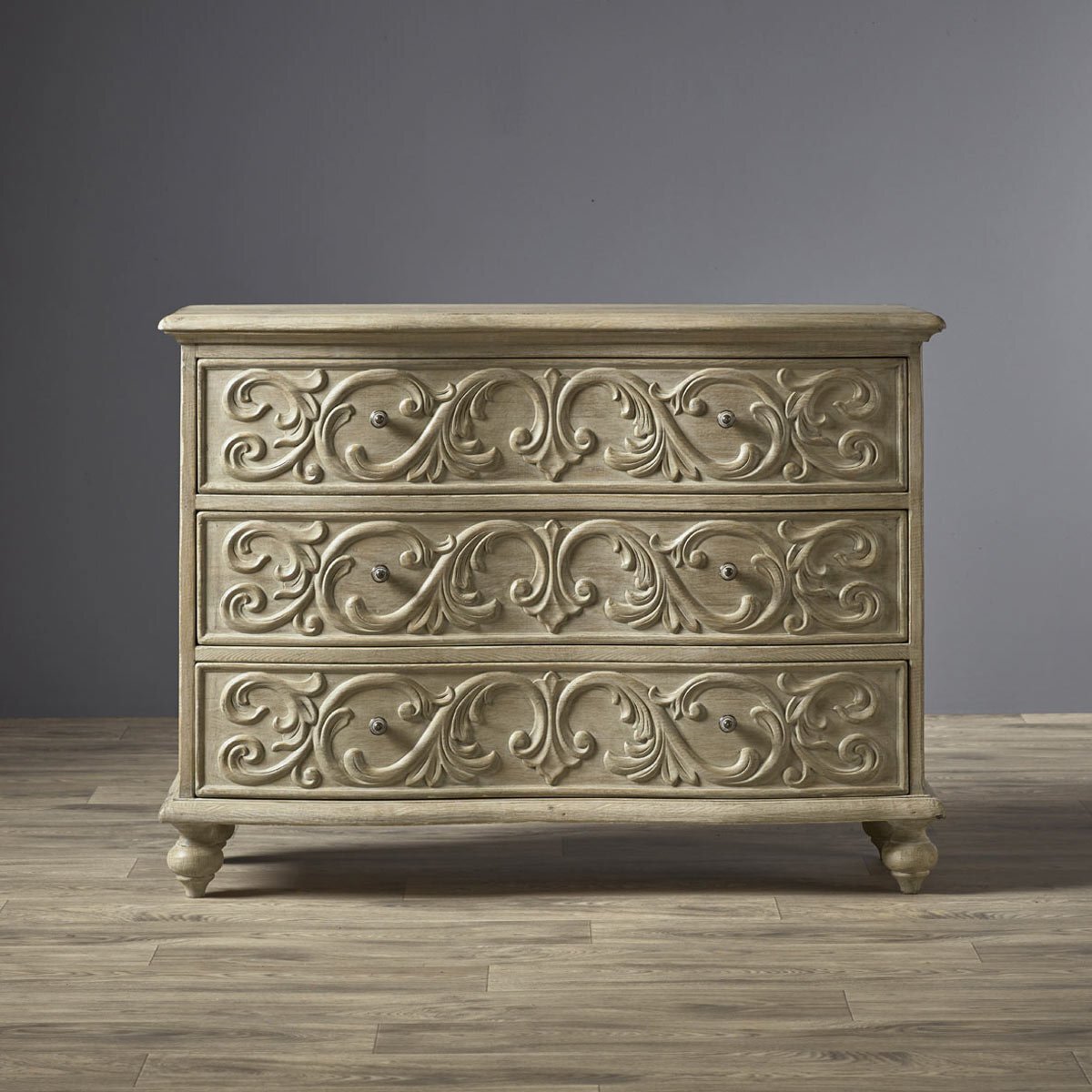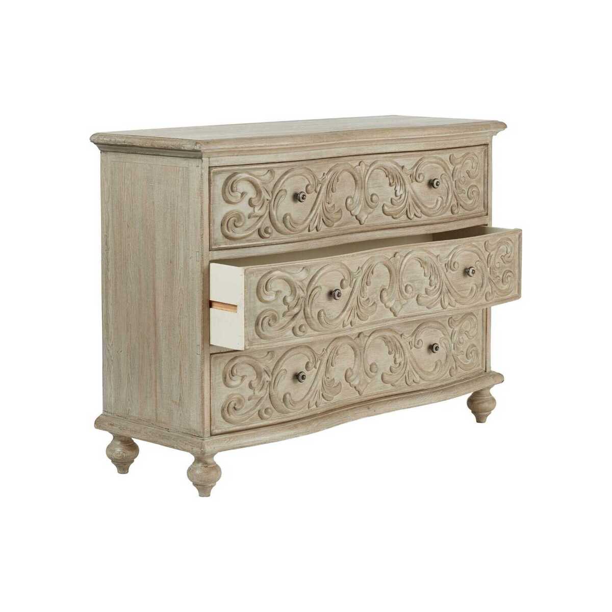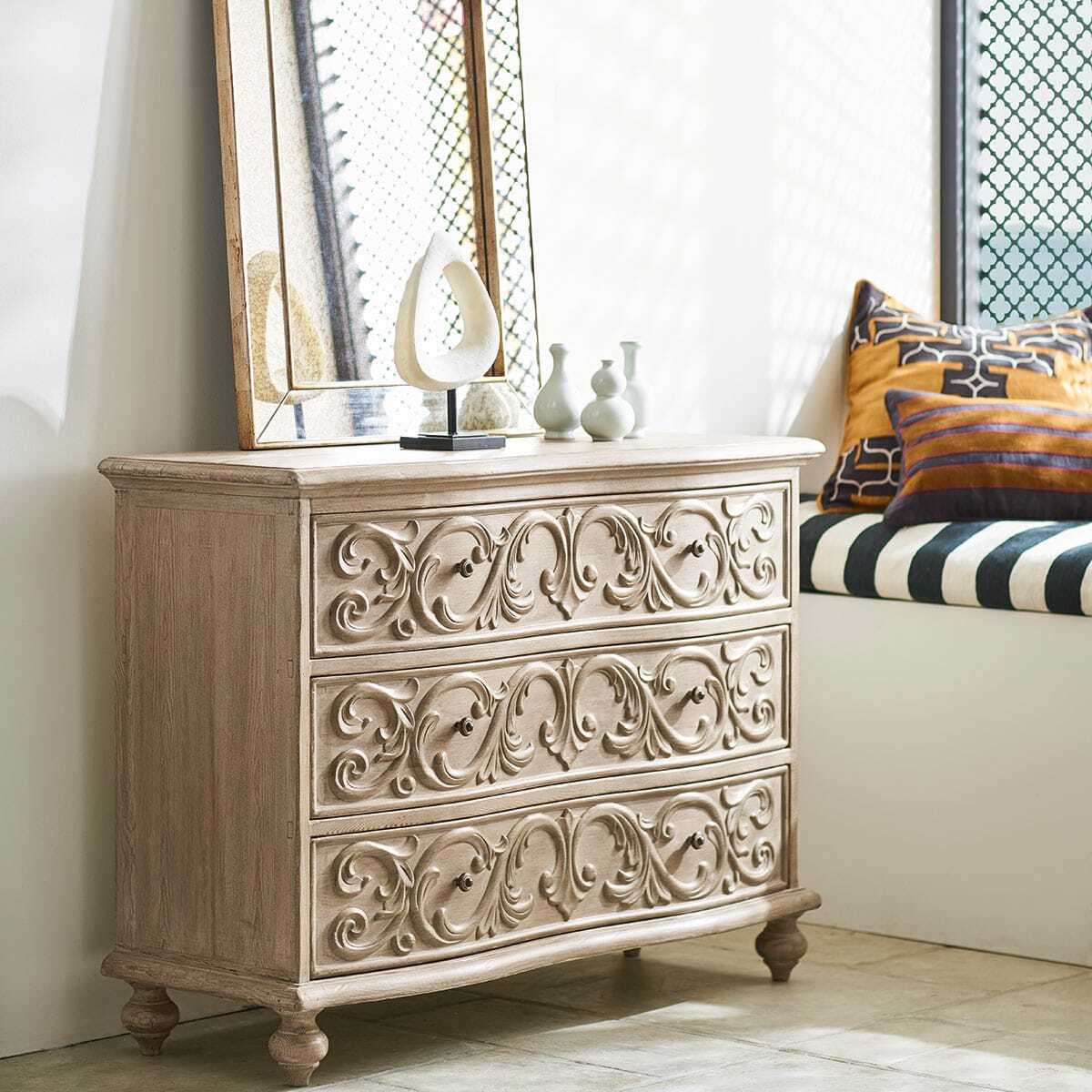 I love this piece for its versatile, timeless appeal and the subtle grey wash finish that adds a touch of understated elegance. It works well in both contemporary and rustic interiors, providing a soft contrast to bold colours or complementing a neutral palette. Practical styling tips include pairing it with vintage accessories or modern lamp lighting to create an inviting atmosphere. It’s ideal for bedrooms or living spaces where you want to combine function with a classic aesthetic, and its detailed carvings lend a bit of visual interest without overwhelming the room. Keep accessories minimal on its surface to let the craftsmanship shine, and consider using decorative storage baskets inside to maximise organisation.
