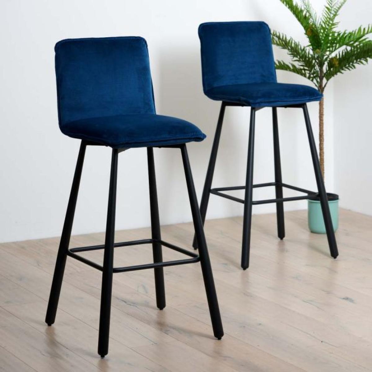 Bring some retro styling to the table with the Drummond barstool. Featuring a rich velvet design of dark blue accompanied with four sturdy legs below it which join together with a horizontal bar providing you with a place to rest your feet. Also available in grey and pink. Sold as a set of 2 chairsW40.5cm x D45cm x H105 Seat Height 76cm. Simple self assembly