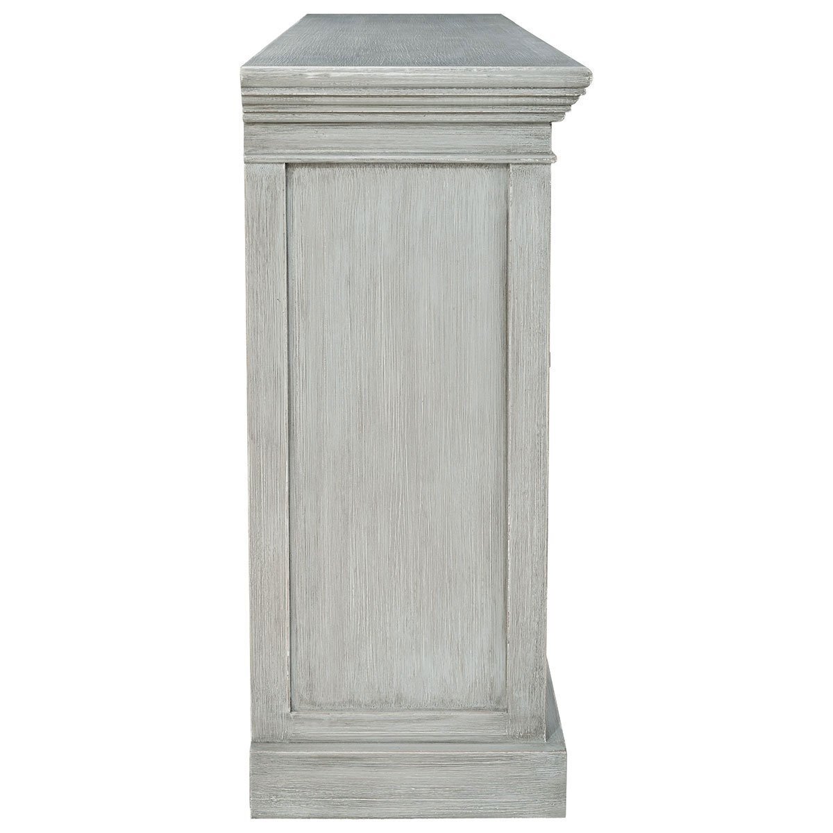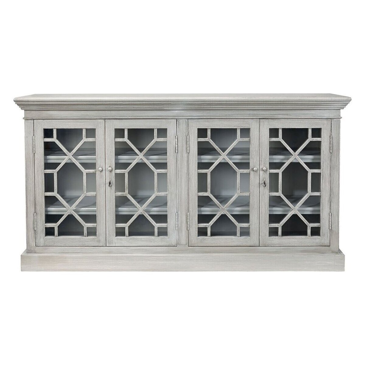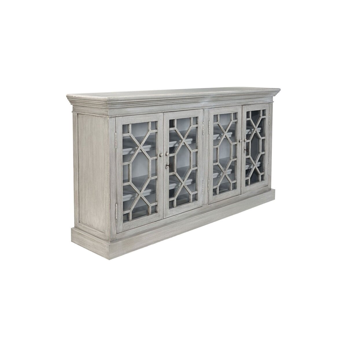 A stylish and useful sideboard featuring four adjustable shelves and glass fronted (lockable) doors, decorated with a geometric pattern. Painted to a dragged, Flannel Grey finish, our Drummond Sideboard would be the perfect home for all your dining accoutrements, or for hiding away your collection of DVDs. Please note that this sideboard comes with antiqued brass handles, locks and escutcheons, not the painted ones illustrated here.