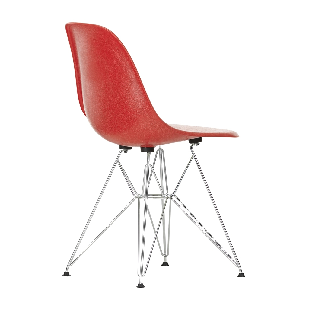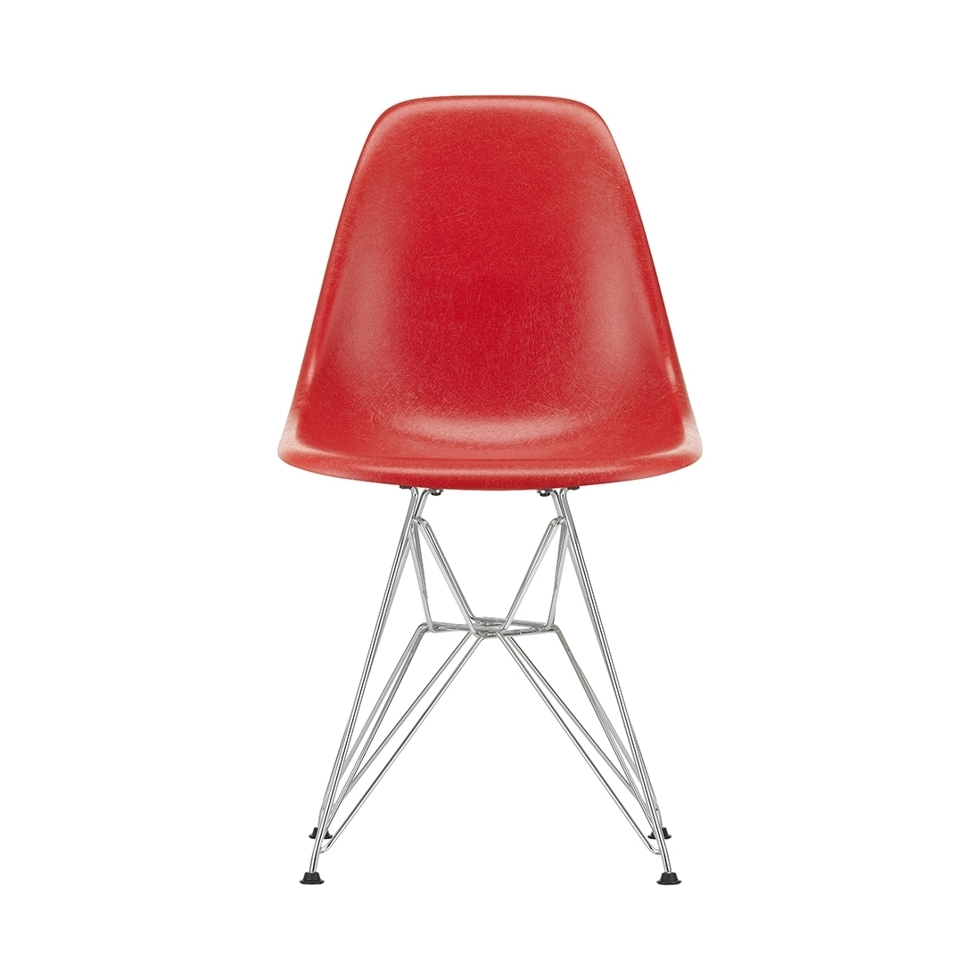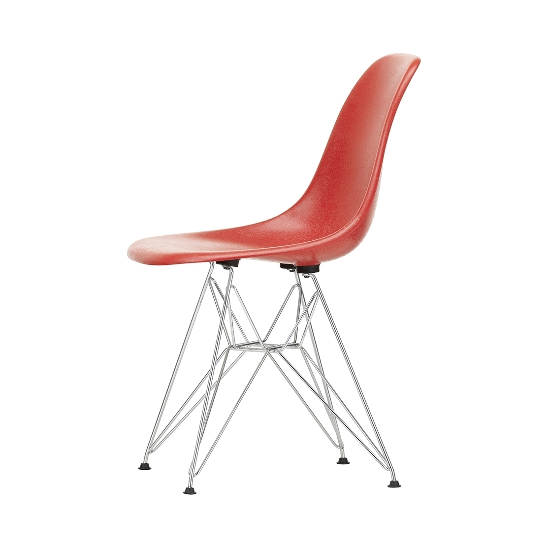 This edition of Charles and Ray Eames' DSR Fiberglass Side Chair for Vitra features a chrome base and a red seat. Now referred to as 'The Chair of a Century', the DSR Chair's shell displays the characteristic irregular surface of fibreglass, which appears almost like a natural material thanks to its visible fibres. Originally launched in 1950, the Fiberglass Chair Collection introduced the idea of the multifunctional chair, featuring shells that could be combined with a variety of bases, and soon became one of the best-known furniture pieces of the twentieth century. An organic and contemporary form, the seat rests upon a striking chromed wire 'Eiffel' base with cross struts and features rubber shock mounts to support longer periods of sitting down. In continual development for the modern user, Vitra has revised the geometry of the seat to achieve optimum ergonomics and comfort.