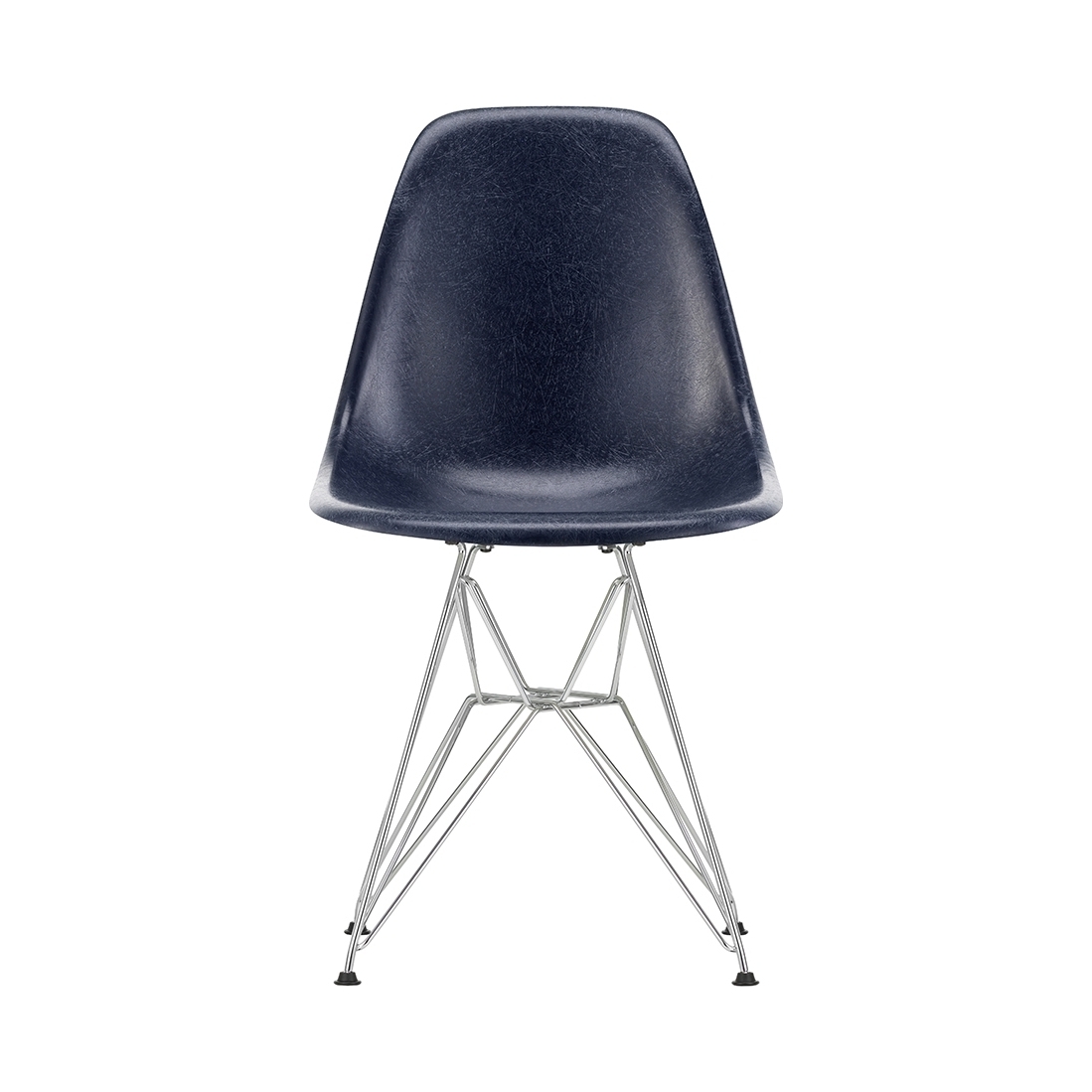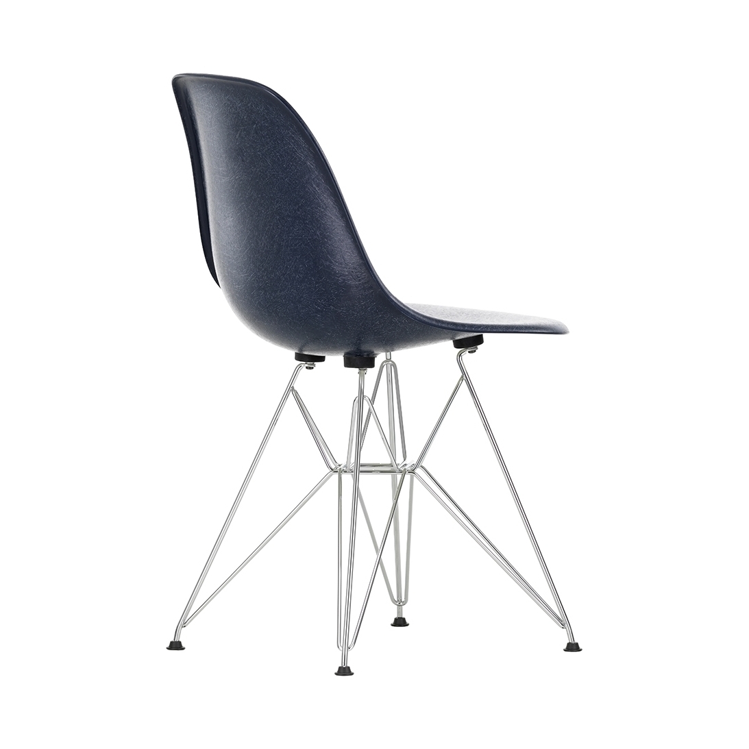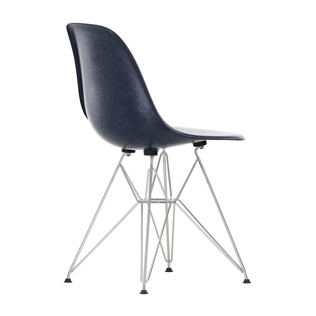 This edition of Charles and Ray Eames' DSR Fiberglass Side Chair for Vitra features a chrome base and a navy-blue seat. Originally launched in 1950, the Fiberglass Chair Collection introduced the idea of the multifunctional chair, featuring shells that could be combined with a variety of bases, and soon became one of the best-known furniture pieces of the twentieth century. Now referred to as 'The Chair of a Century', the DSR Chair's shell displays the characteristic irregular surface of fibreglass, which appears almost like a natural material thanks to its clearly visible fibres. An organic yet contemporary form, the seat rests upon a striking chrome wire 'Eiffel' base with cross struts and features rubber shock mounts to support longer periods of sitting down. In continual development for the modern user, Vitra has revised the geometry of the seat to achieve optimum ergonomics and comfort.