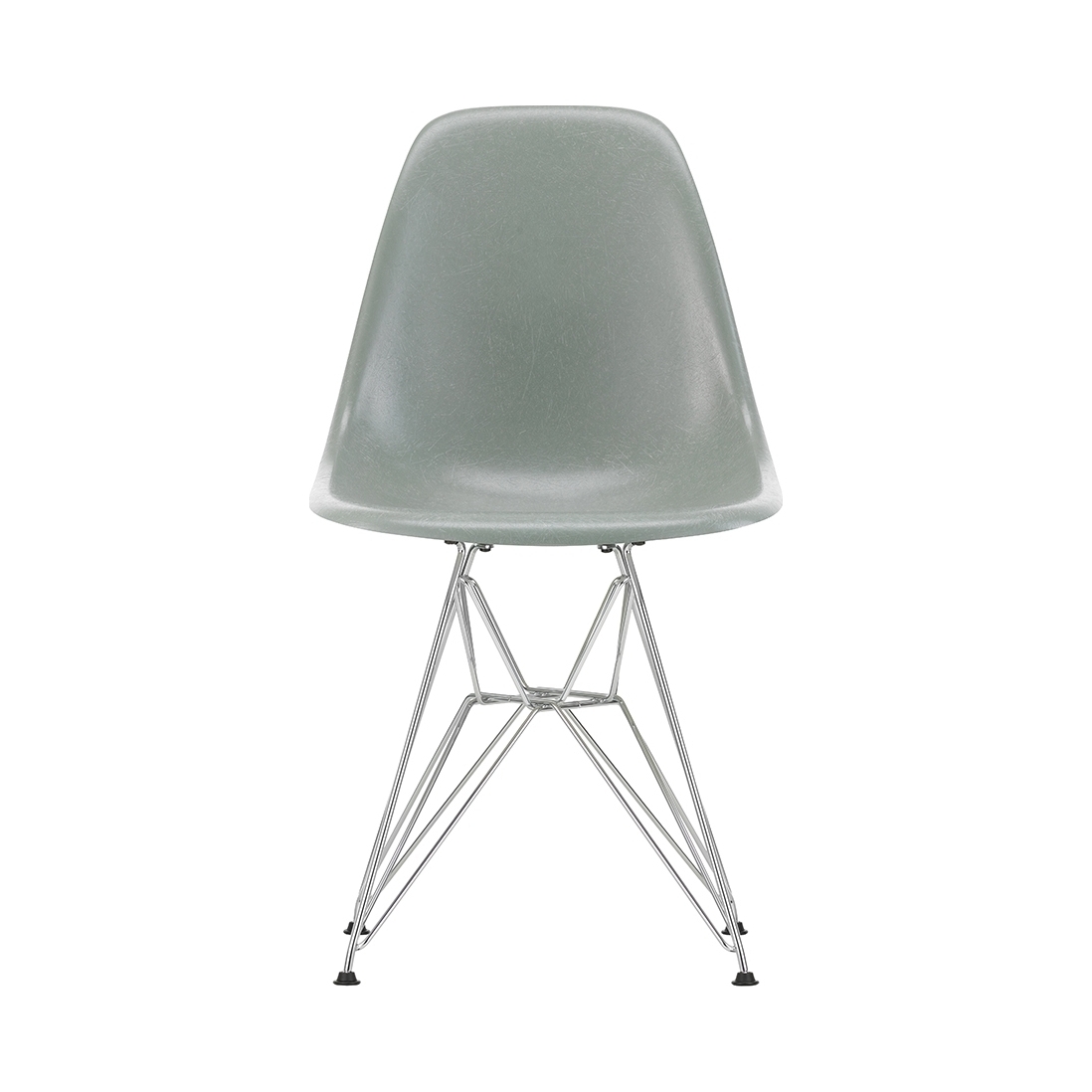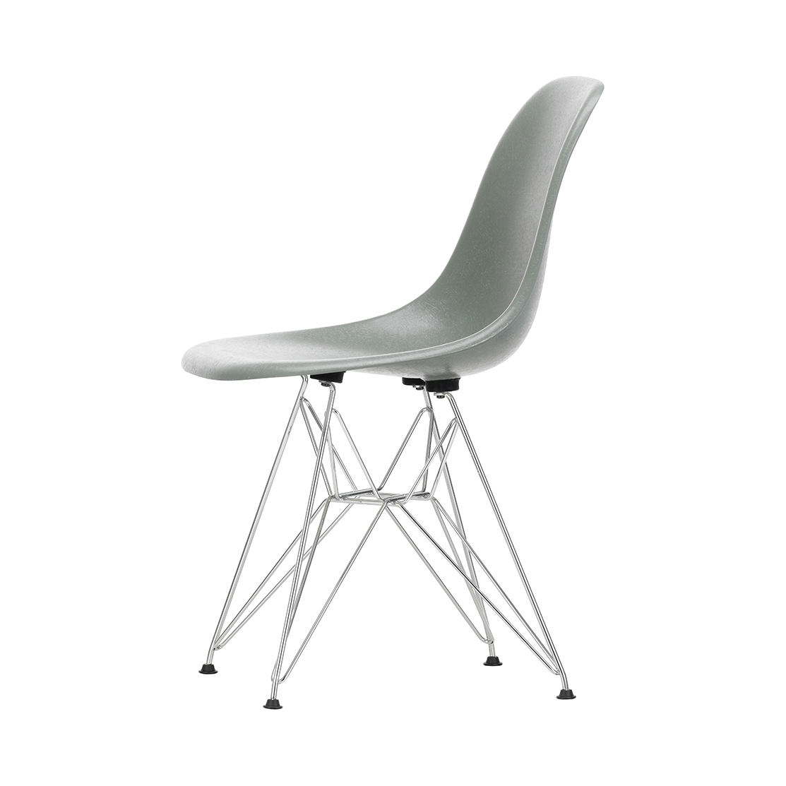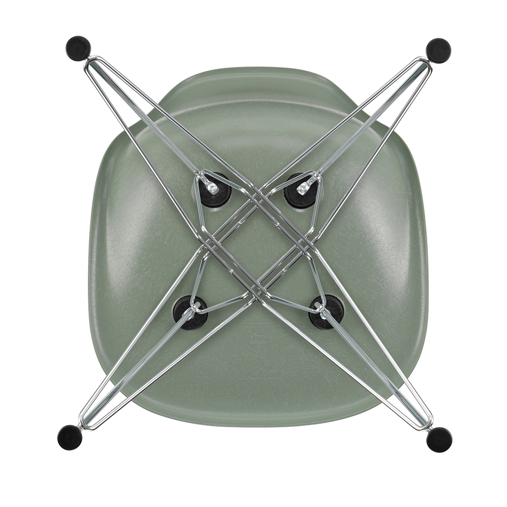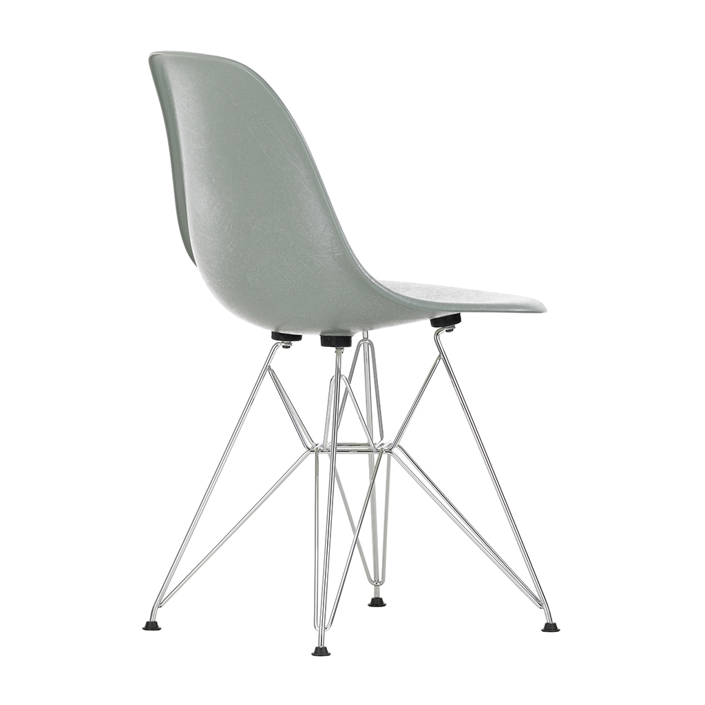 This edition of Charles and Ray Eames' DSR Fiberglass Side Chair for Vitra features a chrome base and a green seat. Originally launched in 1950, the Fiberglass Chair Collection introduced the idea of the multifunctional chair, featuring shells that could be combined with a variety of bases, and soon became one of the best-known furniture pieces of the twentieth century. Now referred to as 'The Chair of a Century', the DSR Chair's shell displays the characteristic irregular surface of fibreglass, which appears almost like a natural material thanks to its clearly visible fibres. An organic yet contemporary form, the seat rests upon a striking chrome wire 'Eiffel' base with cross struts and features rubber shock mounts to support longer periods of sitting down. In continual development for the modern user, Vitra has revised the geometry of the seat to achieve optimum ergonomics and comfort.