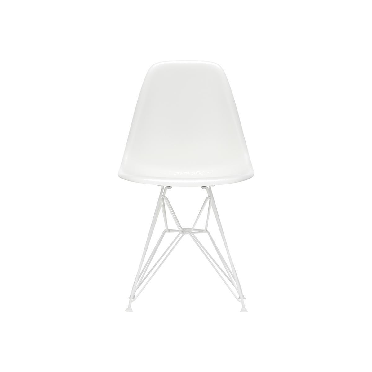 The DSR Plastic Side Chair by Charles and Ray Eames for Vitra showcases the signature 'Eiffel' base, refreshed with white powder coating for 2020.An instantly recognisable piece, the outdoor-friendly chair features a recyclable dyed-through polypropylene shell for greater comfort. It is seated on a chromed wire base with cross struts and rubber shock mounts for support and stability. The first industrially produced plastic chair, the DSR's organic shape led to its legendary status and universal appeal. Updated in 2016, Vitra added 2cm to the height of the chair and revised the geometry of the seat for optimal ergonomics.