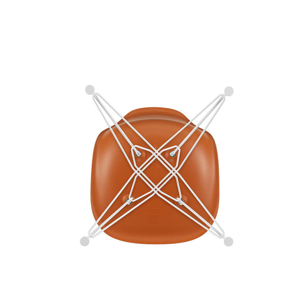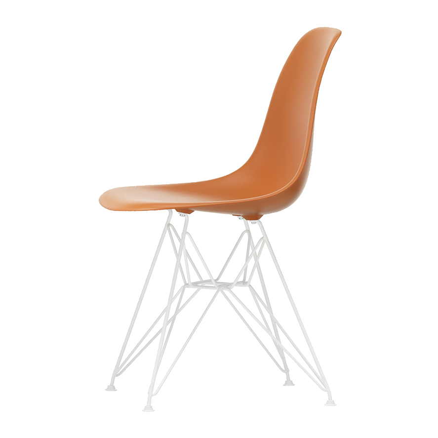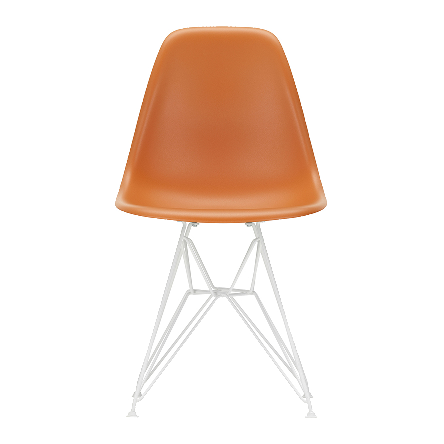 The DSR Plastic Side Chair by Charles and Ray Eames for Vitra showcases the signature 'Eiffel' base, refreshed with white powder coating for 2020.An instantly recognisable piece, the outdoor-friendly chair features a recyclable dyed-through polypropylene shell for greater comfort. It is seated on a chromed wire base with cross struts and rubber shock mounts for support and stability. The first industrially produced plastic chair, the DSR's organic shape led to its legendary status and universal appeal. Updated in 2016, Vitra added 2cm to the height of the chair and revised the geometry of the seat for optimal ergonomics.