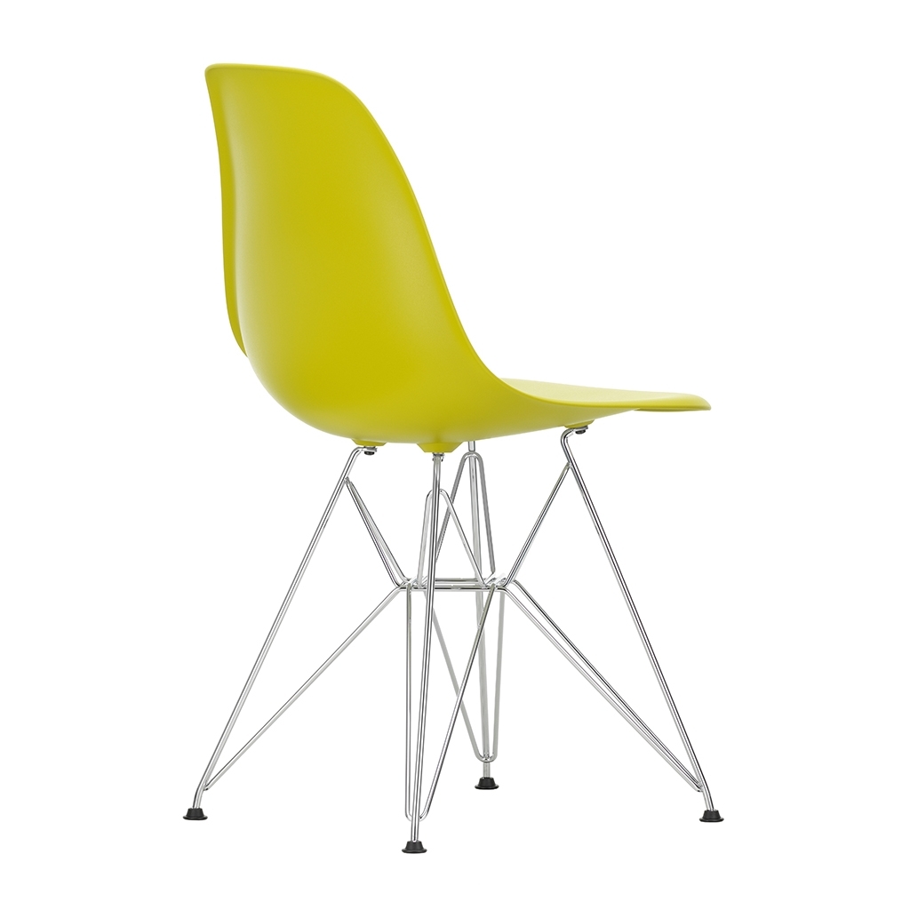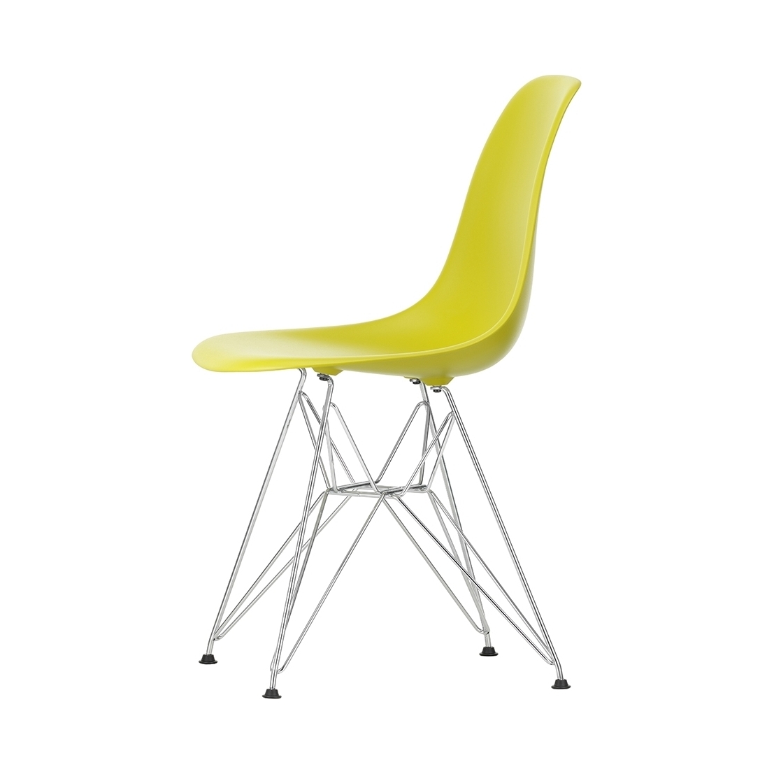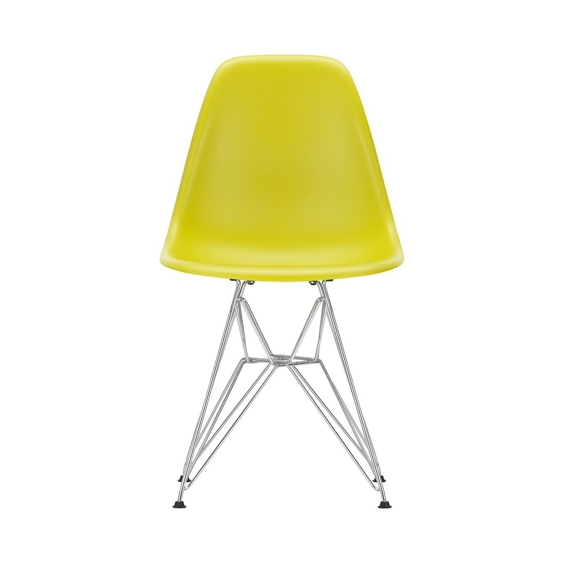 Designed in 1950 by iconic duo Charles and Ray Eames, the DSR Plastic Side Chair is an instantly recognisable piece, showcasing the signature 'Eiffel' chrome base and a vibrant mustard seat. Crafted from recyclable dyed-through polypropylene for greater comfort, the seat sits on a striking chromed wire base with cross struts and features rubber shock mounts to support longer periods of sitting down. The first industrially produced plastic chair, the DSR Chair has a simple and organic shape that has led to its legendary status and universal appeal. Updated in 2016, Vitra added 2cm to the height of the chair and revised the geometry of the seat for optimum ergonomics and comfort.