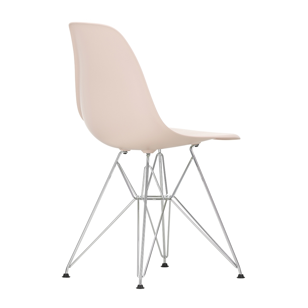 Designed in 1950 by iconic duo Charles and Ray Eames for Vitra, the DSR Plastic Side Chair in pale rose showcases the signature 'Eiffel' chrome base and features a refreshed colour palette that pays homage to the model's original colour history while acknowledging the aspirations of the future. Crafted from recyclable dyed-through polypropylene for greater comfort, the seat sits on a striking chromed wire base with cross struts and features rubber shock mounts to support longer periods of sitting down. The first industrially produced plastic chair, the DSR Chair has a simple and organic shape that has led to its legendary status and universal appeal. Updated in 2016, Vitra added 2cm to the height of the chair and revised the geometry of the seat for optimum ergonomics and comfort.