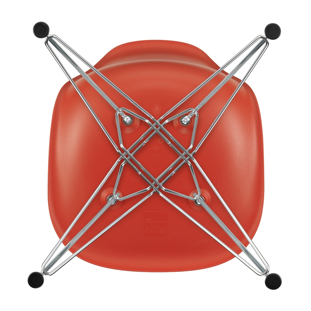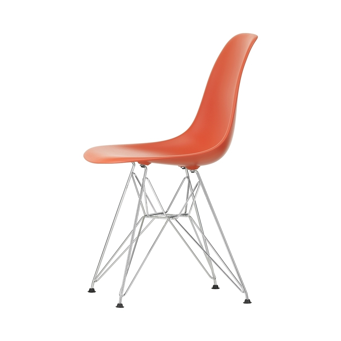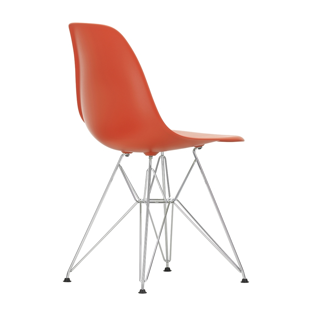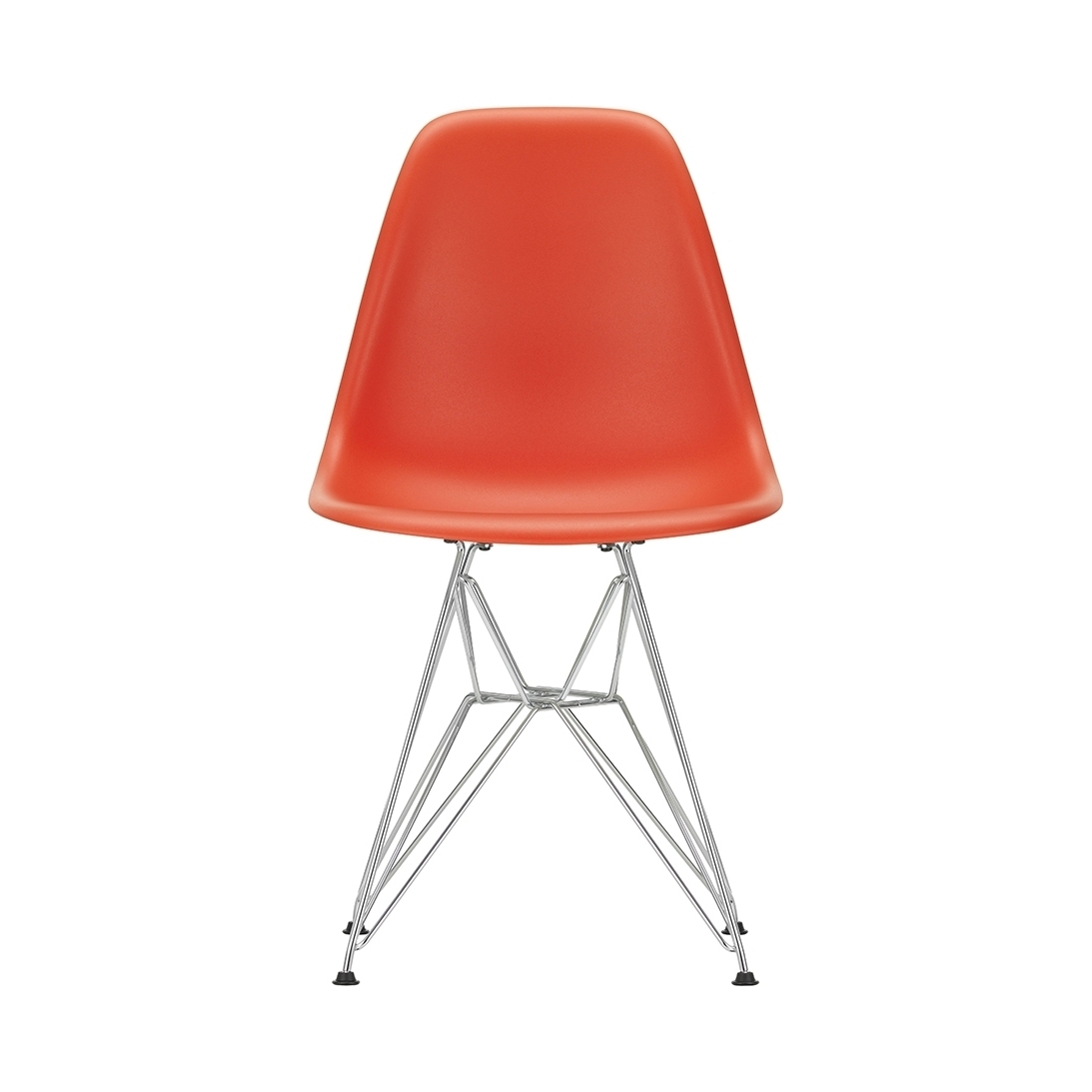 Designed in 1950 by iconic duo Charles and Ray Eames for Vitra, the DSR Plastic Side Chair is an instantly recognisable piece, showcasing the signature ‘Eiffel’ chrome base and a minimalist seat. Crafted from recyclable dyed-through polypropylene for greater comfort, the seat sits on a striking chromed wire base with cross struts and features rubber shock mounts to support longer periods of sitting down. The first industrially produced plastic chair, the DSR Chair has a simple and organic shape that has led to its legendary status and universal appeal. Updated in 2016, Vitra added 2cm to the height of the chair and revised the geometry of the seat for optimum ergonomics and comfort.