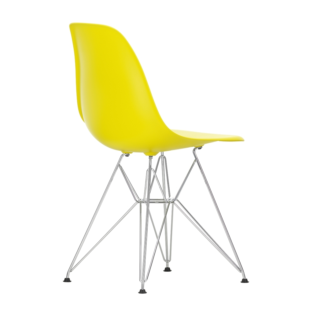 Designed in 1950 by iconic duo Charles and Ray Eames for Vitra, the DSR Plastic Side Chair in sunlight yellow showcases the signature 'Eiffel' chrome base and features a refreshed colour palette that pays homage to the model's original colour history while acknowledging the aspirations of the future. Crafted from recyclable dyed-through polypropylene for greater comfort, the seat sits on a striking chromed wire base with cross struts and features rubber shock mounts to support longer periods of sitting down. The first industrially produced plastic chair, the DSR Chair has a simple and organic shape that has led to its legendary status and universal appeal. Updated in 2016, Vitra added 2cm to the height of the chair and revised the geometry of the seat for optimum ergonomics and comfort.