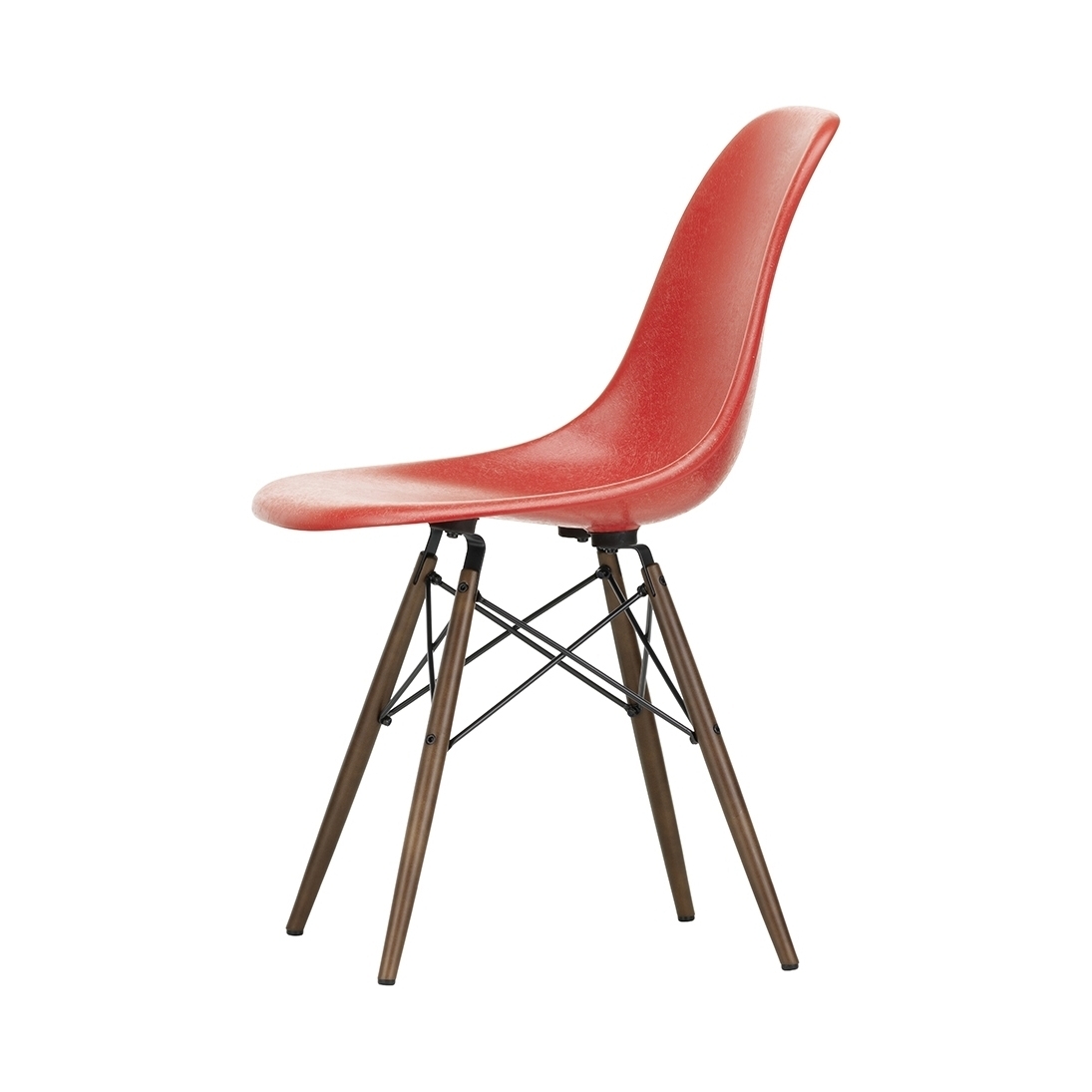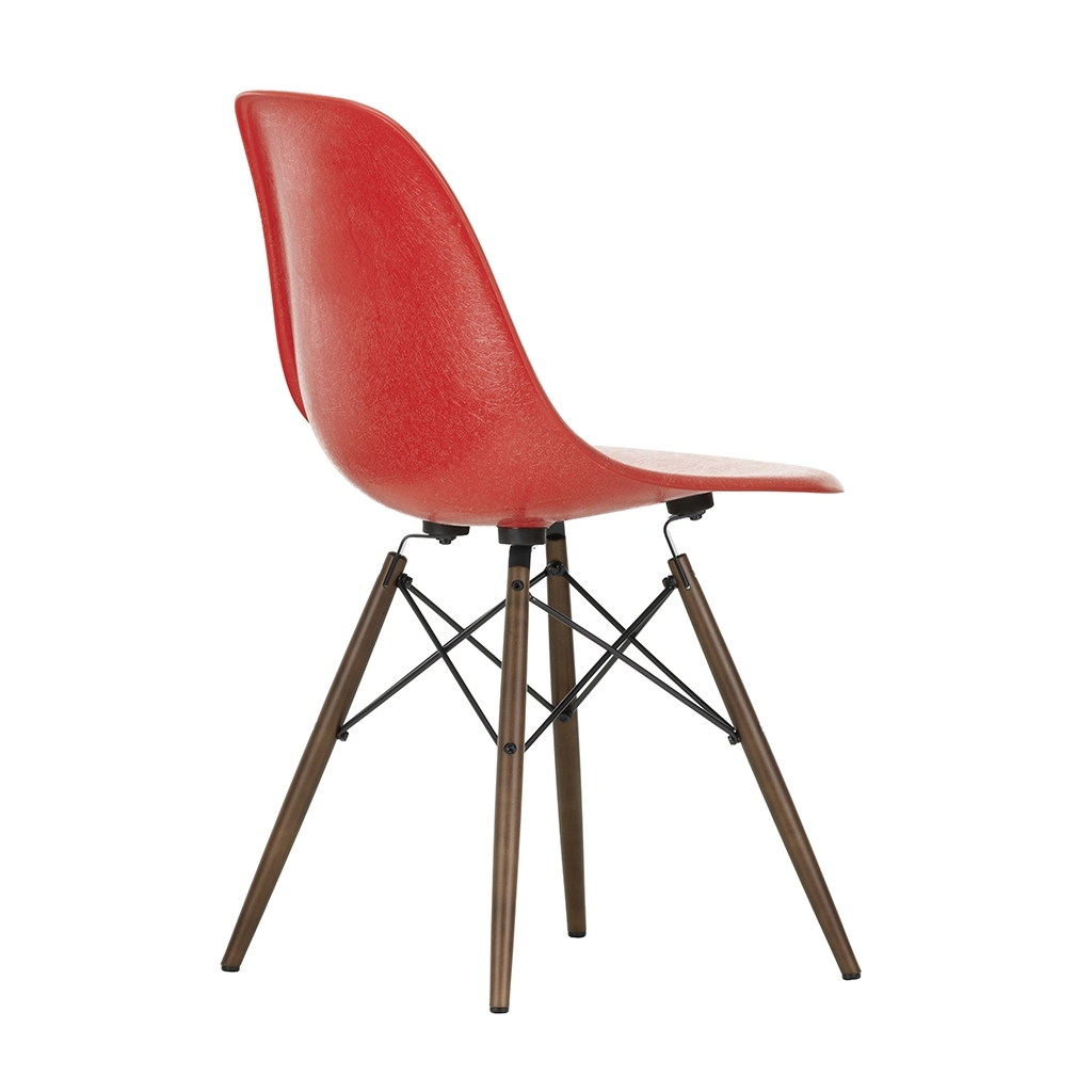Showcasing a classic red-hued seat and a dark maple base, Charles and Ray Eames' DSW Fiberglass Side Chair is being specially re-released by Vitra, having not been produced since the 1990s. Originally launched in 1950, the Fiberglass Chair Collection introduced the idea of the multifunctional chair, featuring shells that could be combined with a variety of bases, and soon became one of the best-known furniture pieces of the twentieth century. The DSW Chair's shell displays the characteristic irregular surface of Fiberglass, which appears almost like a natural material thanks to its clearly visible fibres. An organic yet contemporary form, the seat rests upon a solid dark maple base with steel 'Eiffel' cross struts and features rubber shock mounts to support longer periods of sitting down. In continual development for the modern user, Vitra has revised the geometry of the seat to achieve optimum ergonomics and comfort.