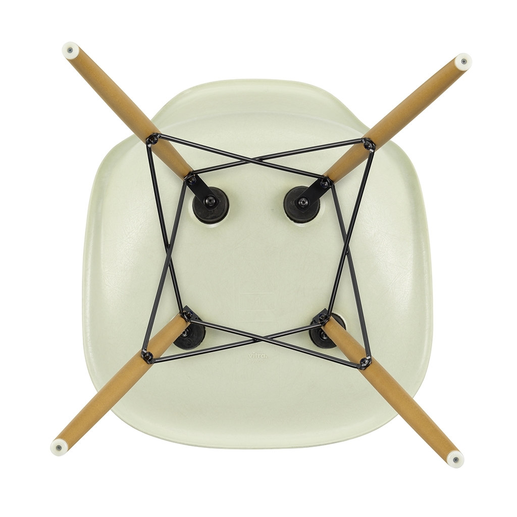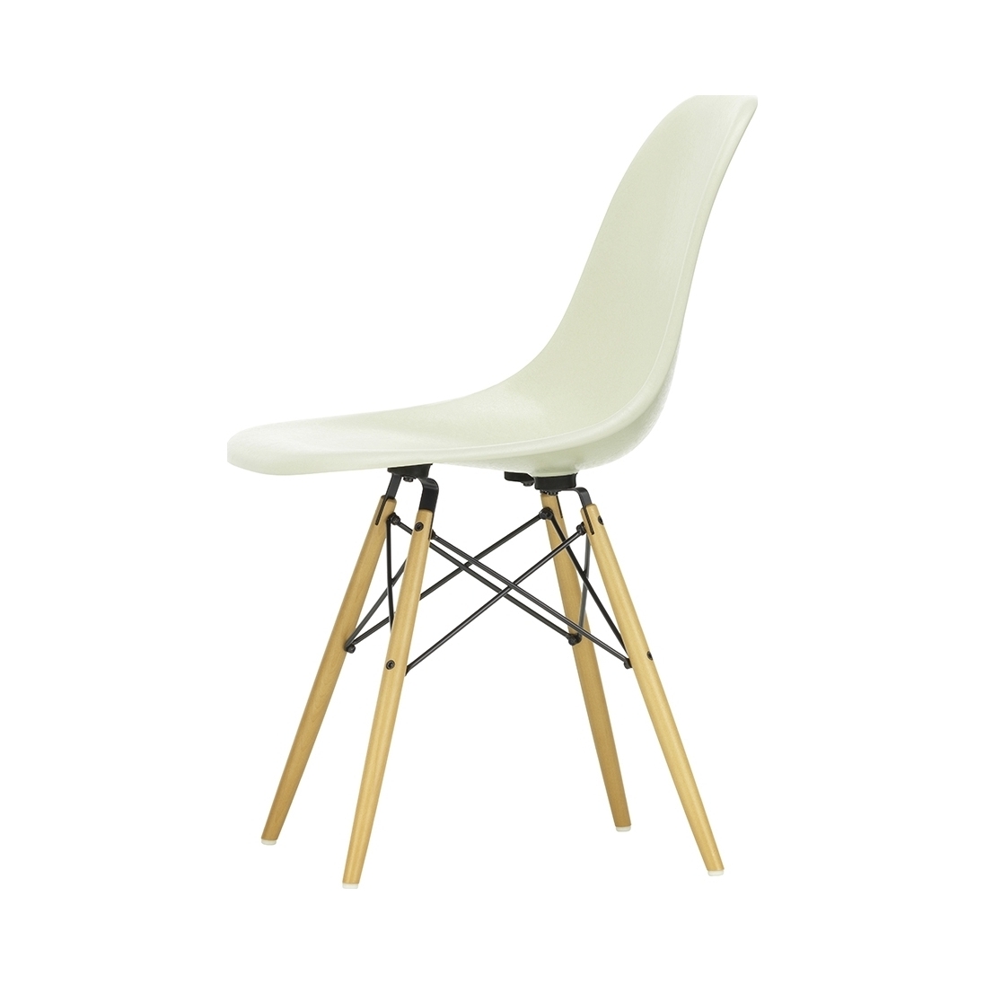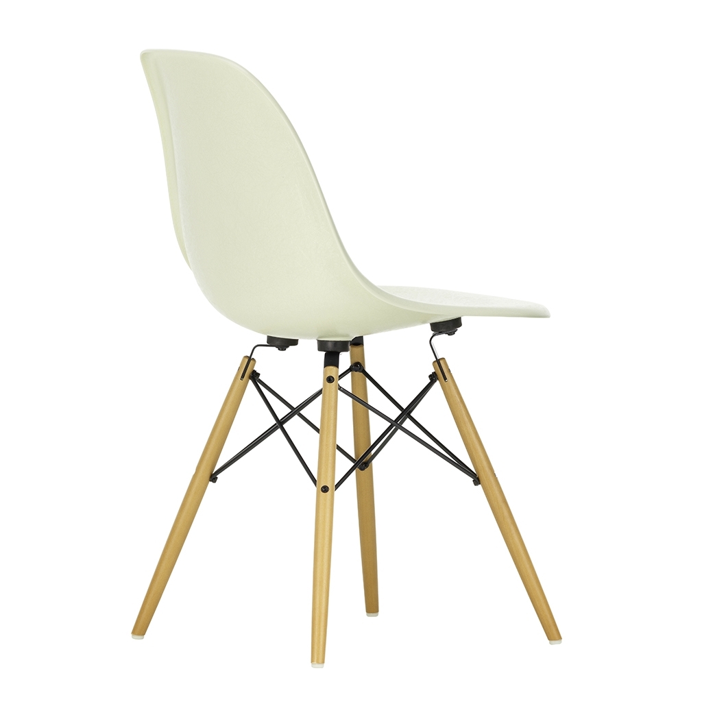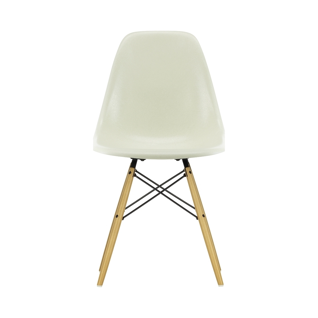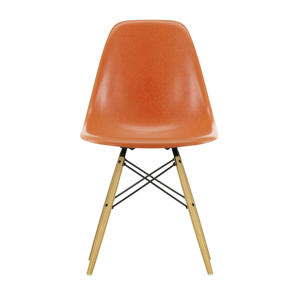 Presented in a range of vibrant hues, Charles and Ray Eames’ DSW Fiberglass Side Chair for Vitra also features a golden maple base. Originally launched in 1950, the Fiberglass Chair Collection introduced the idea of the multifunctional chair, featuring shells that could be combined with a variety of bases, and soon became one of the best-known furniture pieces of the twentieth century. Now referred to as ‘The Chair of a Century’, the DSW Chair’s shell displays the characteristic irregular surface of fibreglass, which appears almost like a natural material thanks to its clearly visible fibres. An organic yet contemporary form, the seat rests upon a solid golden maple base with steel ‘Eiffel’ cross struts and features rubber shock mounts to support longer periods of sitting down. In continual development for the modern user, Vitra has revised the geometry of the seat to achieve optimum ergonomics and comfort.