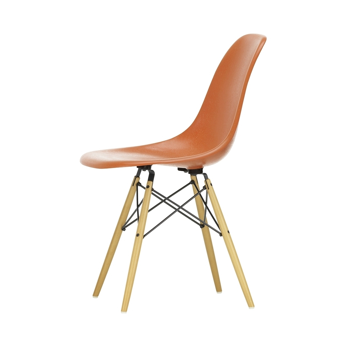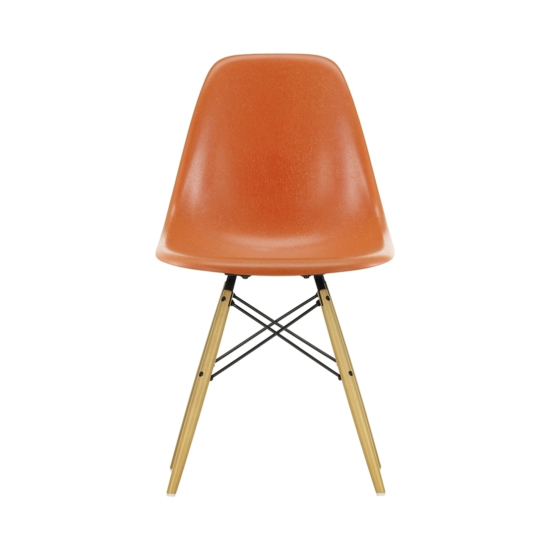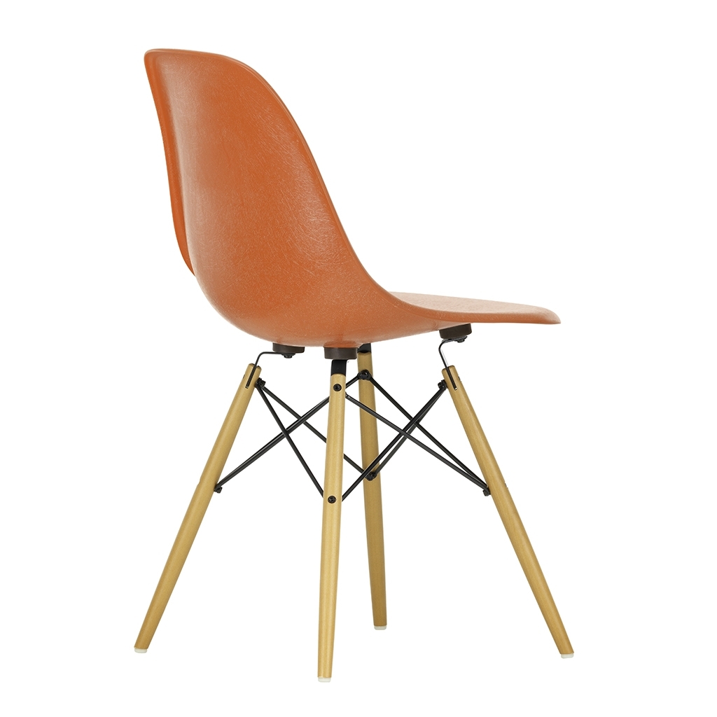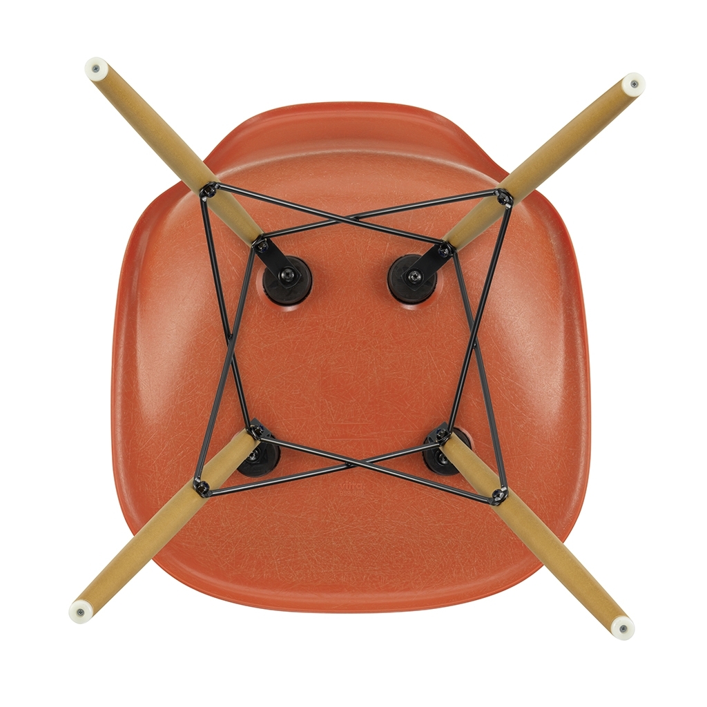 This edition of Charles and Ray Eames' DSW Fiberglass Side Chair for Vitra features a golden maple base and a red-hued seat. Originally launched in 1950, the Fiberglass Chair Collection introduced the idea of the multifunctional chair, featuring shells that could be combined with a variety of bases, and soon became one of the best-known furniture pieces of the twentieth century. Now referred to as 'The Chair of a Century', the DSW Chair's shell displays the characteristic irregular surface of fibreglass, which appears almost like a natural material thanks to its clearly visible fibres. An organic yet contemporary form, the seat rests upon a solid golden maple base with steel 'Eiffel' cross struts and features rubber shock mounts to support longer periods of sitting down. In continual development for the modern user, Vitra has revised the geometry of the seat to achieve optimum ergonomics and comfort.