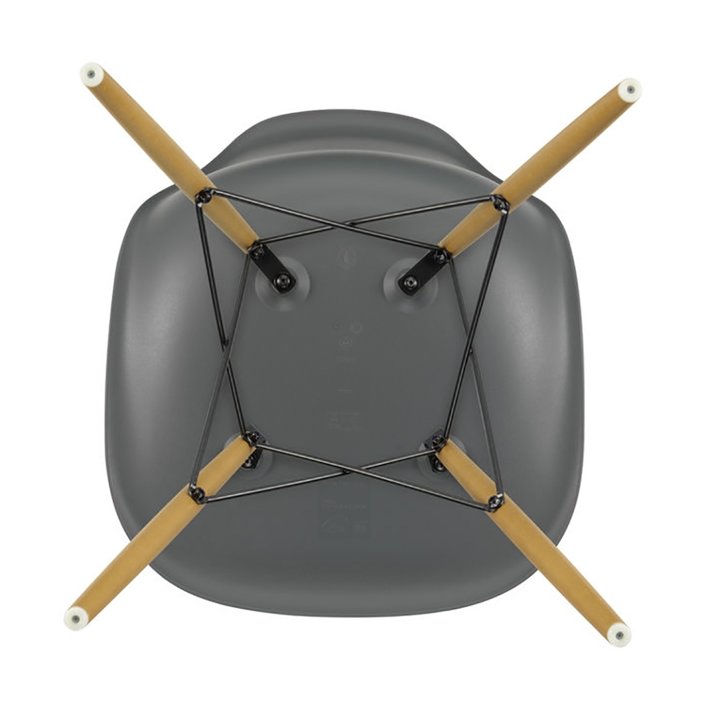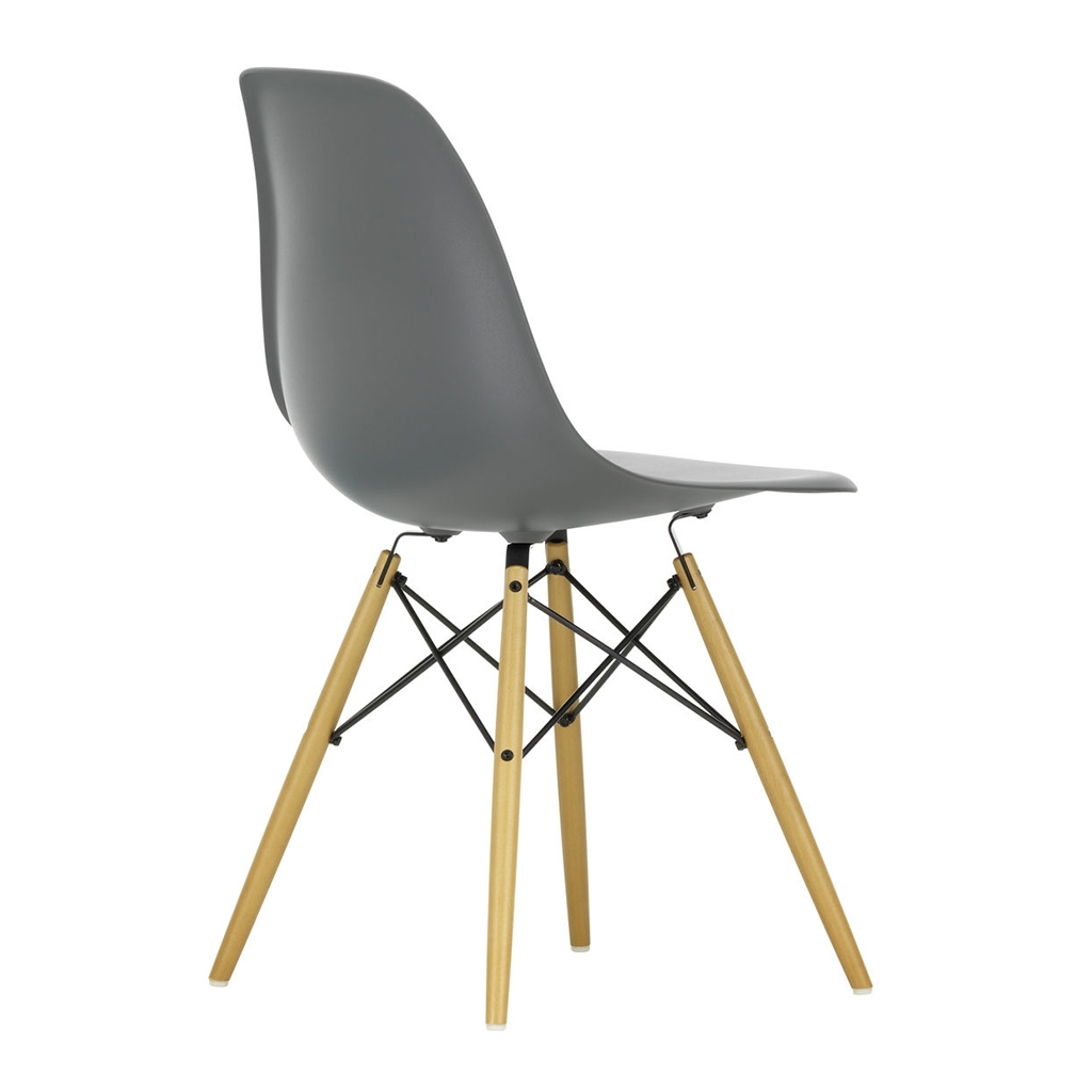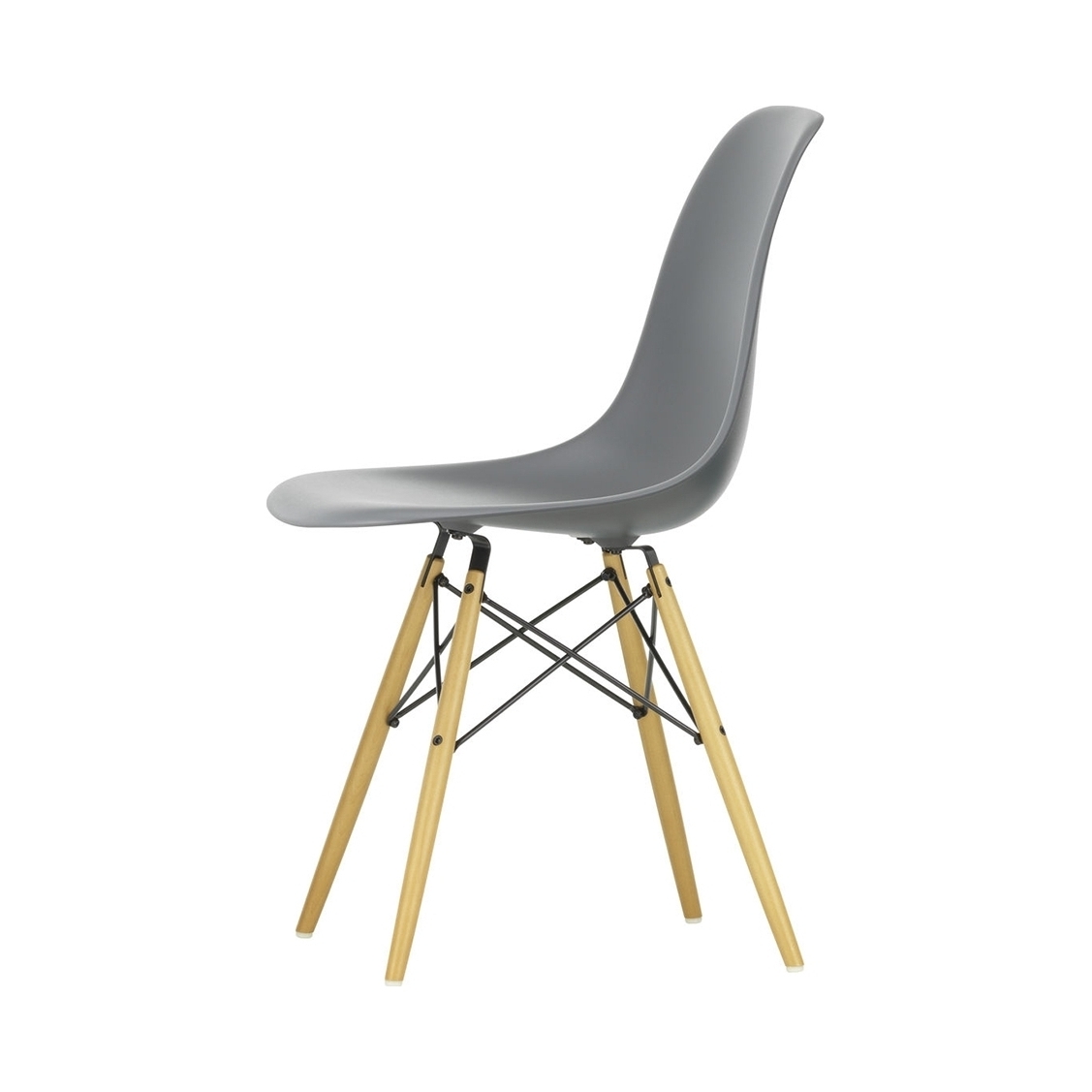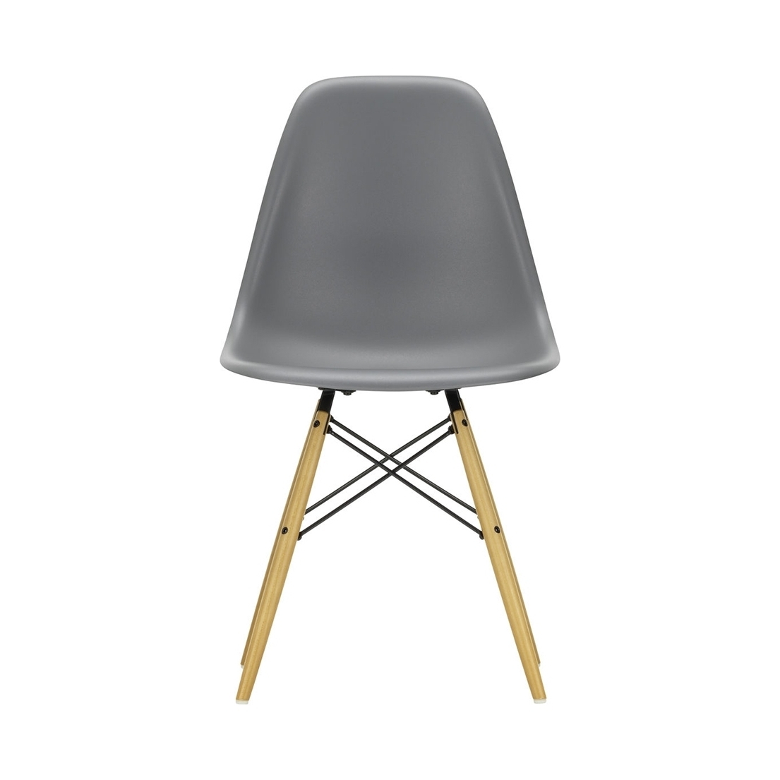 Designed in 1950 by iconic duo Charles and Ray Eames for Vitra, the DSW Plastic Side Chair in granite grey is an instantly recognisable piece, showcasing the signature golden maple 'Eiffel' base, minimalist seat and a refreshed colour palette that pays homage to the model's original colour history while acknowledging aspirations of the future. Crafted from recyclable dyed-through polypropylene for greater comfort, the seat sits on a striking solid maple wood and wire base with cross struts and features rubber shock mounts to support longer periods of sitting down. The first industrially produced plastic chair, the DSW Chair has a simple and organic shape that has led to its legendary status and universal appeal. Updated in 2016, Vitra added 2cm to the height of the chair and revised the geometry of the seat for optimum ergonomics and comfort.