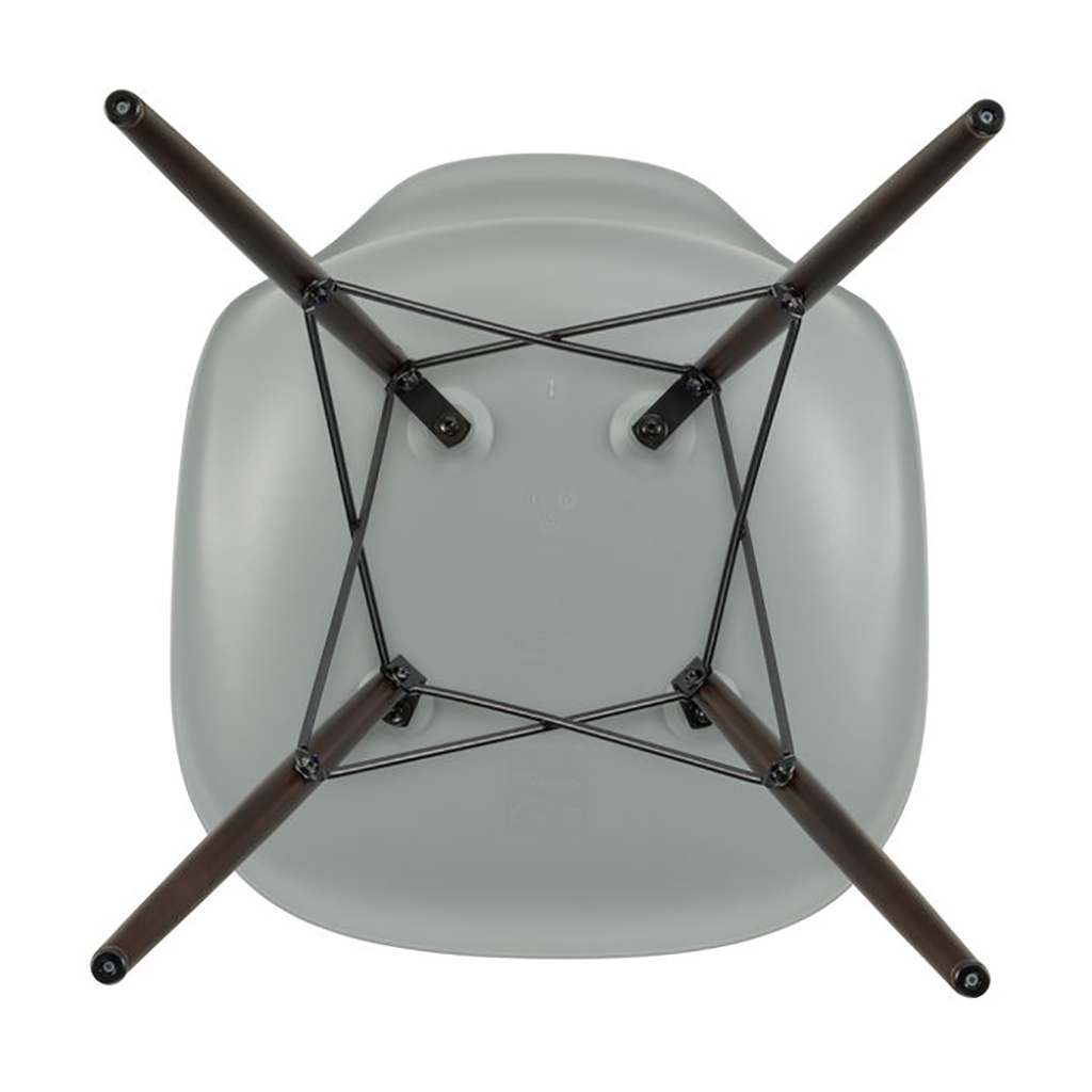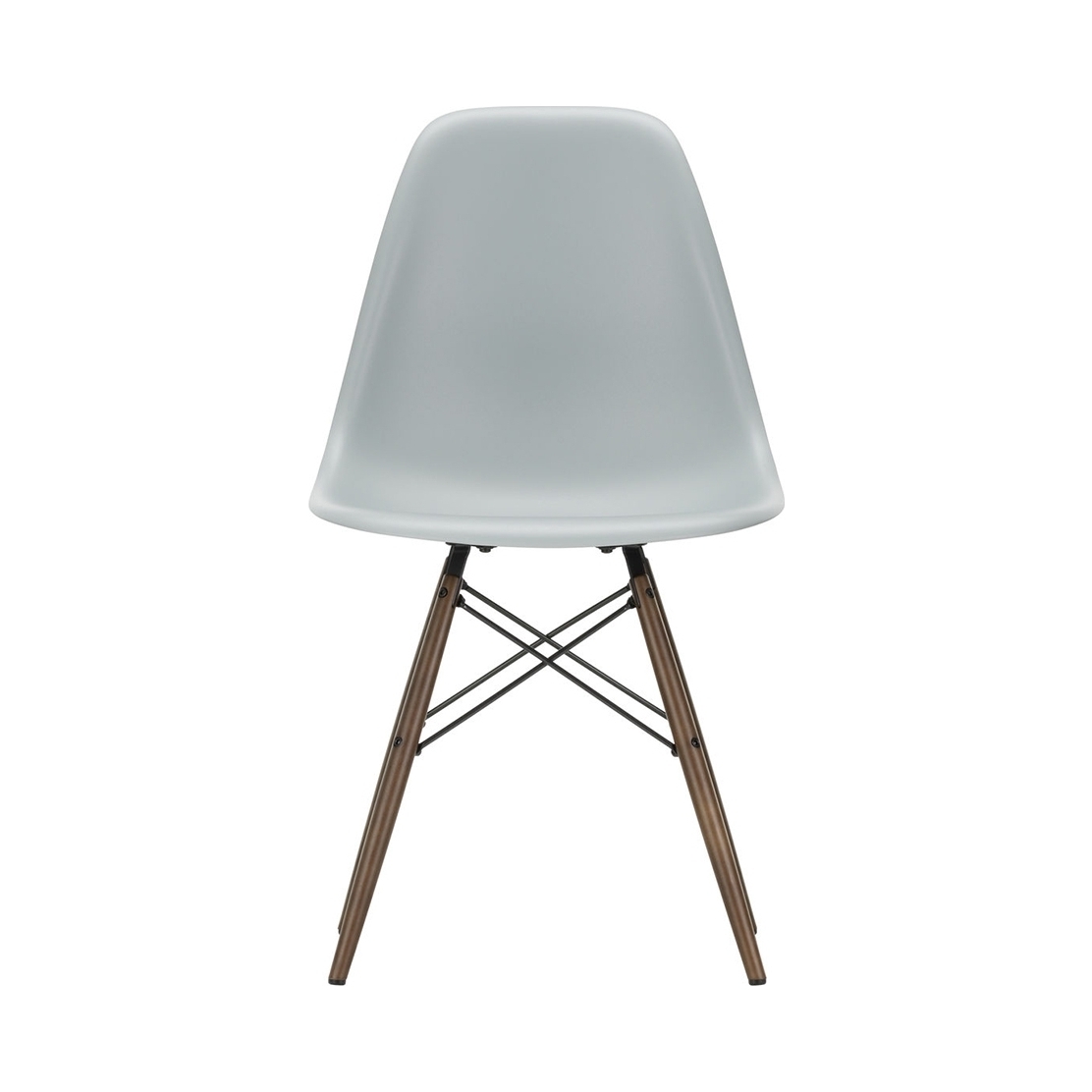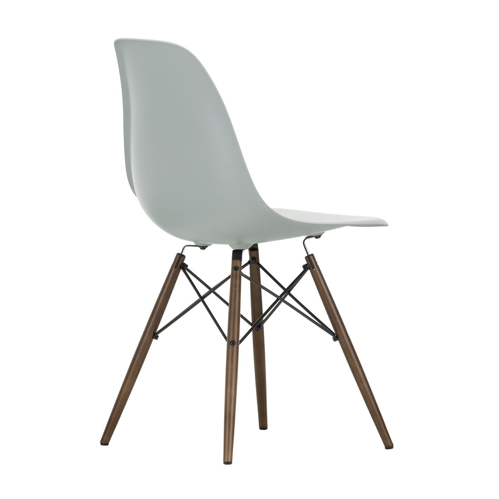 Designed in 1950 by iconic duo Charles and Ray Eames for Vitra, the DSW Plastic Side Chair in light grey is an instantly recognisable piece, showcasing the signature dark maple 'Eiffel' base, minimalist seat and a refreshed colour palette for 2019, paying homage to the model's original colour history while acknowledging aspirations of the future. Crafted from recyclable dyed-through polypropylene for greater comfort, the seat sits on a striking solid dark maple wood and wire base with cross struts and features rubber shock mounts to support longer periods of sitting down. The first industrially produced plastic chair, the DSW Chair has a simple and organic shape that has led to its legendary status and universal appeal. Updated in 2016, Vitra added 2cm to the height of the chair and revised the geometry of the seat for optimum ergonomics and comfort.