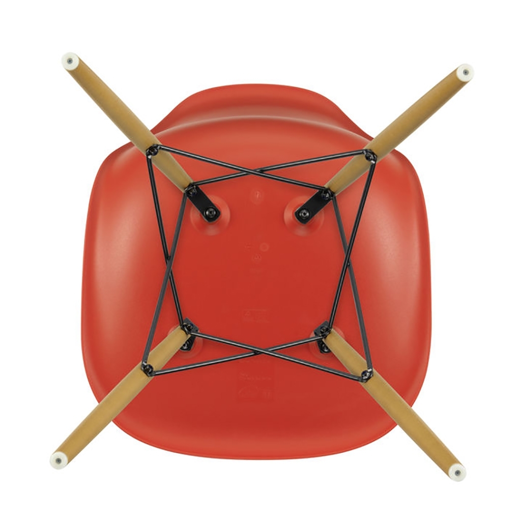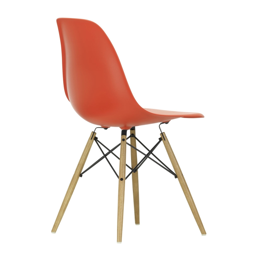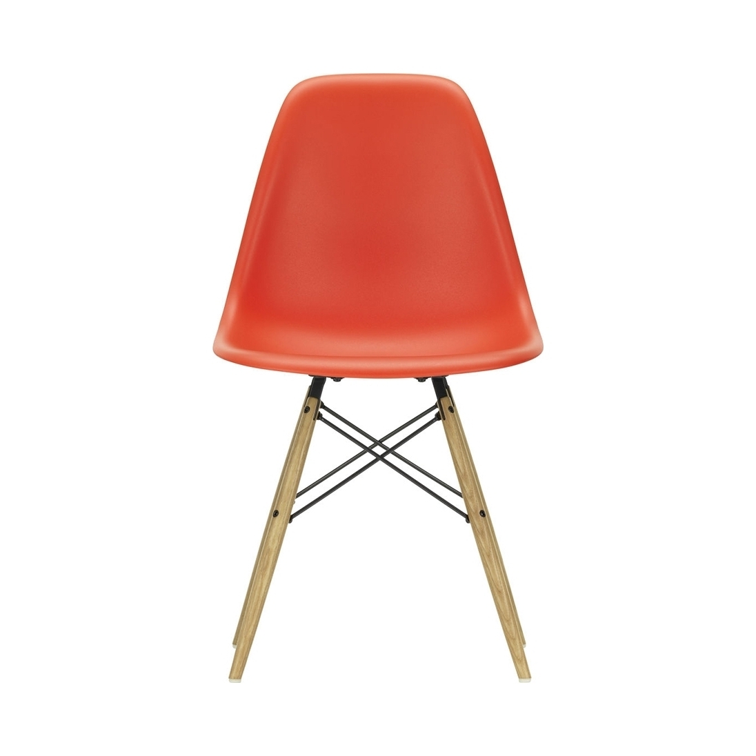 Designed in 1950 by iconic duo Charles and Ray Eames for Vitra, the DSW Plastic Side Chair in poppy red is an instantly recognisable piece, showcasing the signature 'Eiffel' base and honey-tone ash legs. Crafted from recyclable dyed-through polypropylene for greater comfort, the seat sits on a striking solid wood and wire base with cross struts and features rubber shock mounts to support longer periods of sitting down. The first industrially produced plastic chair, the DSW Chair has a simple and organic shape that has led to its legendary status and universal appeal. Updated in 2016, Vitra added 2cm to the height of the chair and revised the geometry of the seat for optimum ergonomics and comfort.