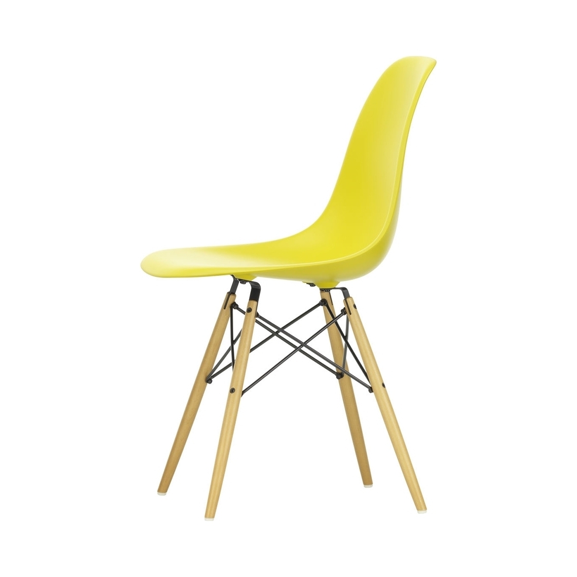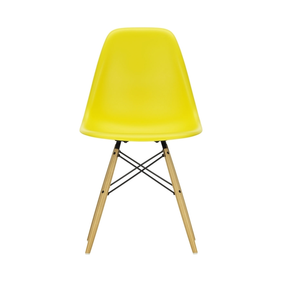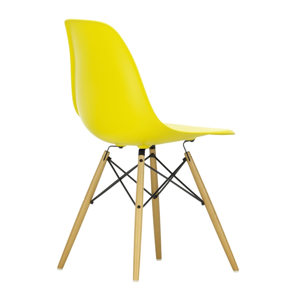 Designed in 1950 by iconic duo Charles and Ray Eames for Vitra, the DSW Plastic Side Chair in sunlight yellow is an instantly recognisable piece, showcasing the signature golden maple 'Eiffel' base, minimalist seat and a refreshed colour palette that pays homage to the model's original colour history while acknowledging aspirations of the future. Crafted from recyclable dyed-through polypropylene for greater comfort, the seat sits on a striking solid maple wood and wire base with cross struts and features rubber shock mounts to support longer periods of sitting down. The first industrially produced plastic chair, the DSW Chair has a simple and organic shape that has led to its legendary status and universal appeal. Updated in 2016, Vitra added 2cm to the height of the chair and revised the geometry of the seat for optimum ergonomics and comfort.