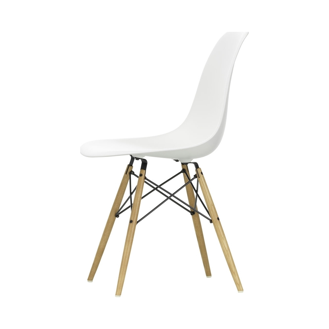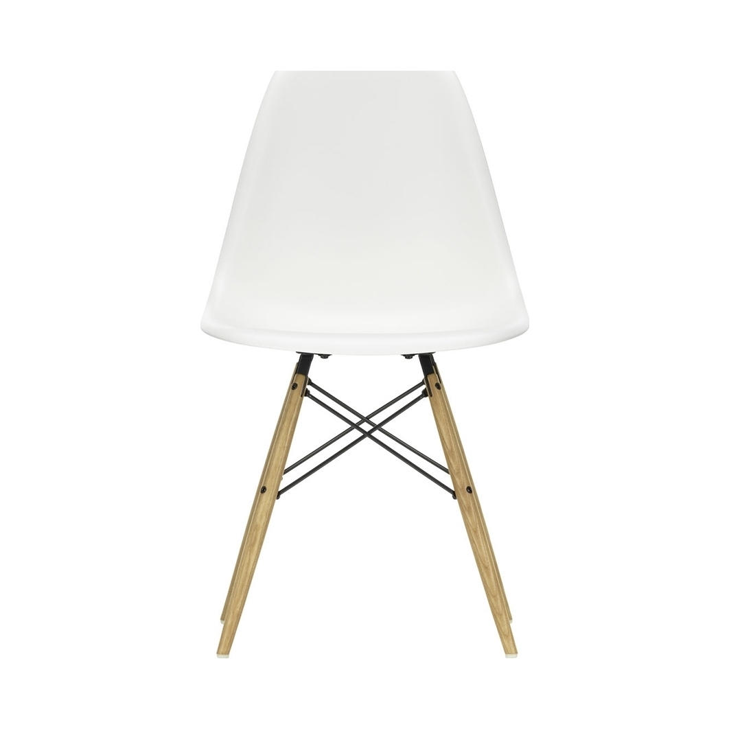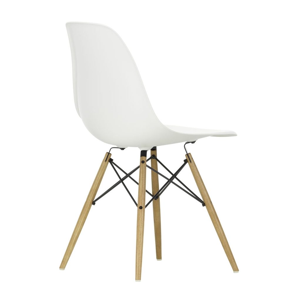 Designed in 1950 by iconic duo Charles and Ray Eames for Vitra, the DSW Plastic Side Chair in white is an instantly recognisable piece, showcasing the signature 'Eiffel' base and honey-tone ash legs. Crafted from recyclable dyed-through polypropylene for greater comfort, the seat sits on a striking solid wood and wire base with cross struts and features rubber shock mounts to support longer periods of sitting down. The first industrially produced plastic chair, the DSW Chair has a simple and organic shape that has led to its legendary status and universal appeal. Updated in 2016, Vitra added 2cm to the height of the chair and revised the geometry of the seat for optimum ergonomics and comfort.