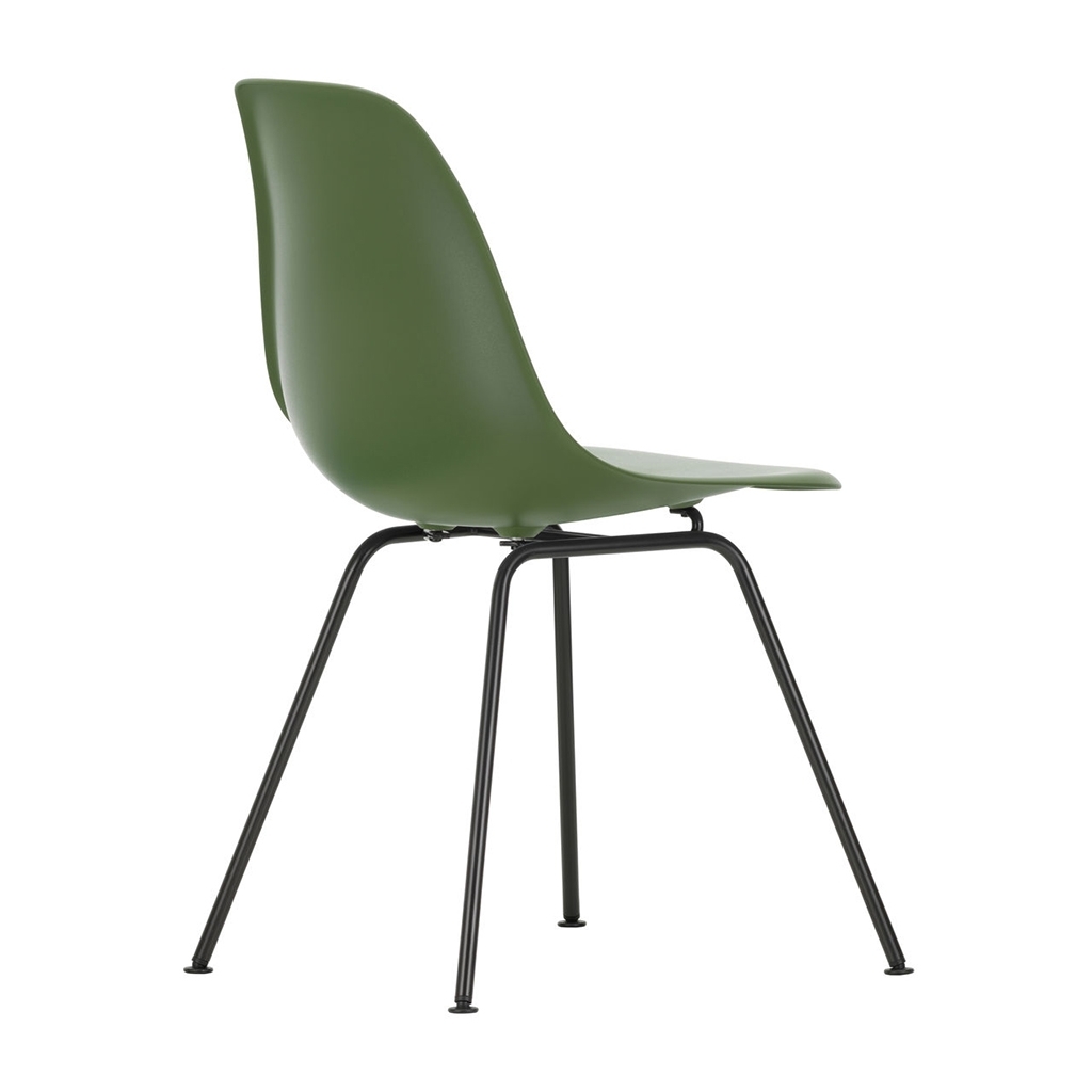 Presented in a forest-green hue with a dark base, Charles and Ray Eames' DSX Plastic Side Chair for Vitra is the most understated piece from the Plastic Chair Collection, now featuring a refreshed colour palette that pays homage to the model's original colour history while acknowledging future aspirations, Originally launched in 1950, the collection introduced the idea of the multifunctional chair, featuring shells that could be combined with a variety of bases, and soon became one of the best-known furniture pieces of the twentieth century. Now referred to as 'The Chair of a Century', the DSX Chair's shell is an organically-shaped, dyed-through polypropylene which rests upon a solid dark tubular steel base and features rubber shock mounts to support longer periods of sitting down. In continual development for the modern user, Vitra has revised the geometry of the seat to achieve optimum ergonomics and comfort.