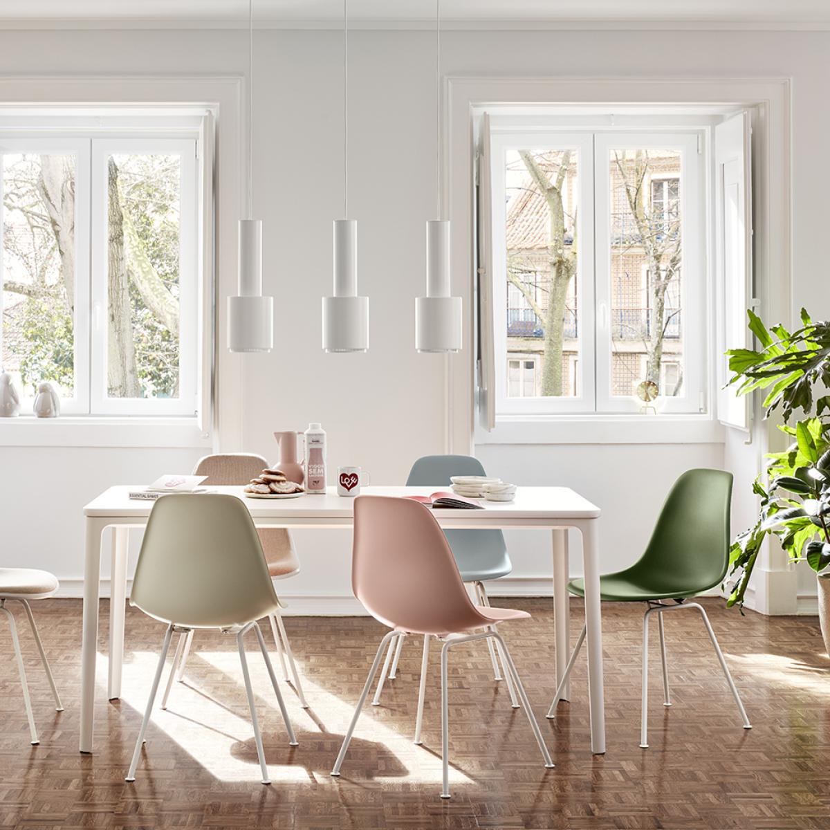 The DSX Plastic Side Chair by Charles and Ray Eames for Vitra is the most understated piece from the Plastic Chair Collection, refreshed with white powder coating for 2020.An instantly recognisable piece, the chair features an organically shaped, dyed-through polypropylene shell which rests upon a chrome tubular steel base, complete with rubber shock mounts for support and stability. Designed in 1950, the chair's universal shape led to its legendary status and appeal. In continual development for the modern user, Vitra revised the geometry of the seat to achieve optimal ergonomics and comfort.