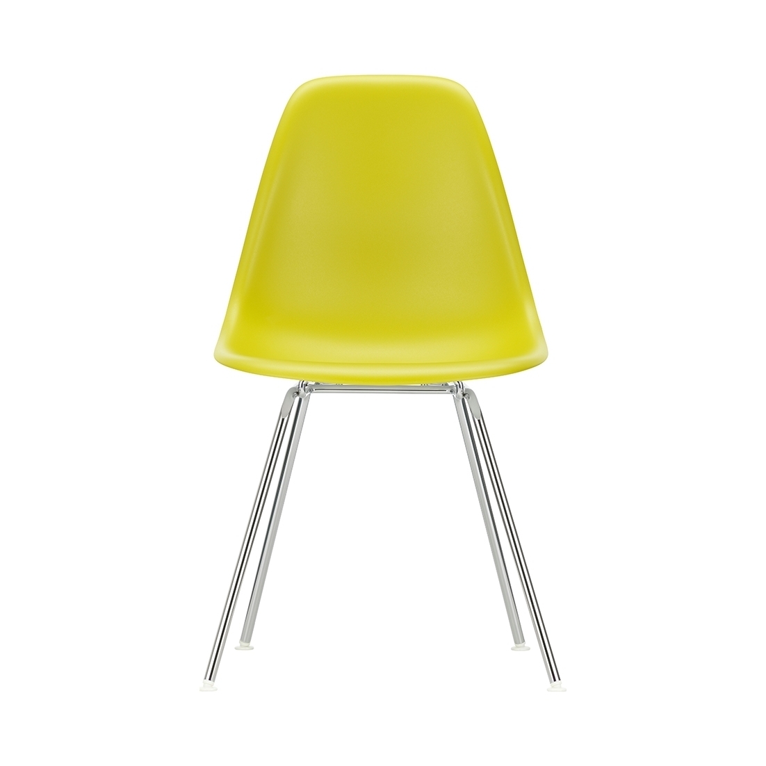 Presented in a mustard-yellow hue, Charles and Ray Eames' DSX Plastic Side Chair for Vitra features a chrome base and is the most understated piece from the Plastic Chair Collection. Originally launched in 1950, the collection introduced the idea of the multifunctional chair, featuring shells that could be combined with a variety of bases, and soon became one of the best-known furniture pieces of the twentieth century. Now referred to as 'The Chair of a Century', the DSX Chair's shell is an organically-shaped, dyed-through polypropylene which rests upon a chrome tubular steel base and features rubber shock mounts to support longer periods of sitting down. In continual development for the modern user, Vitra has revised the geometry of the seat to achieve optimum ergonomics and comfort.