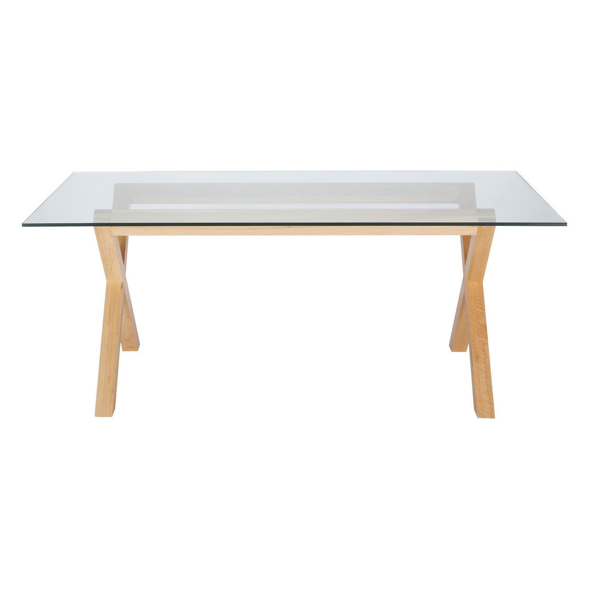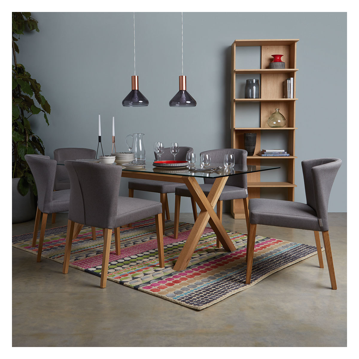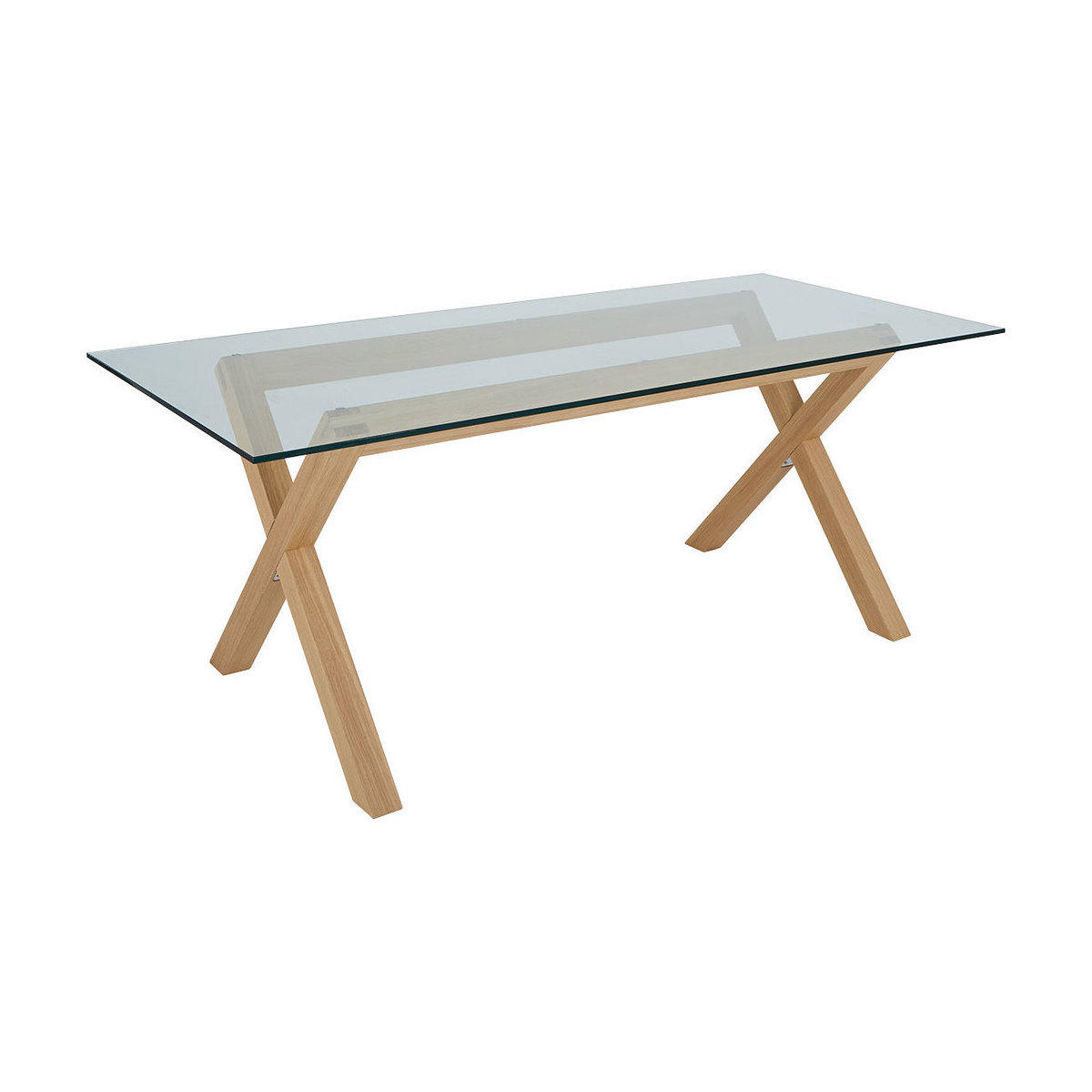 The contemporary, Dublin 4 seater oak and glass dining table adds a sense of space to a room, thanks to its simple, clean-lined cross frame and bevelled edge clear glass top. The wood and glass mix of material complements a traditional or contemporary dining room and can also be used as a desk in the home office. Designed by and exclusive to Habitat, Dublin is available in various sizes and in a walnut finish.