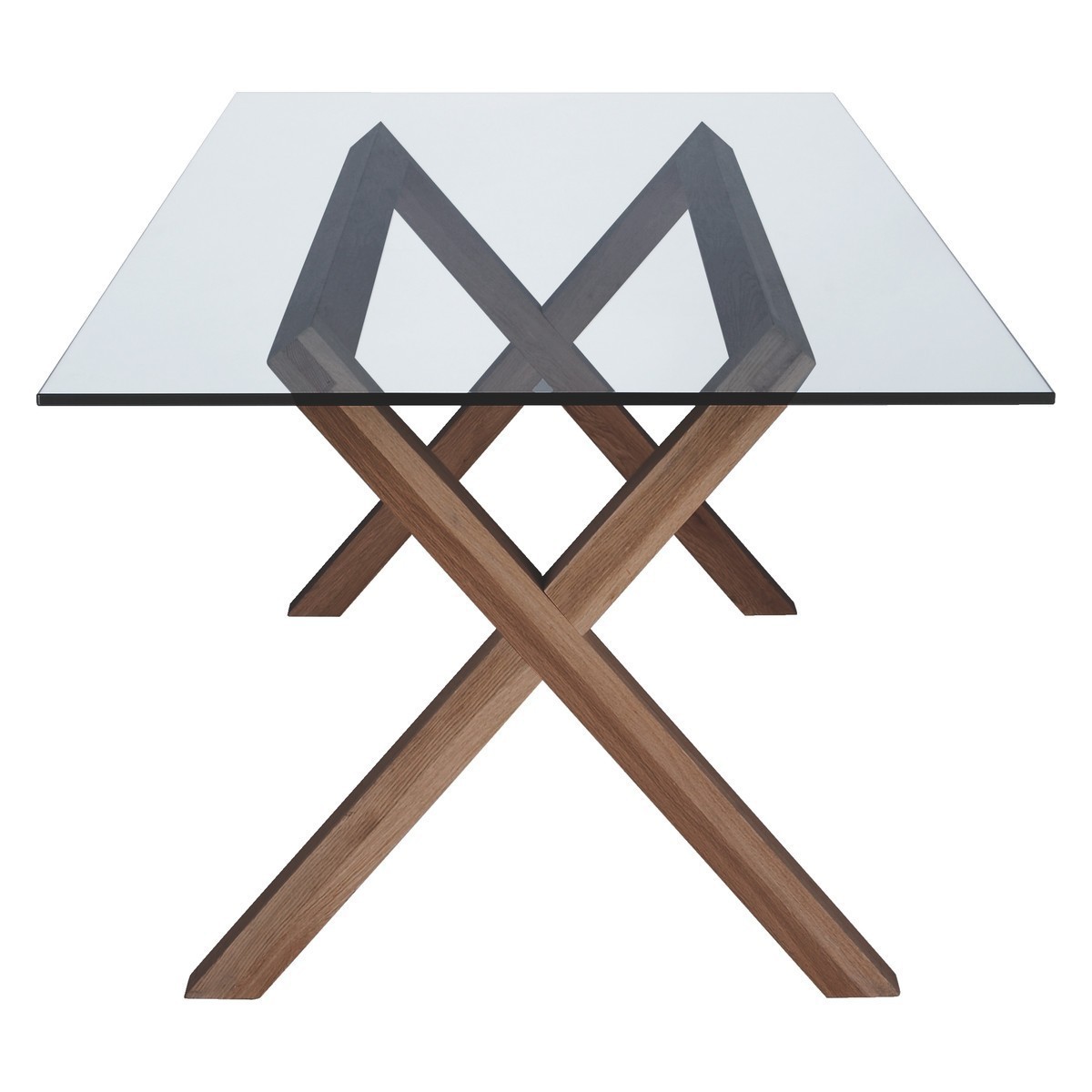 The contemporary, Dublin 6 seater walnut stained oak and glass dining table adds a sense of space to a room, thanks to its simple, clean-lined cross frame and bevelled edge clear glass top.;The wood and glass mix of material complements a traditional or contemporary dining room and can also be used as a desk in the home office.;Designed by and exclusive to Habitat, Dublin is available in various sizes and in oak.