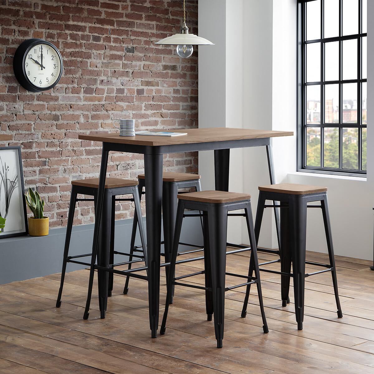 Crafted from solid elm wood and satin black powder coated steel, the Dublin bar table creates the perfect kitchen perch for up to 4 people and fits seamlessly into modern-industrial style kitchens. Product Details • Seats 4 • Rectangular shape • Solid elm wood table top • Powder coated steel frame • 12 month manufacterers guarantee. Product Composition - 90% Solid elm Wood & 10% Powder Coated Steel. Product Dimensions - 60 cm x 120 cm x 106 cm , Weight - 23 KGFloor Clearance: 102cm. Package Dimensions - 123 cm x 63 cm x 10.5 cm, Weight 24.5 kg. Please note: this product cannot be be delivered to all Offshore Islands Northern Ireland or Republic of Ireland. This product will be dispatched by one of our trusted suppliers. You’ll be contacted by their selected courier about your delivery.