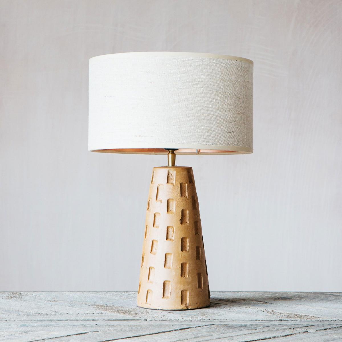 A handmade terracotta lamp base with a rustic indented pattern, style with a serene linen shade for a natural aesthetic.