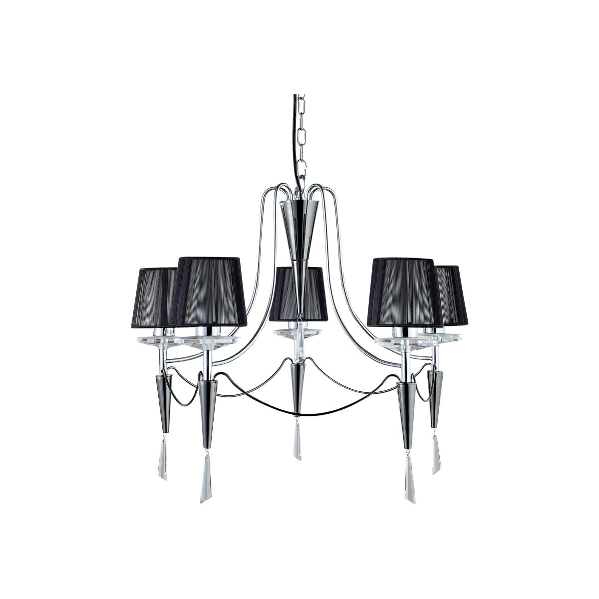 The Duchess chrome 5 light pendant with black string shades and crystal sconces is dark, sensual and will look stylish on any bedroom, living room or dining room ceiling. The five black string shades house a subtle source of light, and this pendant is adorned with elegant crystal sconces on a contemporary chrome fitting. The chain suspension of this 5 Lt pendant can easily be adjusted for different ceiling heights to set the tone for the entire room.