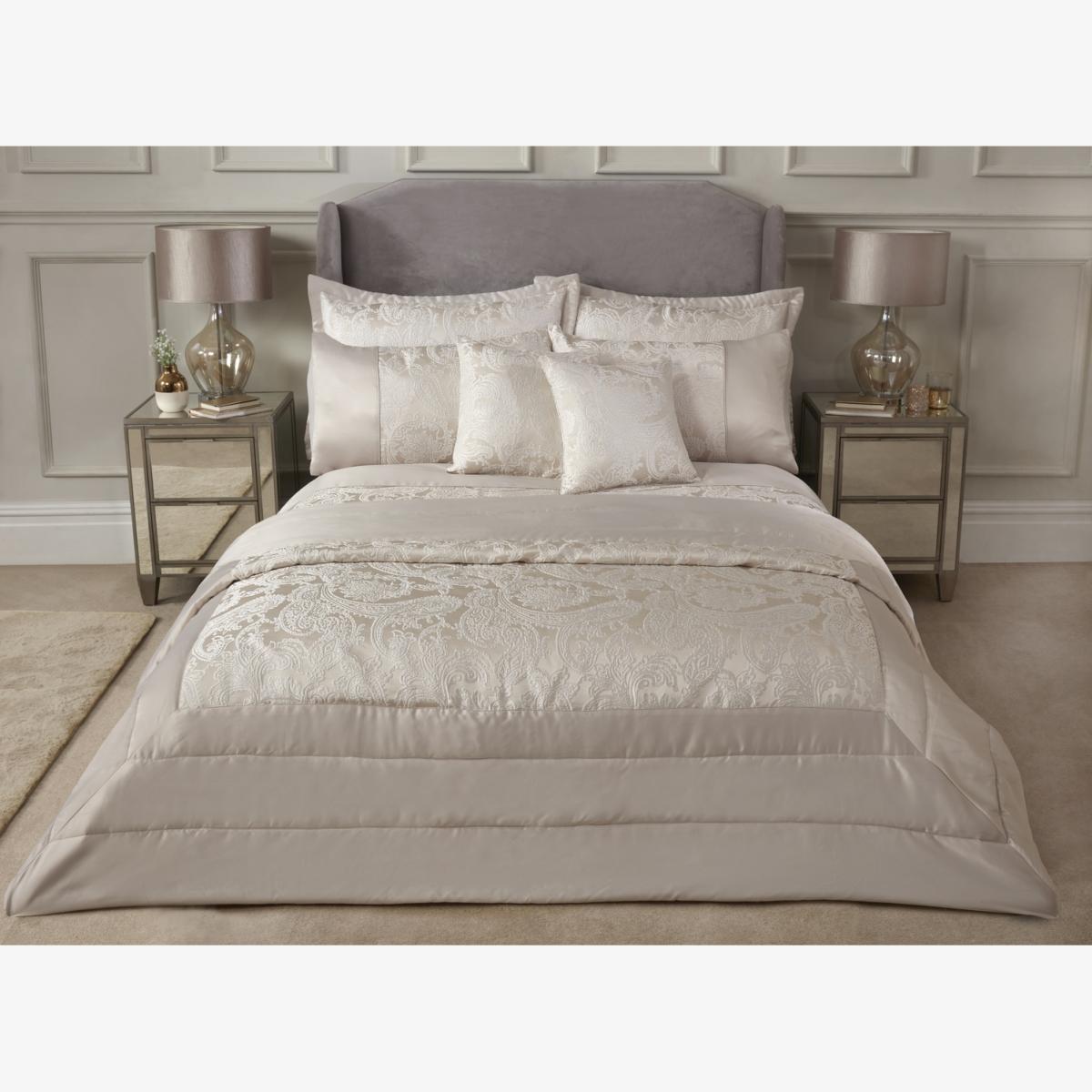 The Duchess bedspread has a luxurious soft sateen finish border detail with a central jacquard modern paisley style design. This stylish bedspread set is coloured in modern tones, with a light and whimsical traditional design. Suitable for use on a double or King size bed, this comes complete with 2 matching pillow shams to complete the look. Great to cover the whole bed and keep you warm in winter or to dress stylishly as an attractive bed runner. With polyester fill quilting detail for added comfort and warmth. Perfect for a modern or traditional home.