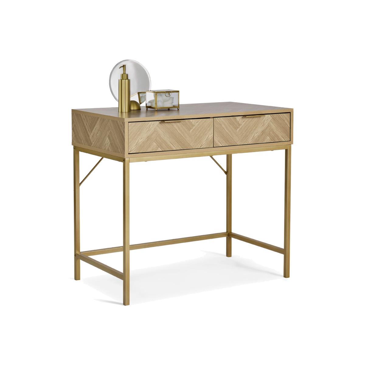 Bring a touch of timeless class to your home with the Von Haus Ducie make up table, merging traditional and contemporary details. The distinctive herringbone pattern takes inspiration from classic luxury design, with a natural wood grain effect that brings an authentic sense of depth and refinement. The champagne gold detailing oozes an understated opulence, elevating your space with a subtle chic touch. More than an aesthetic furniture piece, this storage desk is also a great practical solution for all your books, stationery, and cosmetics. The two drawers measure H8 x W35.4 x D39cm, with a 5kg weight capacity each for decluttering your bedroom, hallway, or home office. With a matching nightstand and chest of drawers, browse the Ducie range to coordinate your space in luxe chic style.