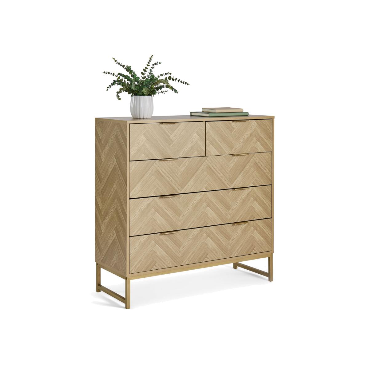 Bring a touch of timeless class to your home with the Von Haus Ducie chest of drawers, merging traditional and contemporary details. The distinctive herringbone pattern is inspired by classic luxury design, with a natural wood grain effect that brings an authentic sense of depth and refinement. The champagne gold detailing oozes an understated opulence, elevating your space with a subtle chic touch. More than an aesthetic furniture piece, this bedroom chest is also a great practical solution for all your spare clothes. Featuring three wide drawers, two smaller drawers, and a large top surface, create extra wardrobe storage whilst displaying your favourite trinkets on top. With a matching desk and nightstand, browse the Ducie range to coordinate your space in luxe chic style.