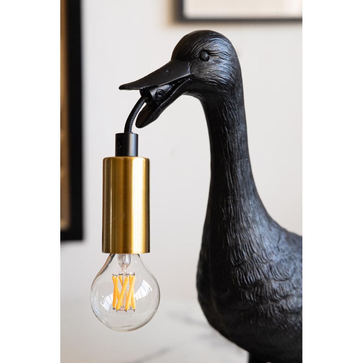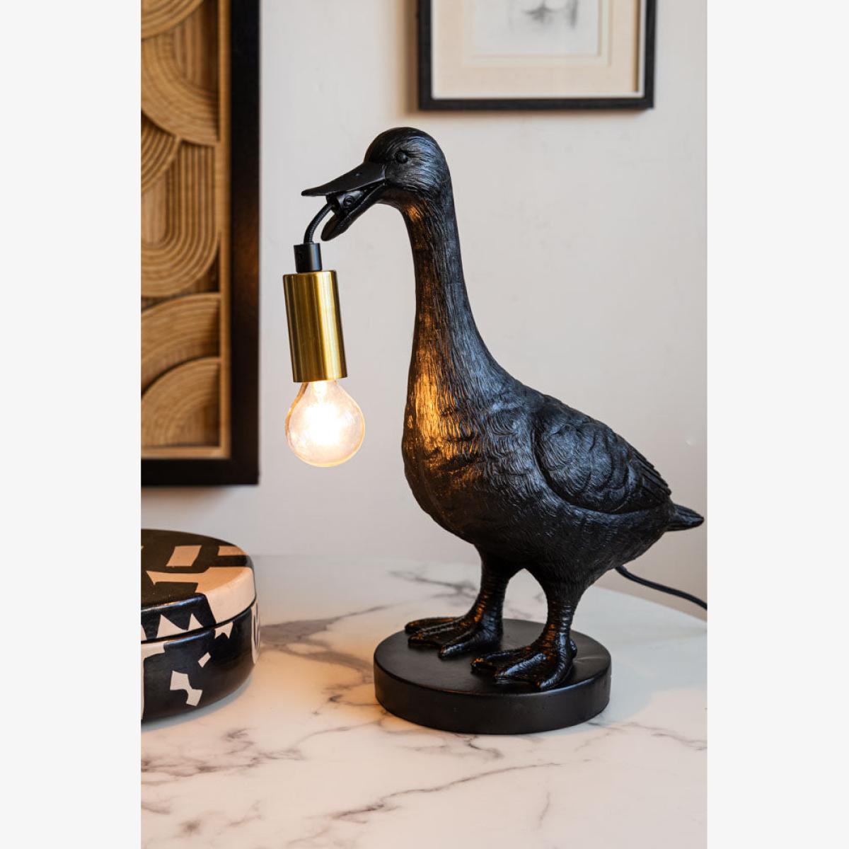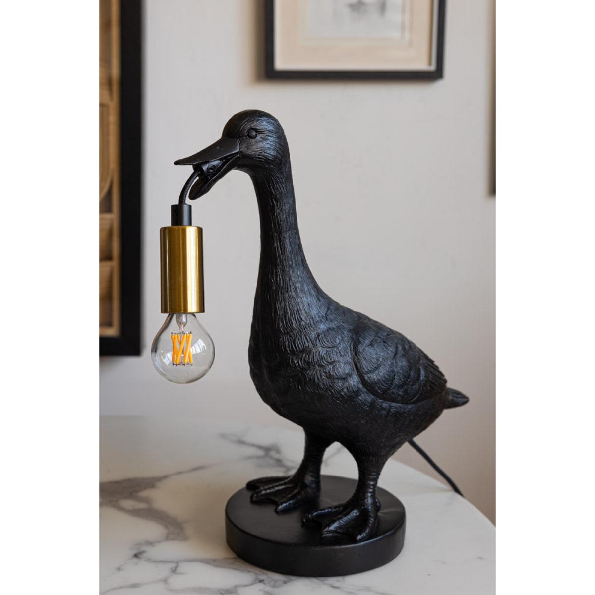 <!--td --> Light up your life with the charming Duck Table Lamp. This adorable lamp features a black model of a duck, cleverly designed to hold a lightbulb adapter in its mouth, meaning when you pop a lightbulb in it, it gives the impression that the duck is holding the light just for you. While the sleek black finish adds a modern touch, its playful design brings a sense of playful curiosity to any room. Simply attach a light bulb to the cabled light, and enjoy the inviting, friendly glow that your new duck offers. Perfect for the bedroom or living room, it adds personality without overwhelming your décor. - Duck Table Lamp - Measures: H36.5cm x W15cm x D32cm - Material: Resin with a metal lamp holder- Bulb: E14 - Rating: IP20 - Cable Length: 175cm - Bulb Not Included