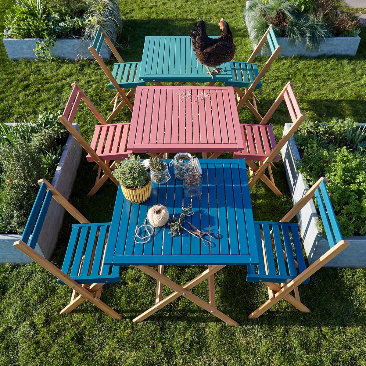 Dudena garden set. Featuring a square table plus 2 chairs, this garden set is perfect for creating an intimate dining space for lunch in the sun. The chairs and table are quick to fold down for easy storage.