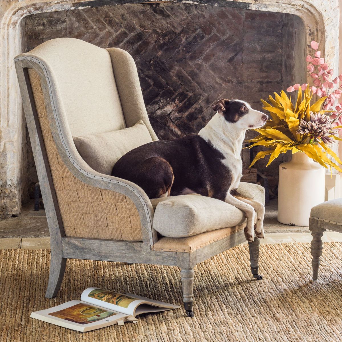 A classic armchair upholstered in lightweight linen, with a comfortable, deep seat and cascading arms. Shapely castor wheels and elegant rivet detailing complete this French-inspired chair. With a cerused wood frame, this is a timeless piece.