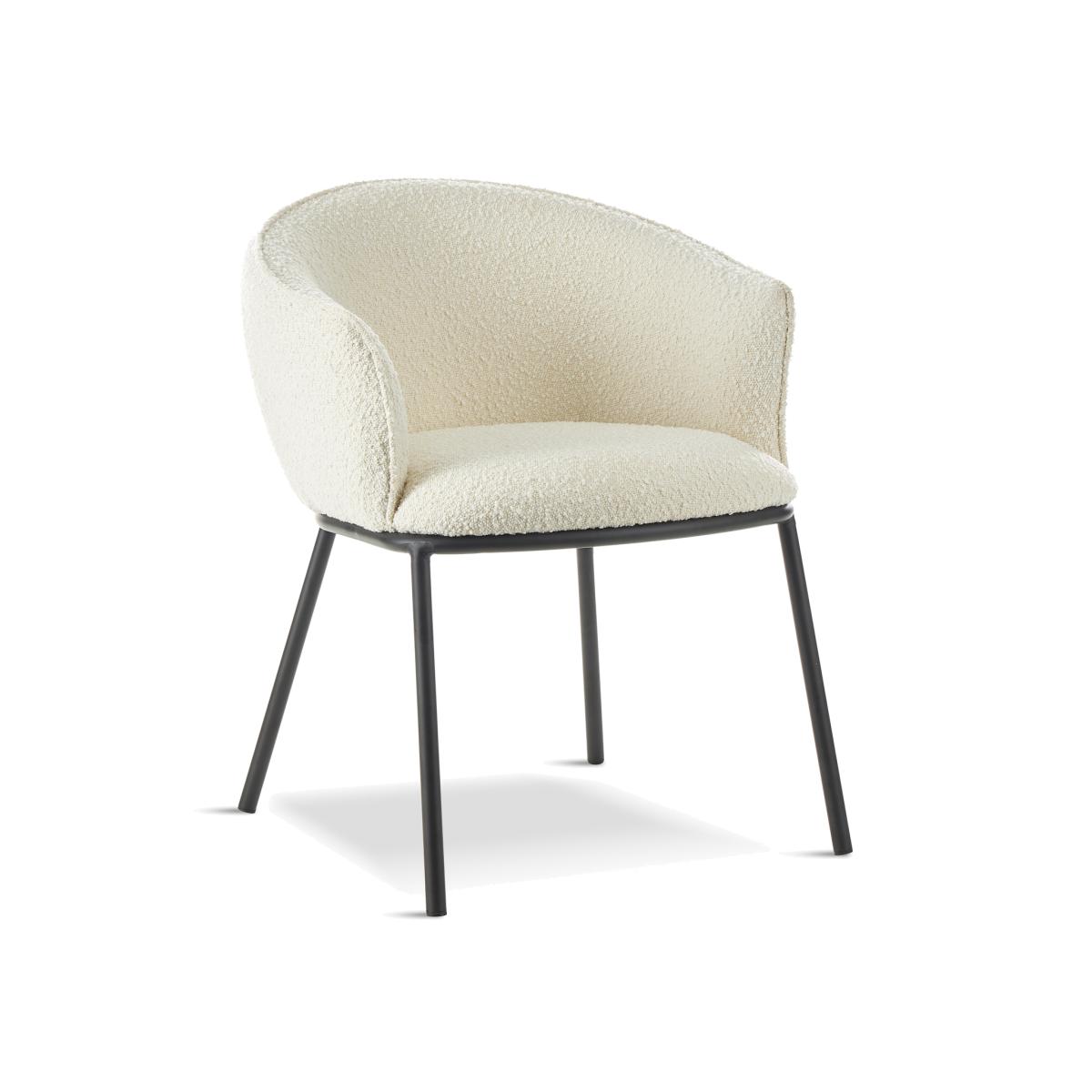 I love the white boucle chair for its neat, curved shape and soft, textured upholstery - it brings a cosy, modern feel without overwhelming a space. The slim black legs give it a light appearance that works well in Scandi, industrial or contemporary settings. Pair it with a light oak or marble-top table to balance warmth and cool tones, or mix in a bold cushion for a splash of colour. Its compact size makes it perfect for small dining nooks or as occasional seating in a home office, and the boucle fabric is easy to spot-clean.