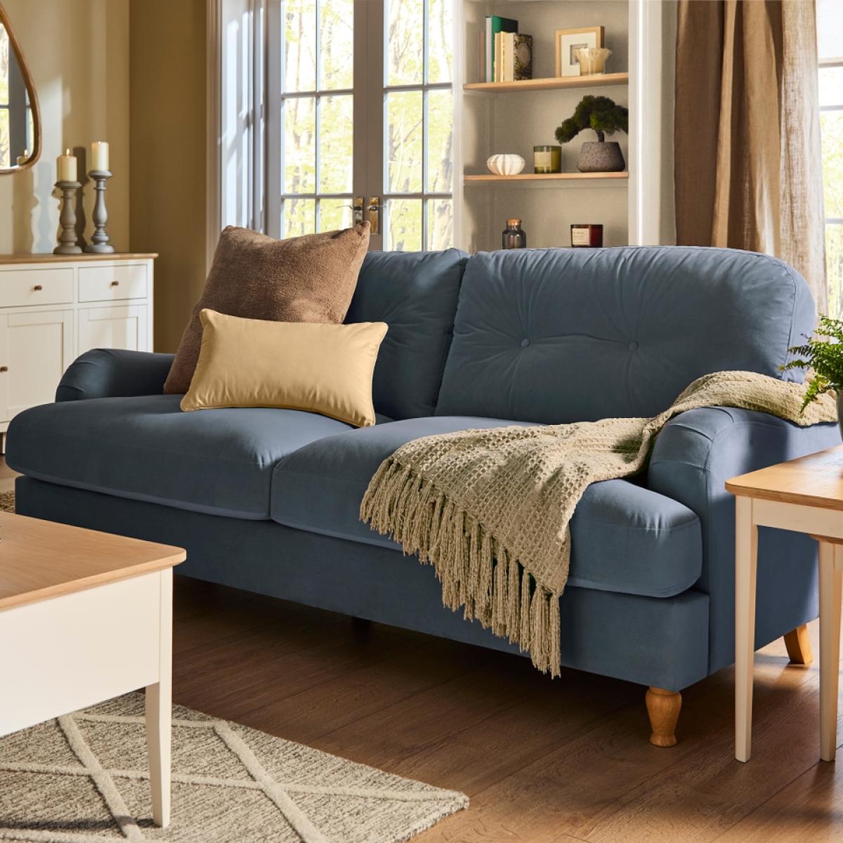 Combining classic looks, charm and unrivalled comfort, we've found the sweet spot with the Dulcie 3 seater sofa. Cuddle up to binge watch the latest box set or curl up with a cup of tea and a book in this luxurious blue sofa.